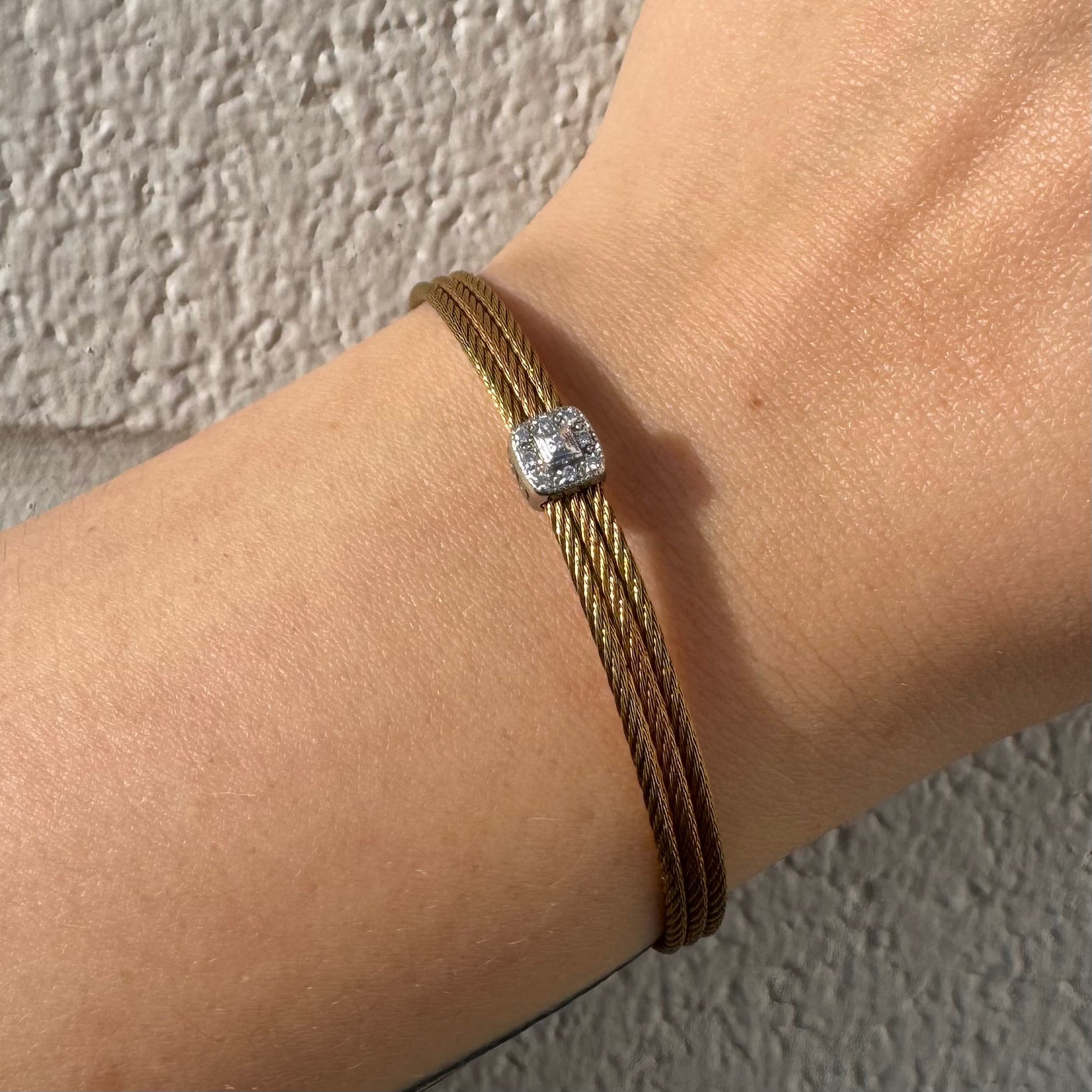 The perfect gift. Gold-tone stainless bracelet with 18K white gold station with pave set diamonds and pull back clasp. New price: $705
