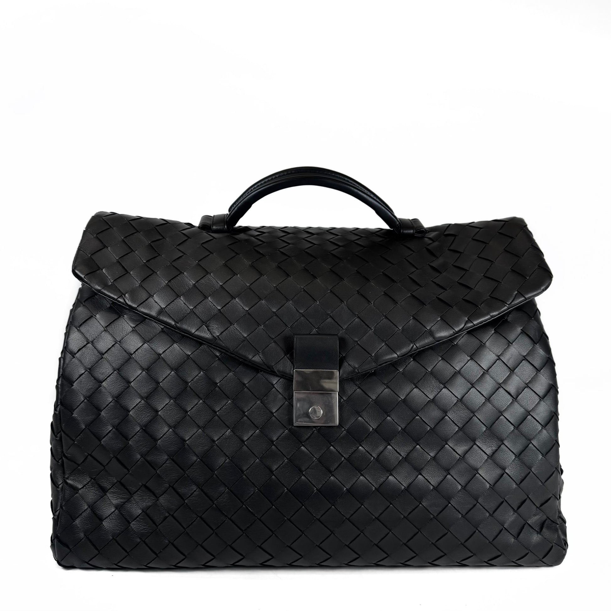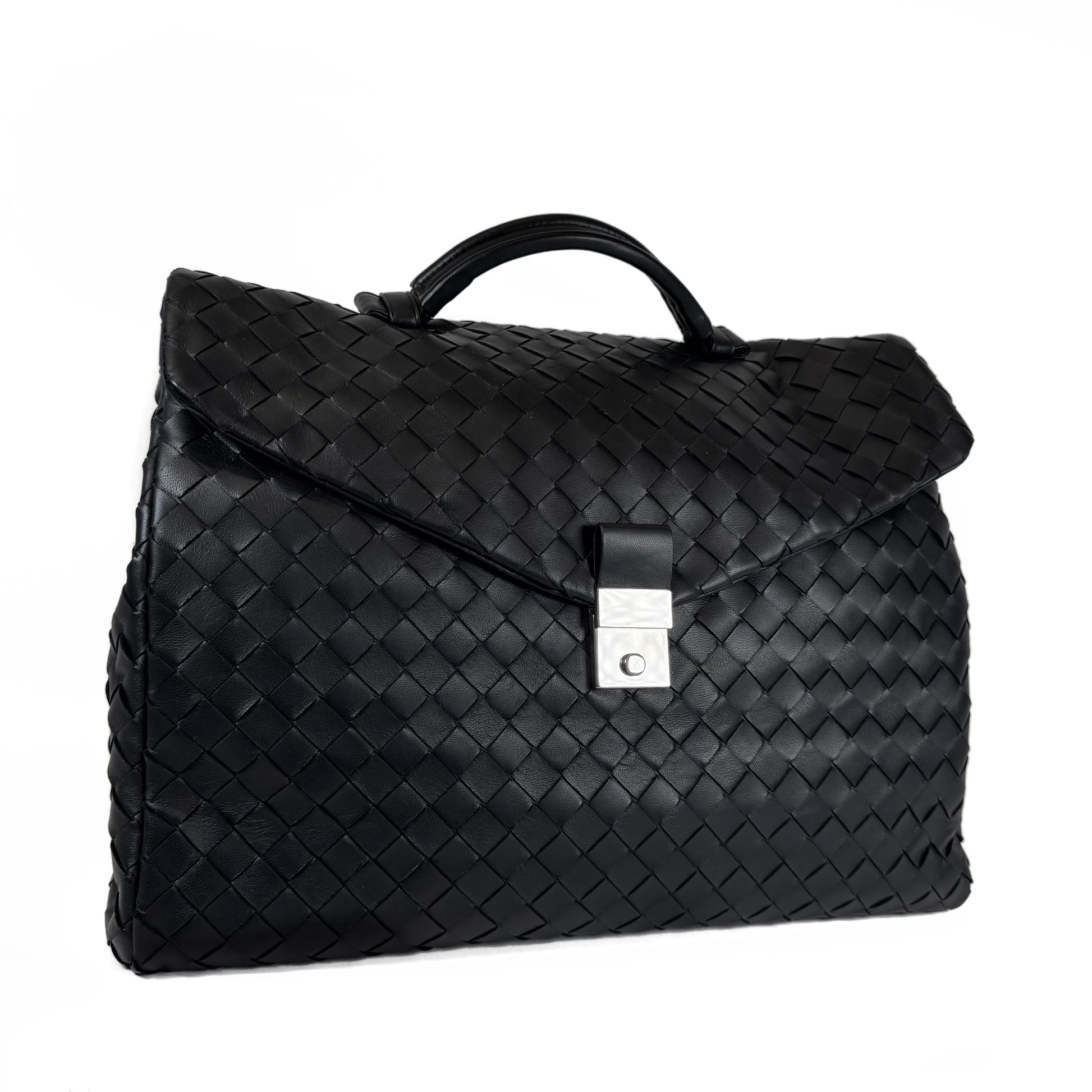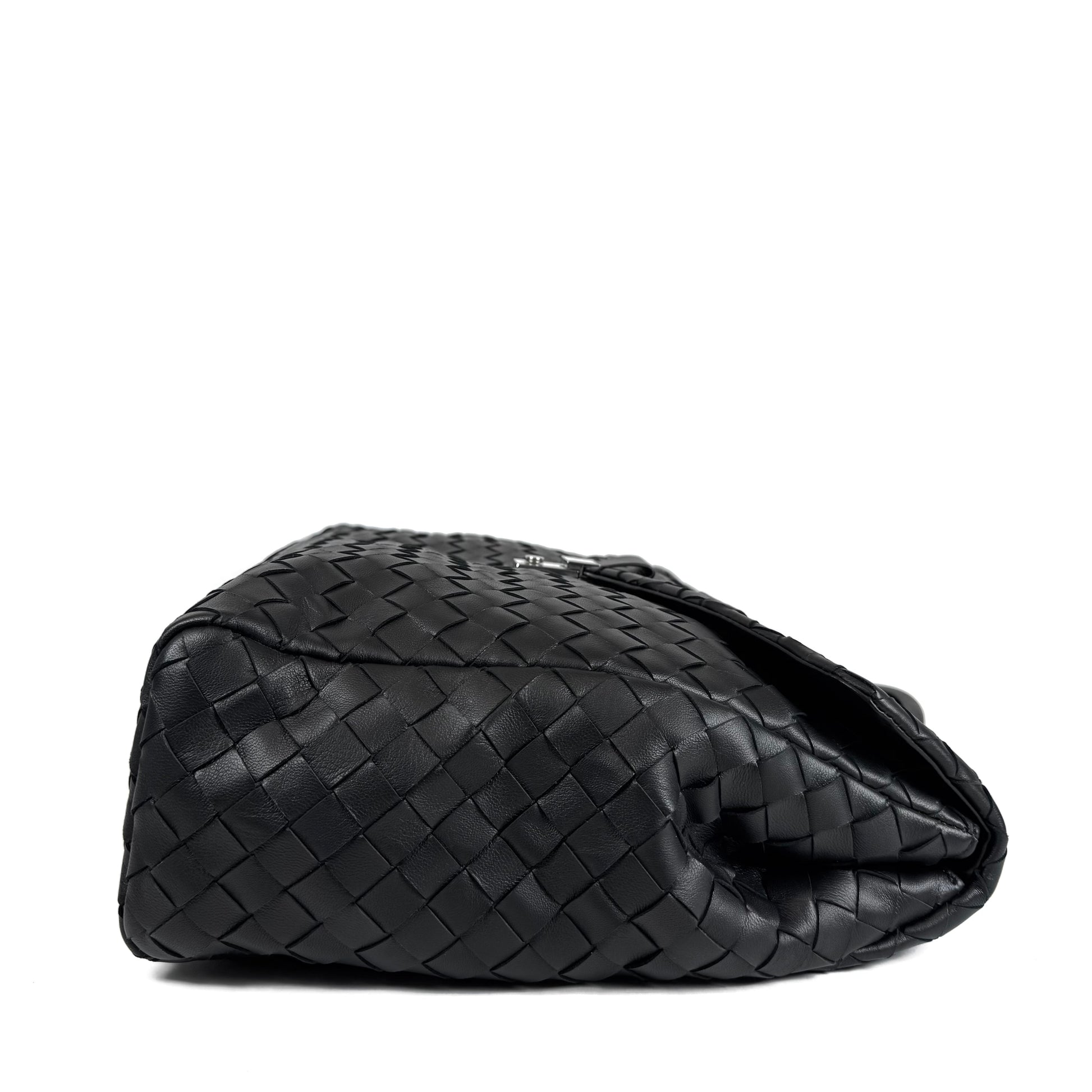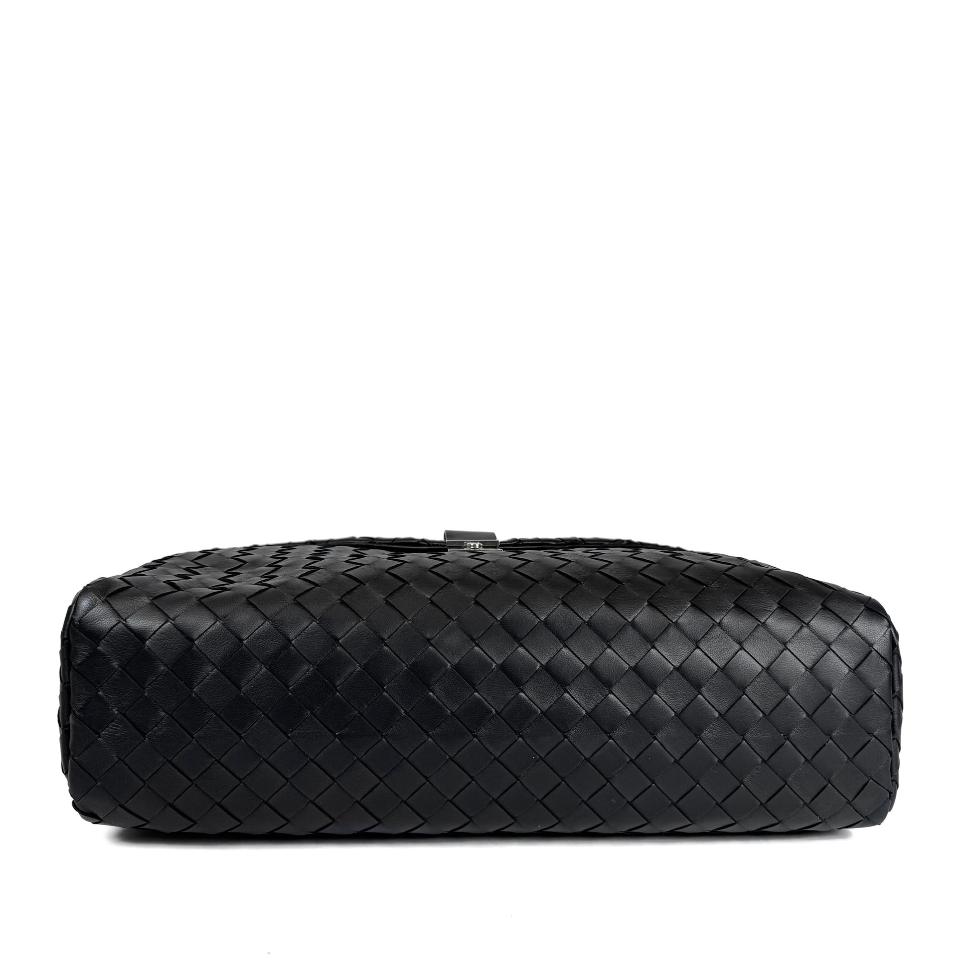 Crafted from Intrecciato leather with matte silver-tone push-lock closure, black calfskin leather interior and top handle.