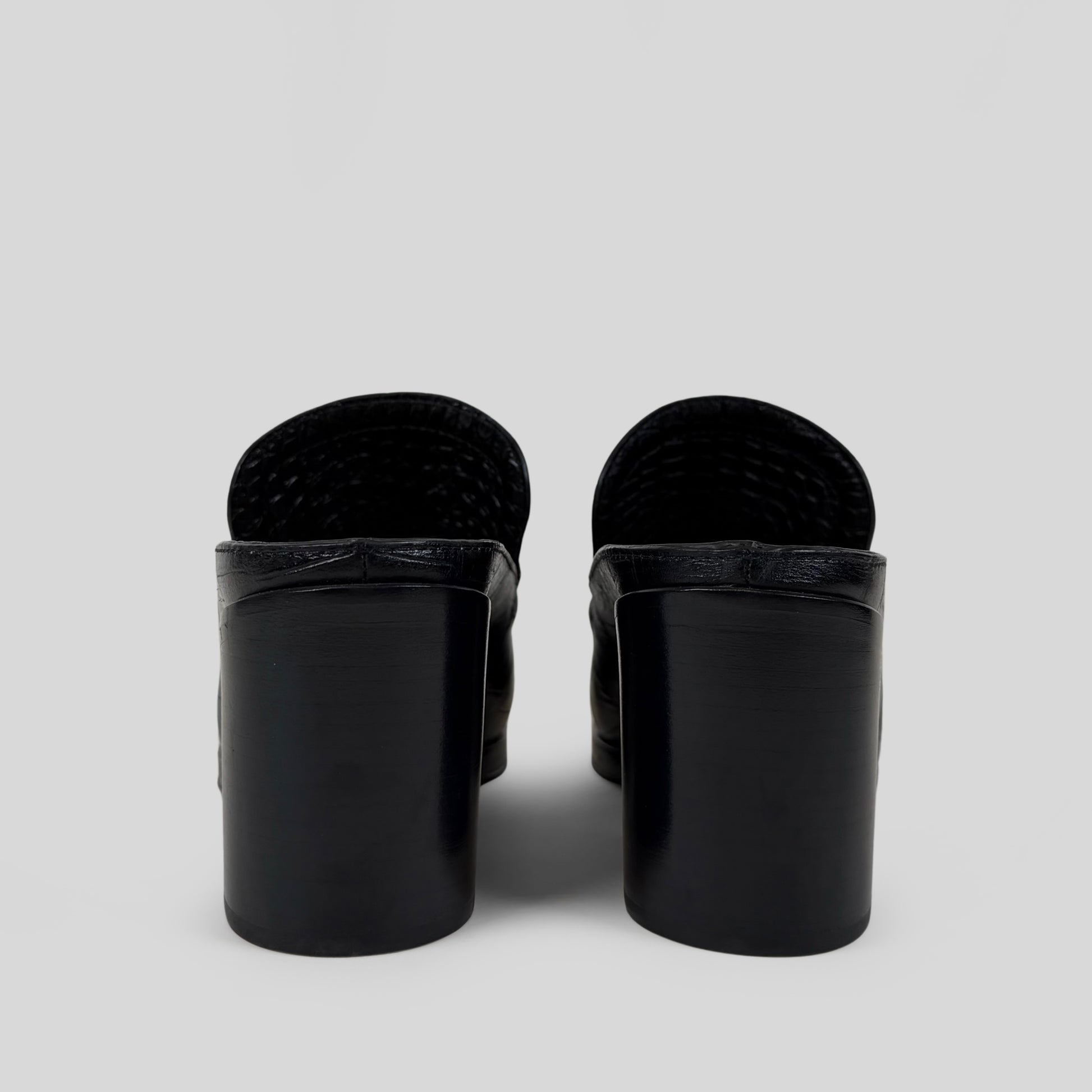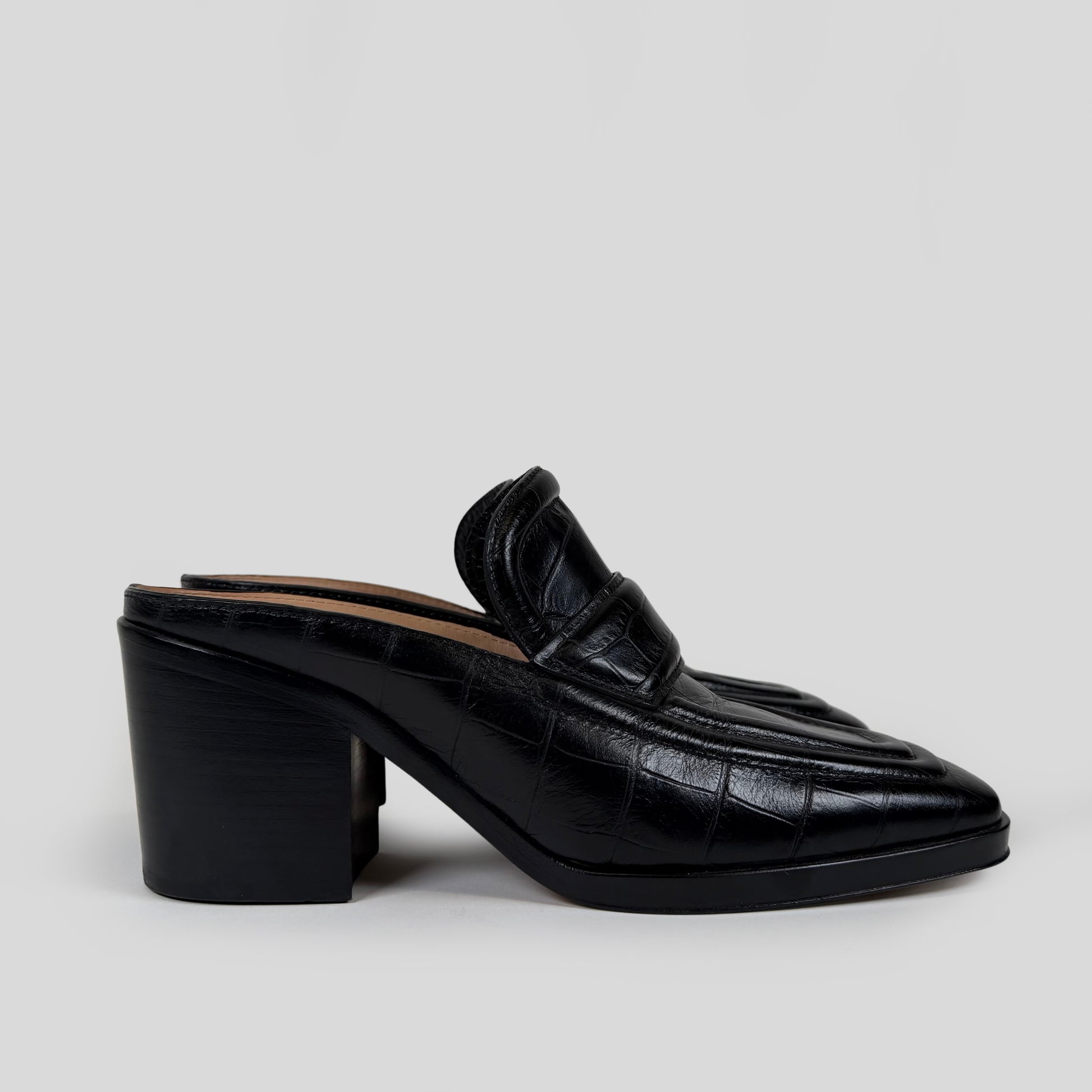 Your next pair has arrived. Crafted from calfskin leather with a crocodile embossed pattern, square-toe silhouette with a slip-on, backless design and block heel.