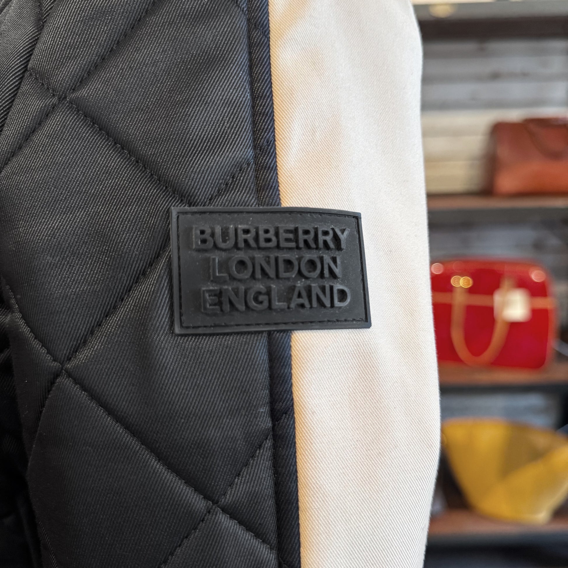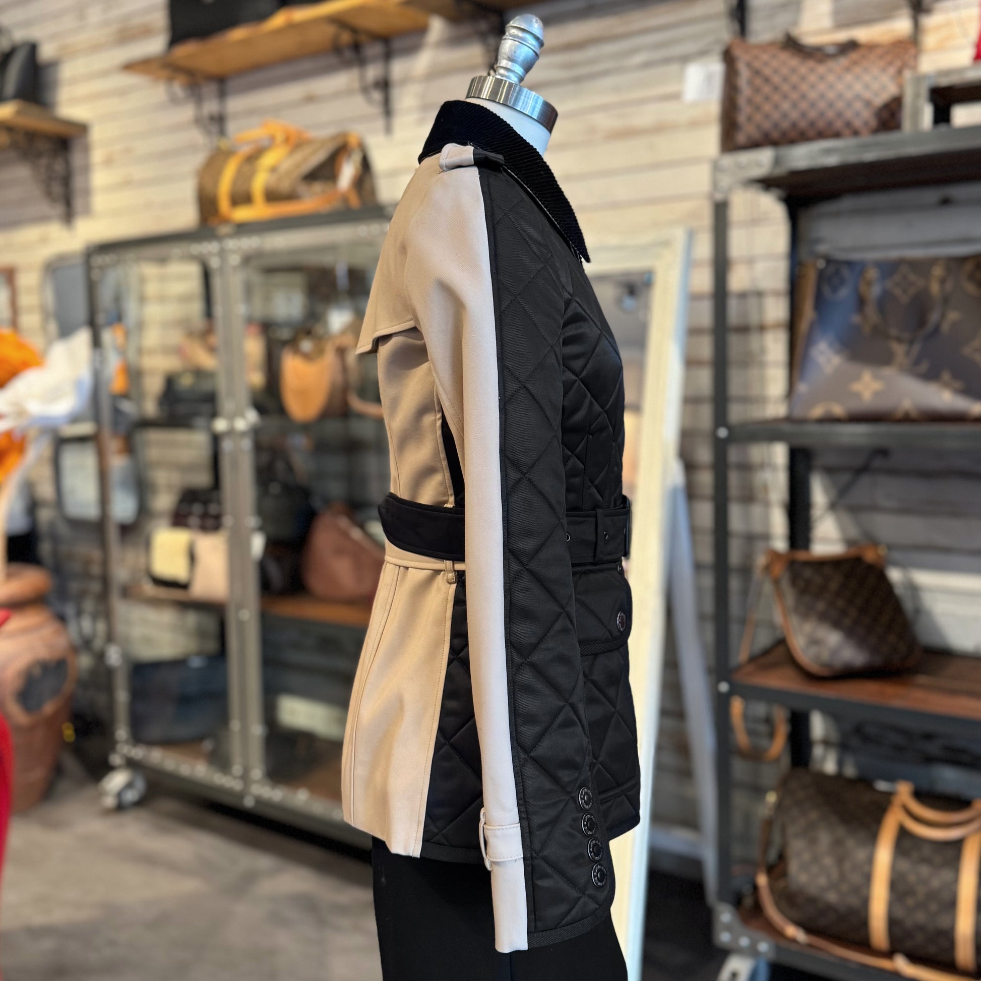Stunning! Crafted from diamond quilted lightweight black nylon and beige nylon with corduroy spread collar, zip and press-stud front closure, two front patch pockets, waist bucket belt and iconic Check lining.