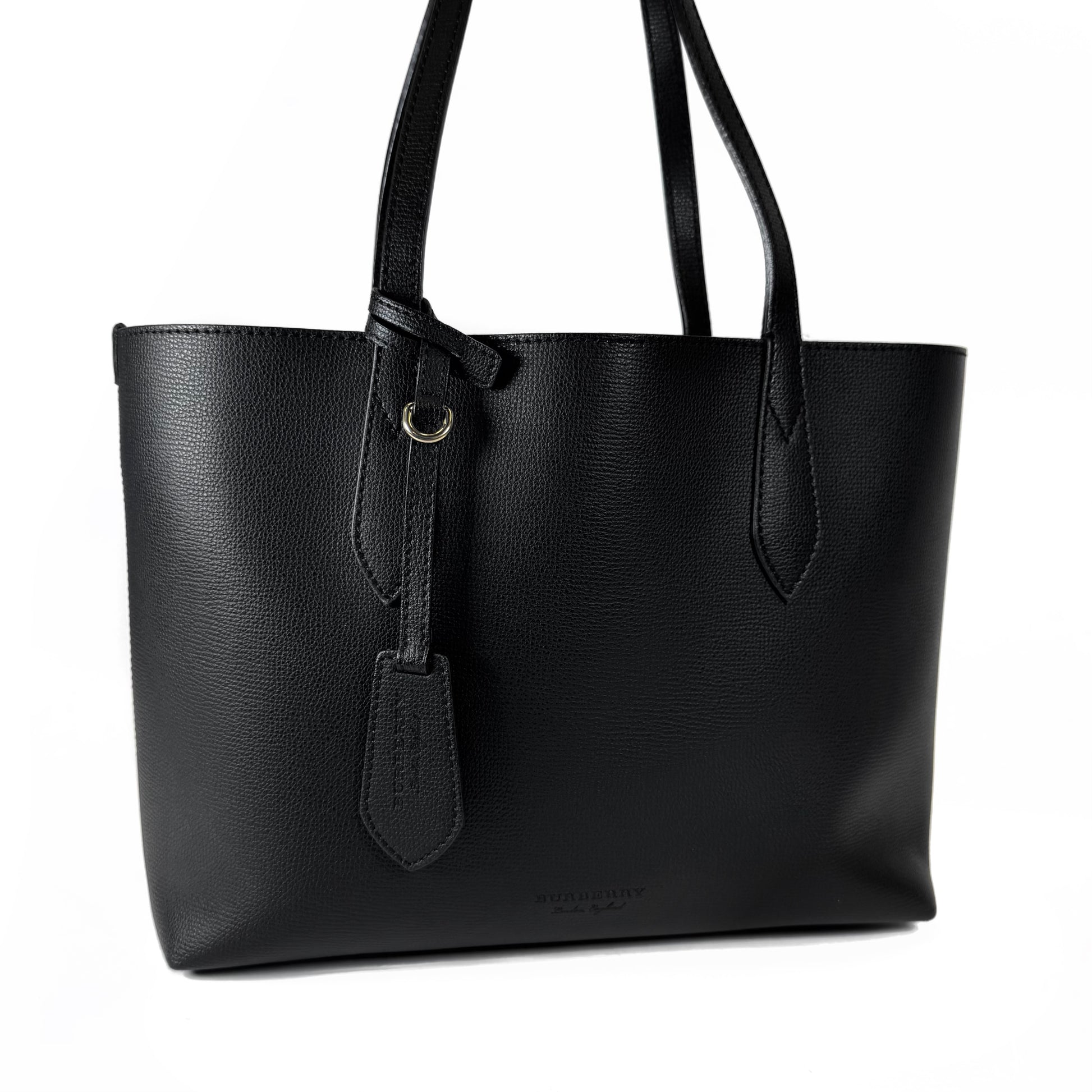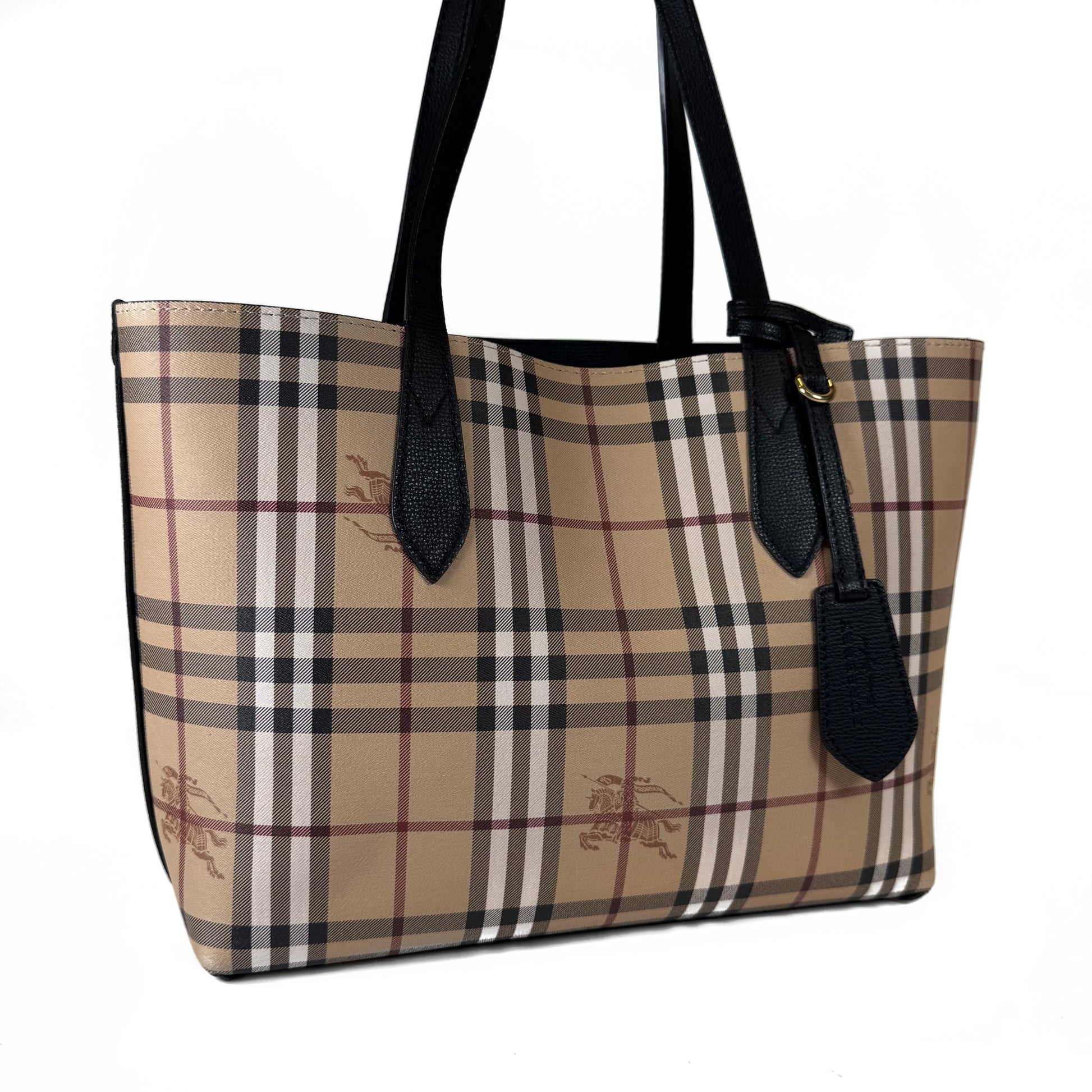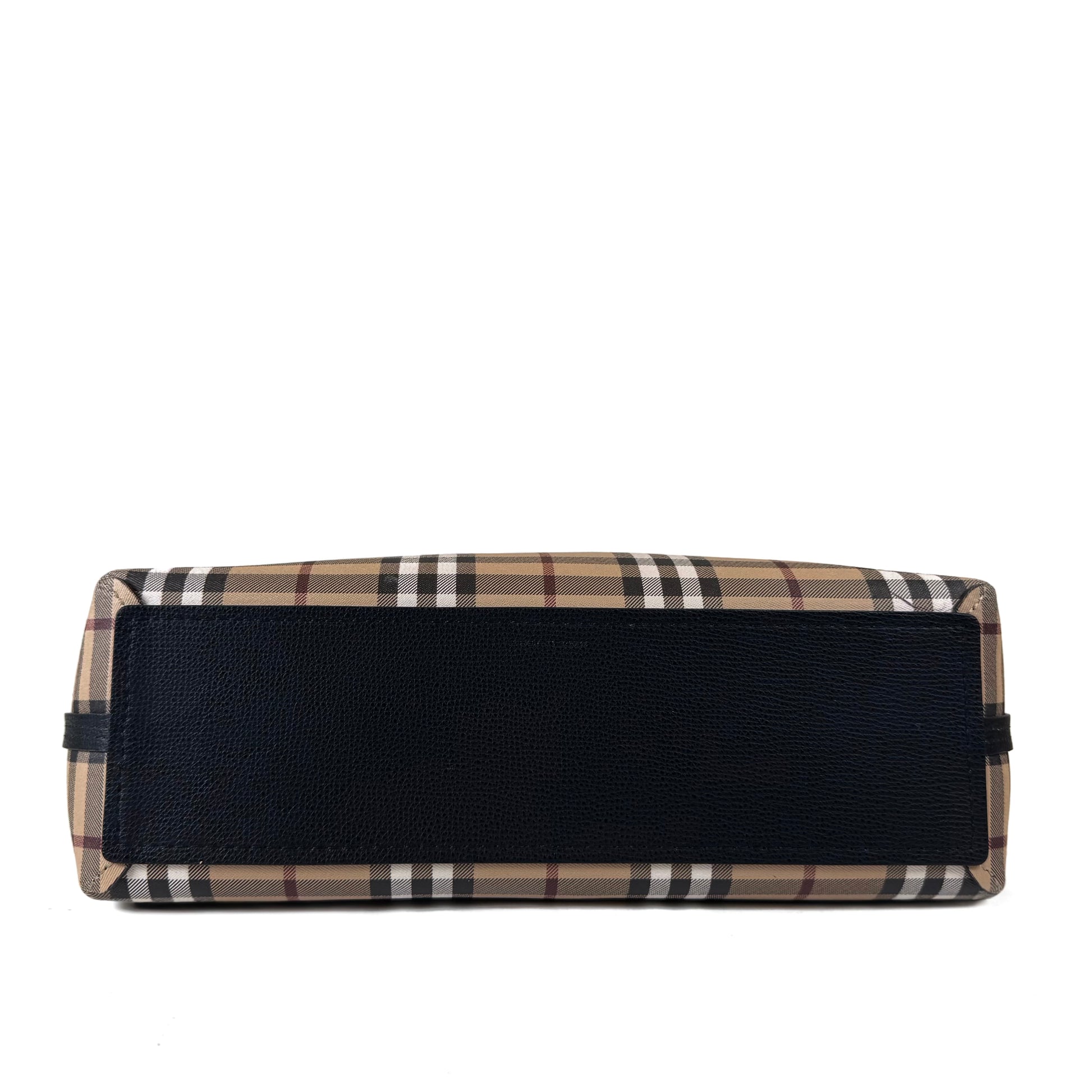 Check or black today? Crafted from signature check canvas and black grained leather with gold-tone hardware, open top, and dual flap handles. New price: $1465