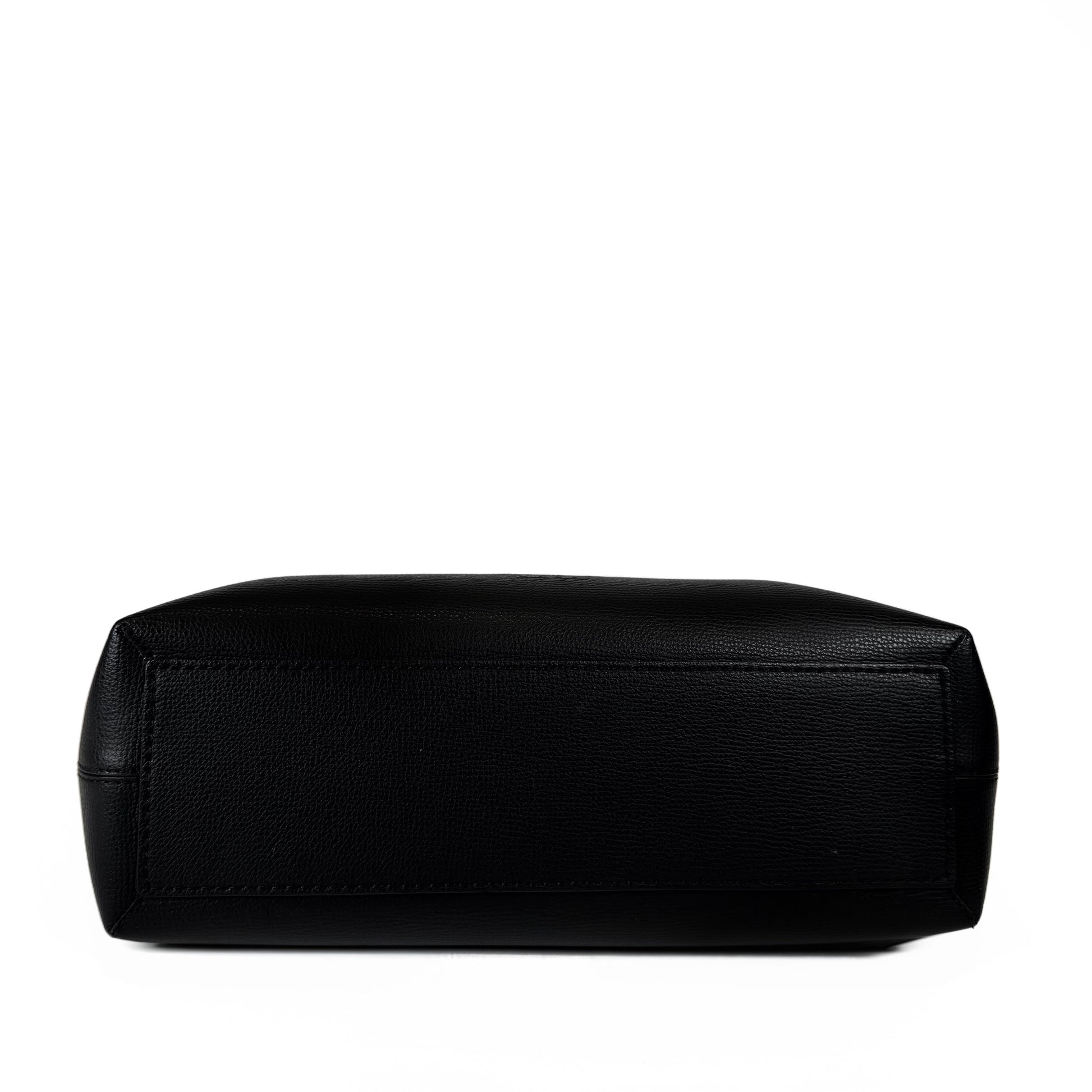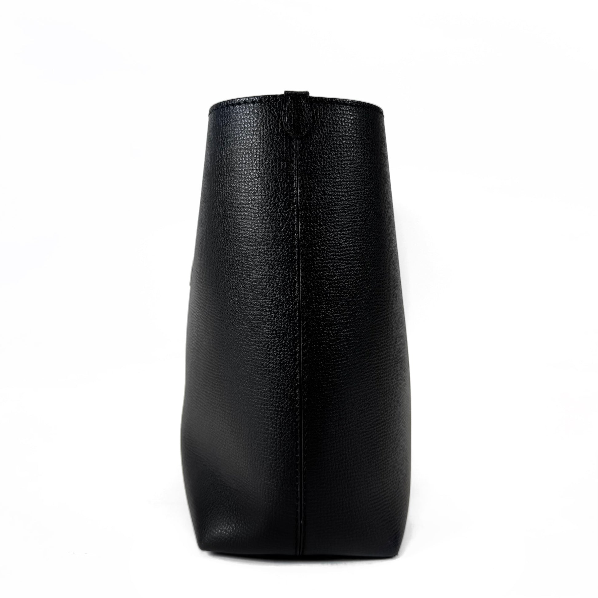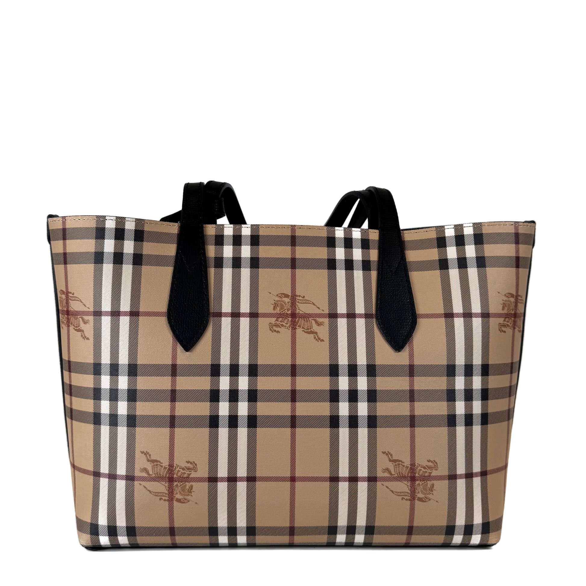 Check or black today? Crafted from signature check canvas and black grained leather with gold-tone hardware, open top, and dual flap handles. New price: $1465
