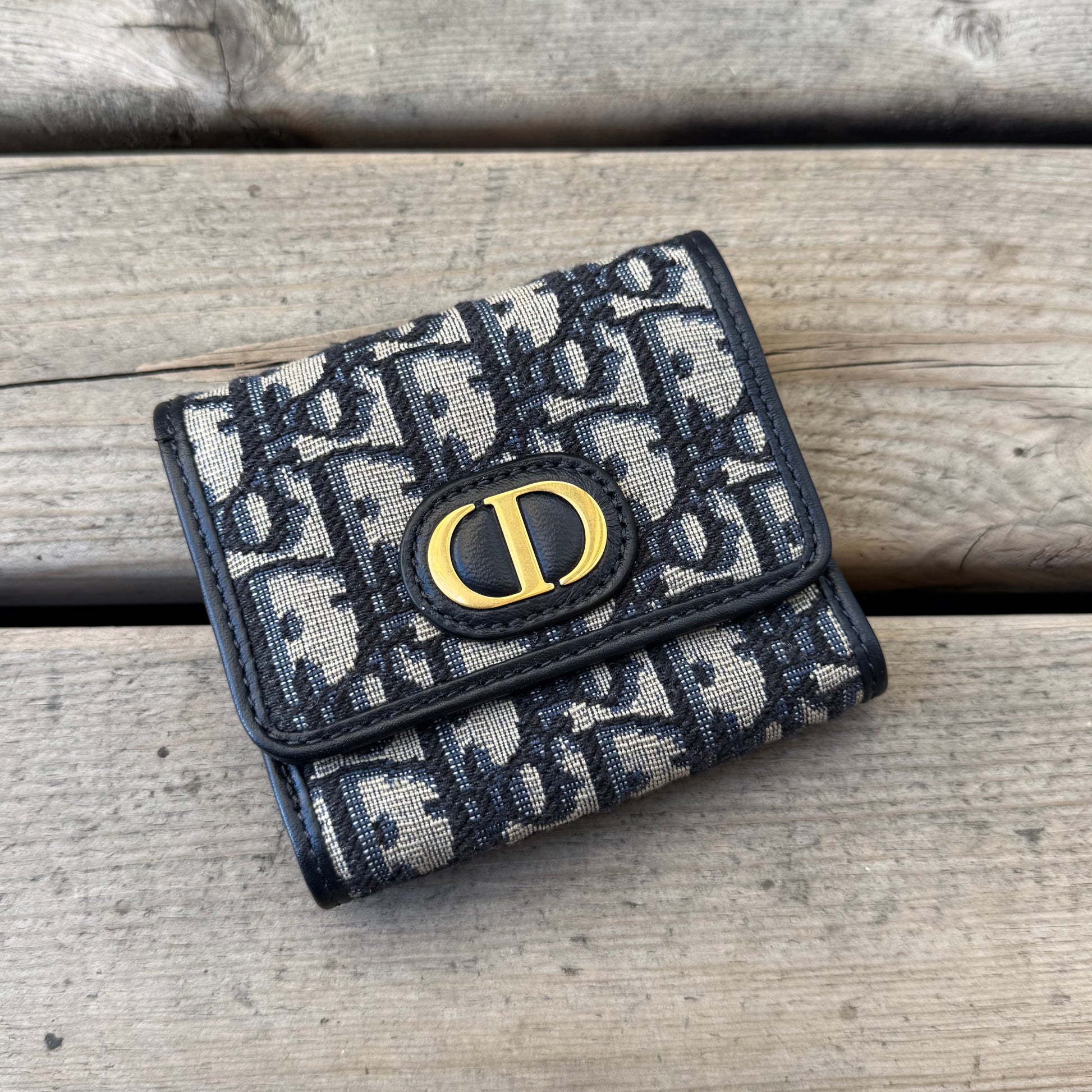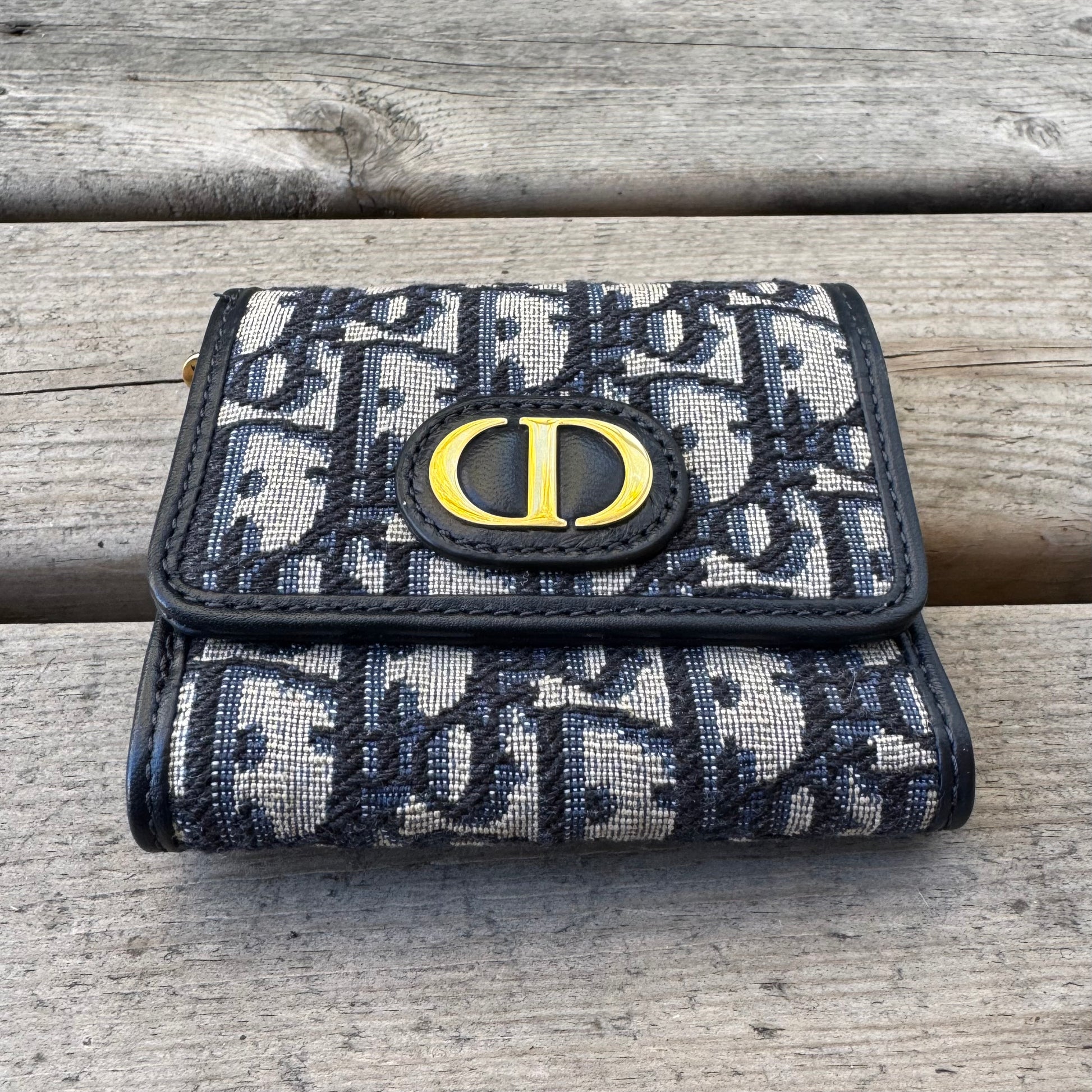 A coveted piece. Crafted from navy and beige monogram canvas with calfskin leather trim, gold-tone CD logo, leather interior with multiple card slots, zip coin and bill compartments. New price: $900