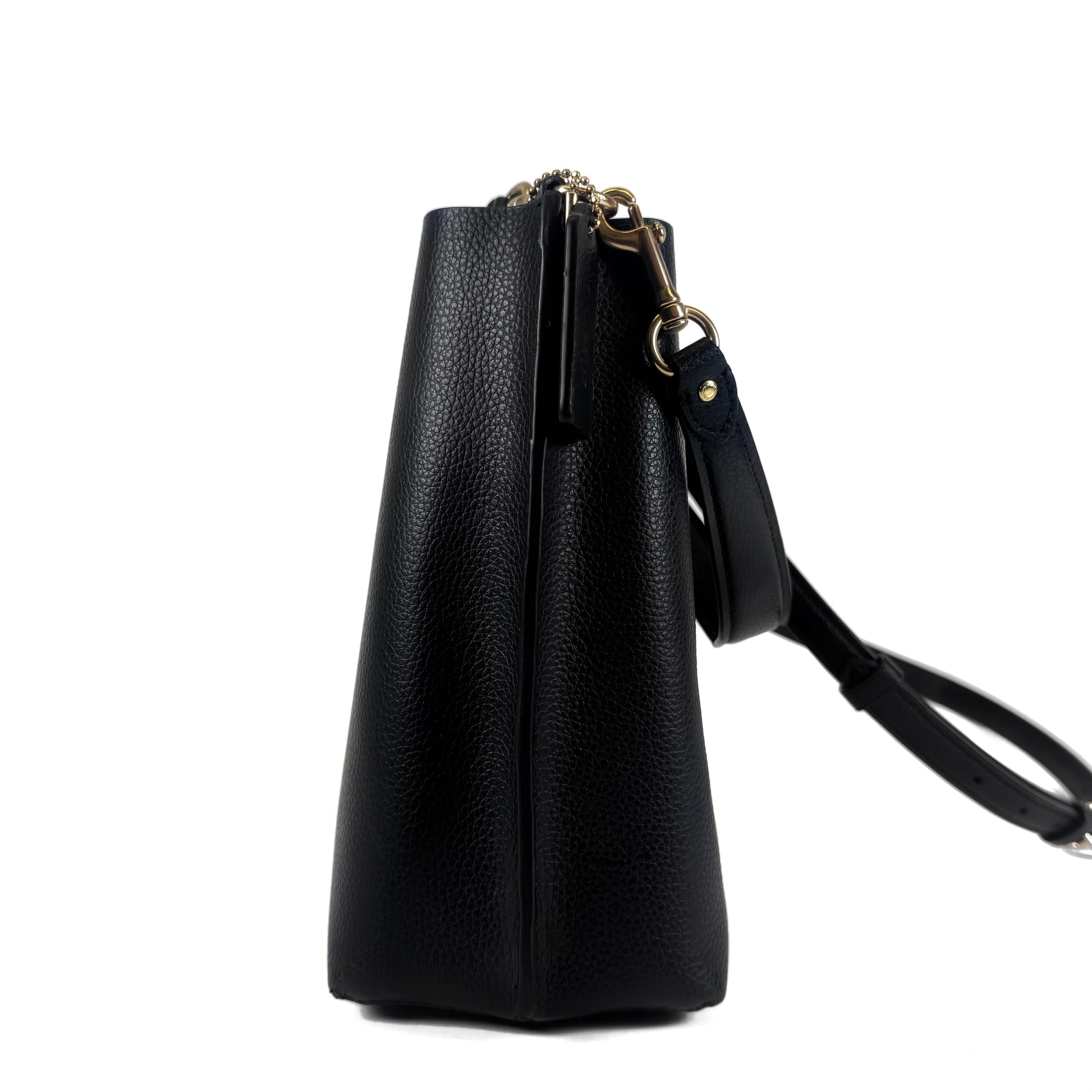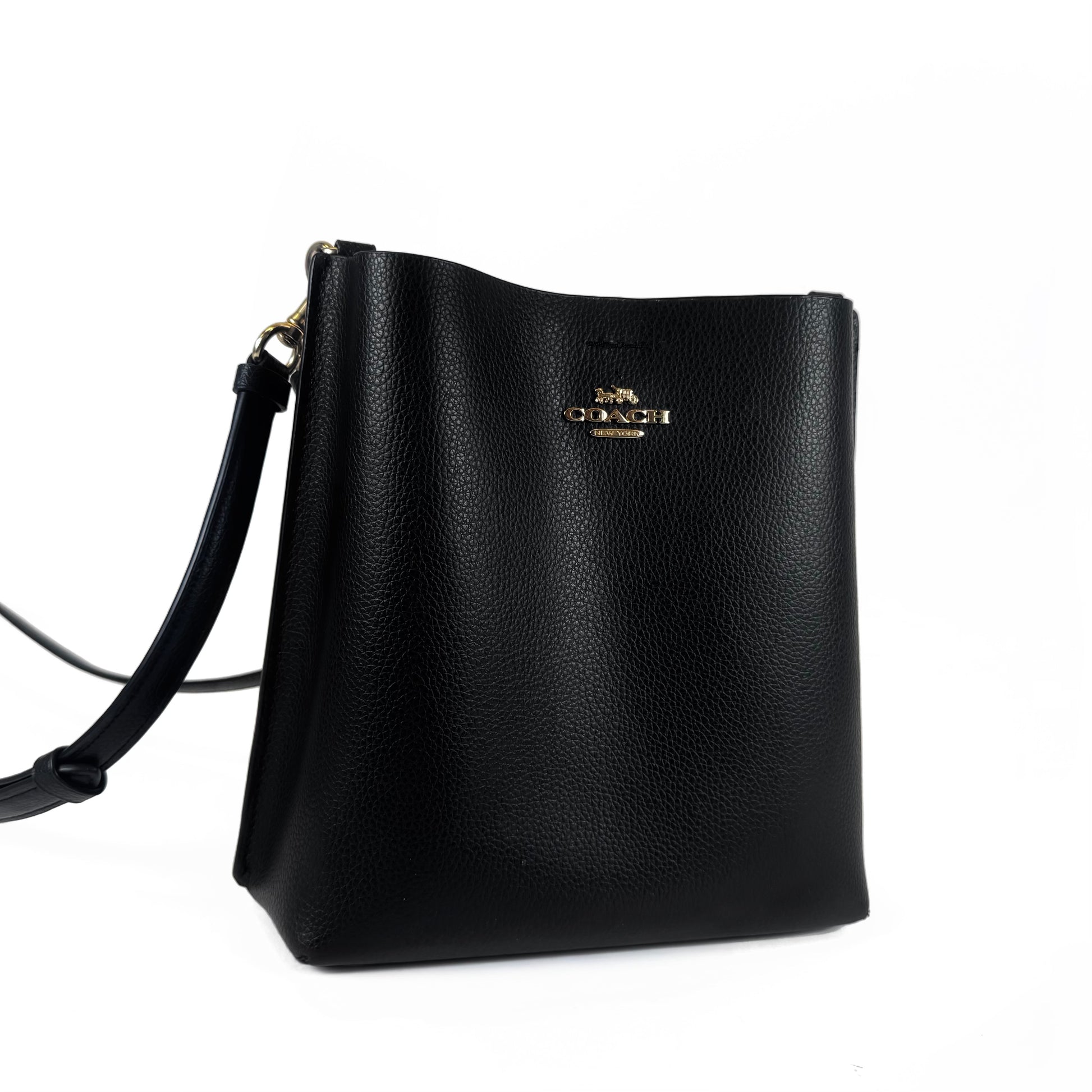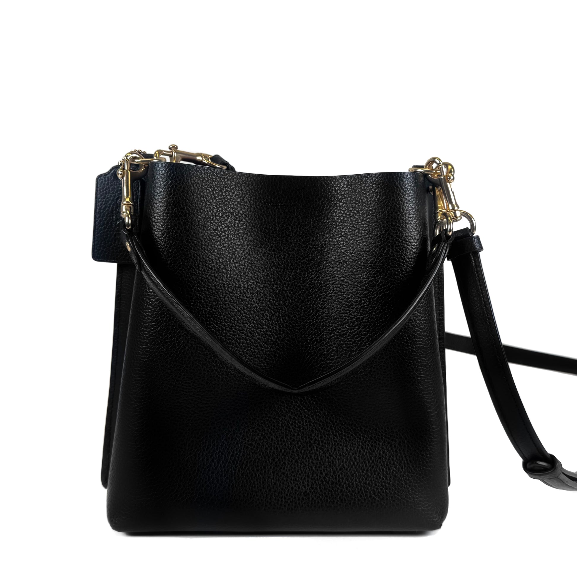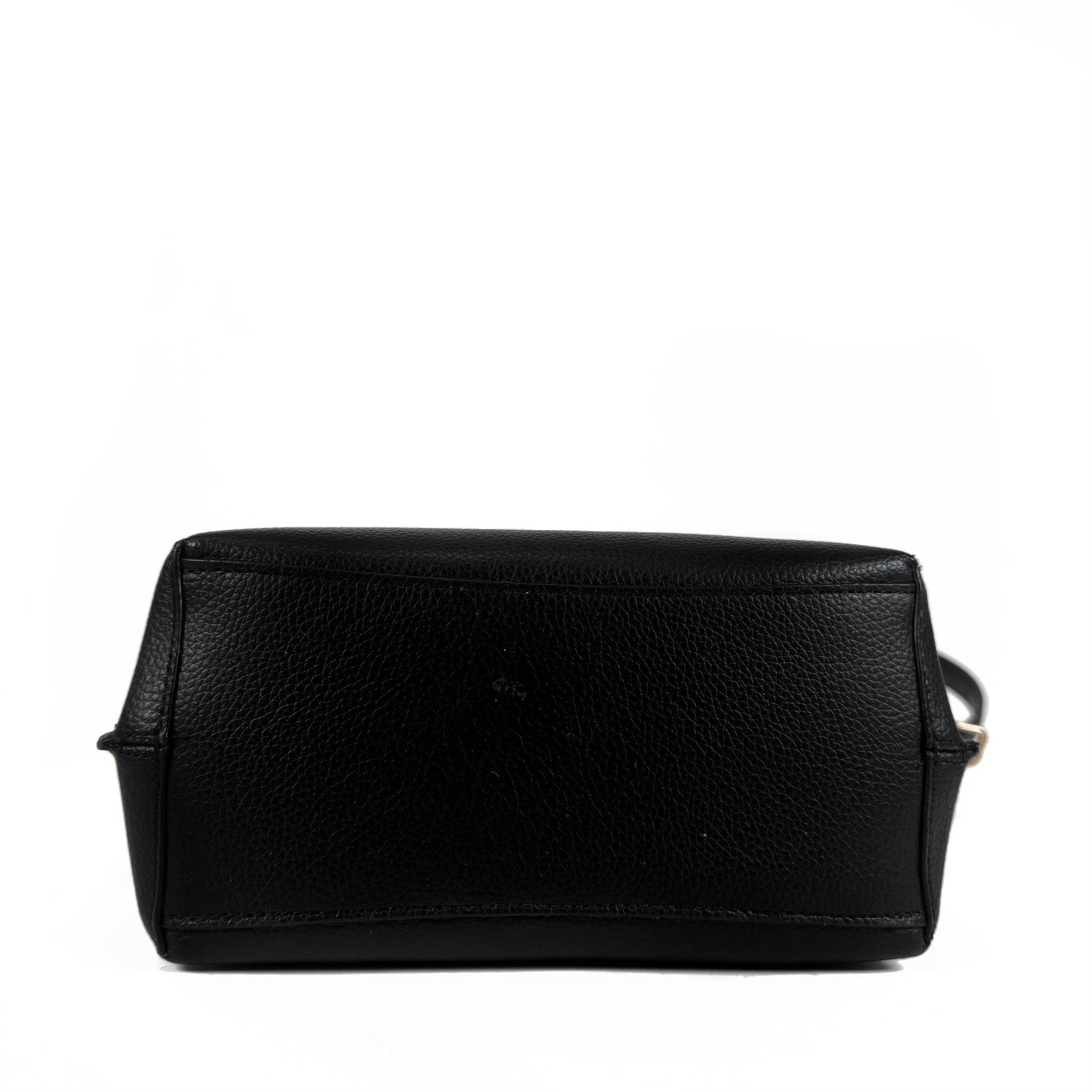 Crafted from grain leather with gold-tone hardware, logo at the front, open top with press-stud closure, red leather interior, removable handle and removable adjustable shoulder strap. New price: $490