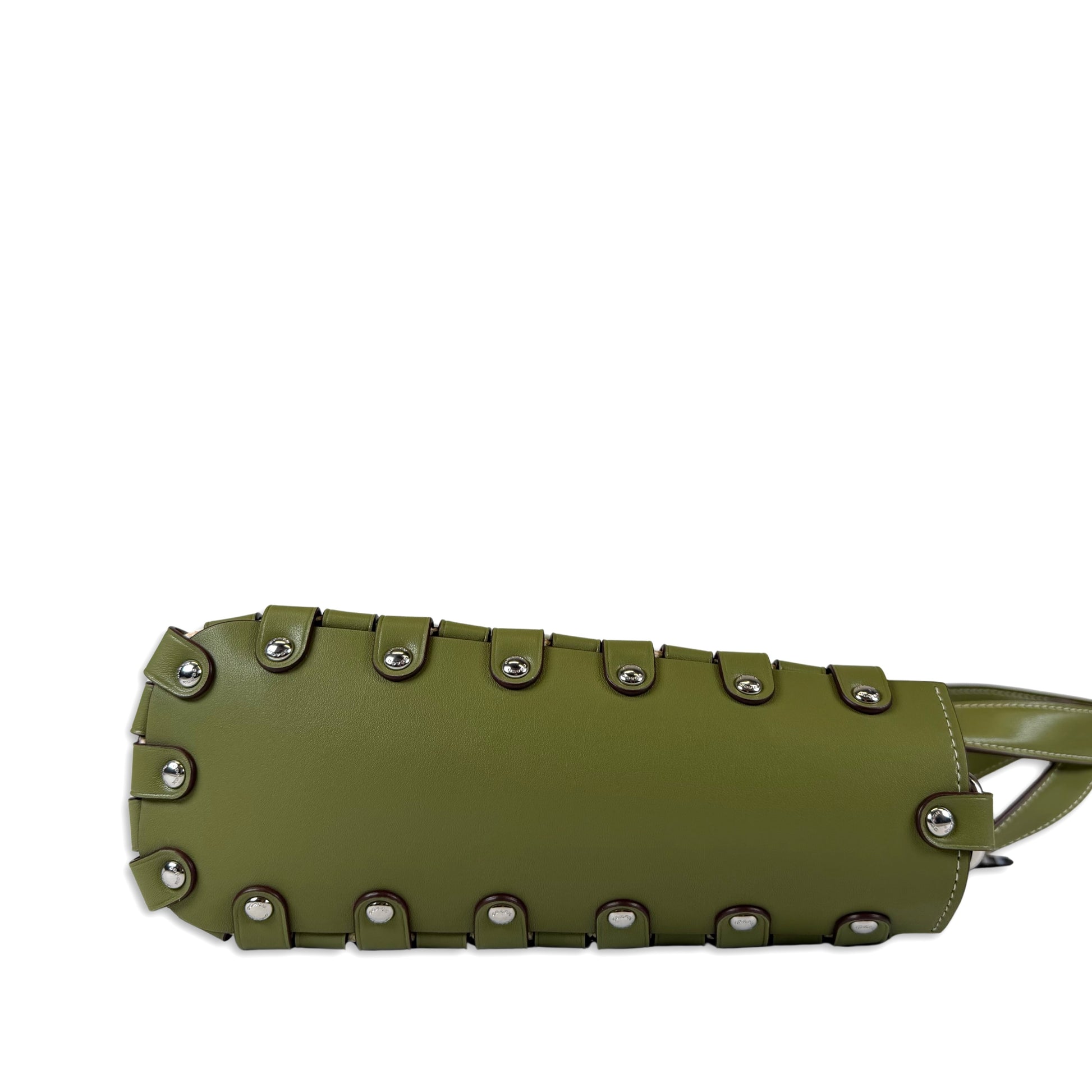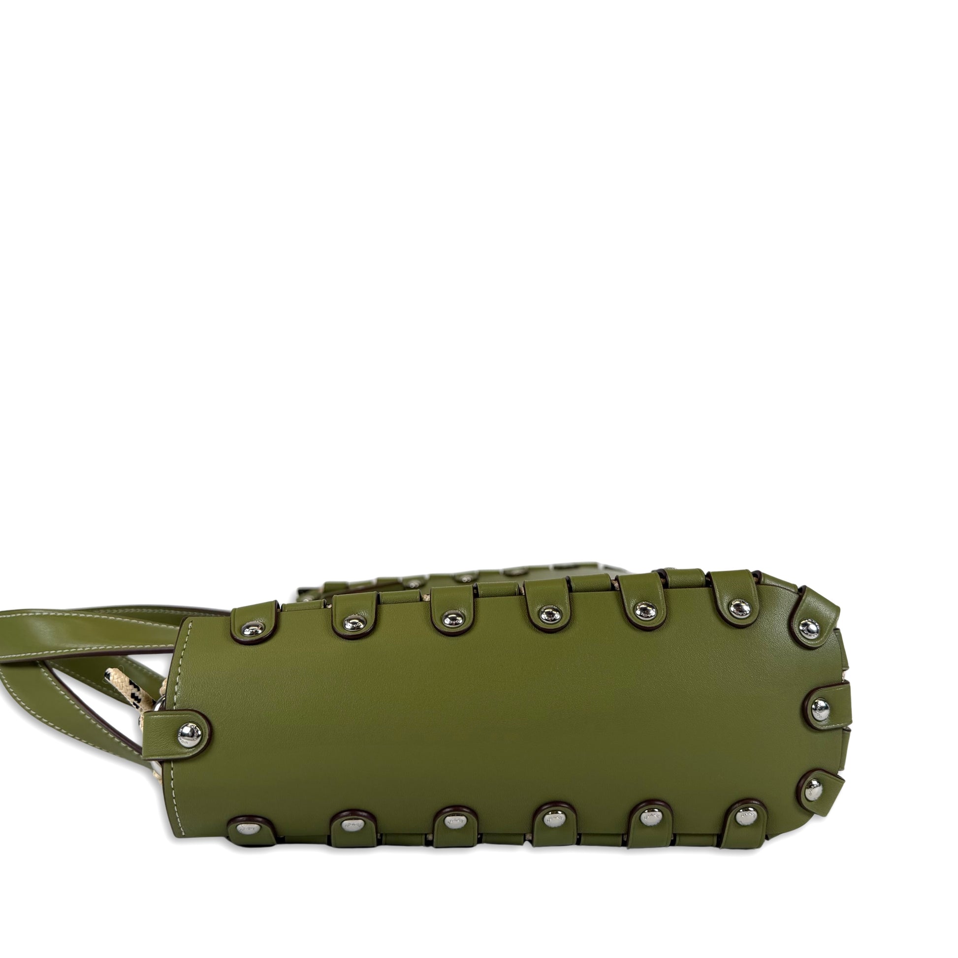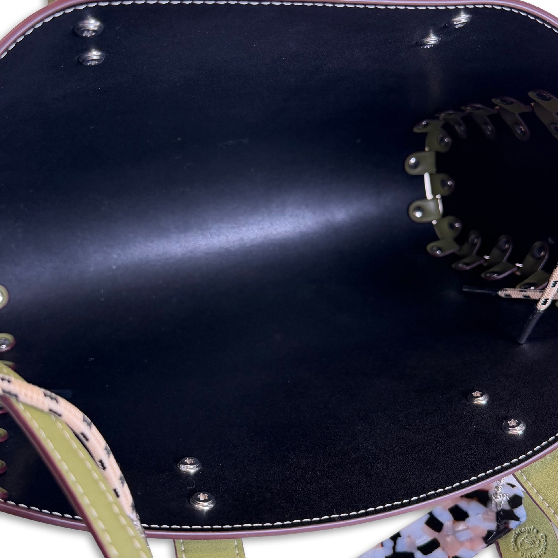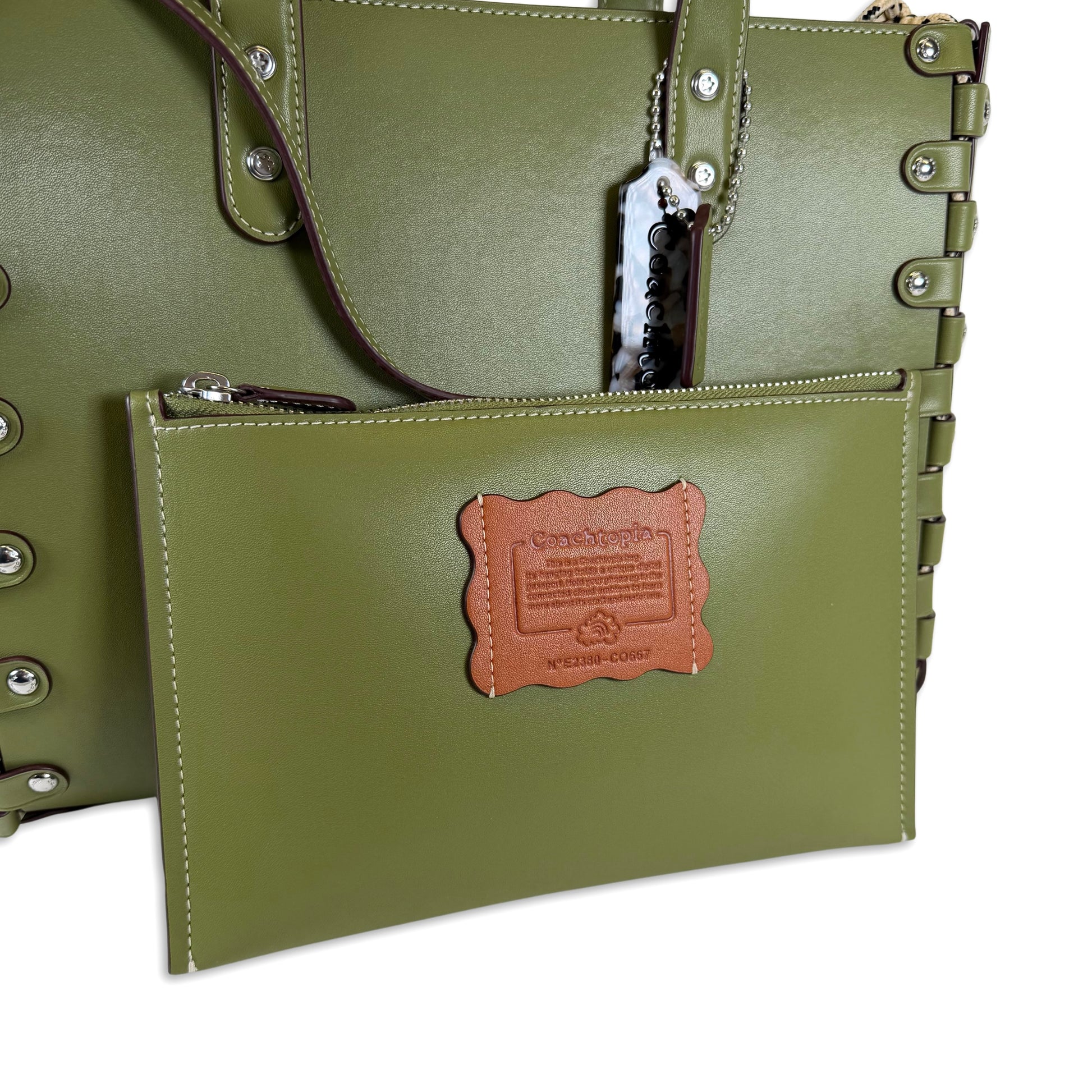 Crafted from smooth Coachtopia leather with distinctive laced seams, silver-tone studs along sides, open top, unlined interior with removable zip pouch, dual handles and removable adjustable shoulder strap.