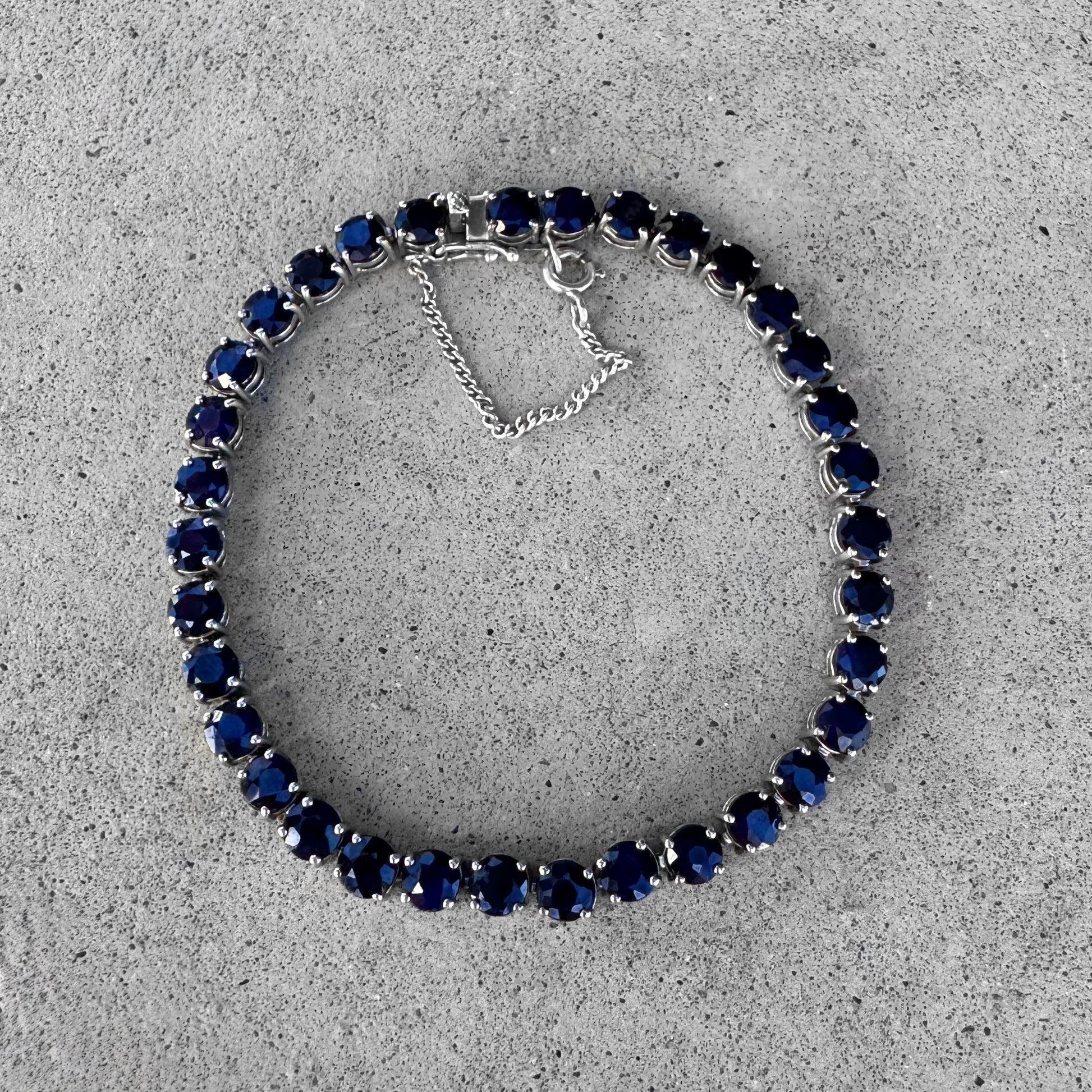 Sterling silver tennis bracelet with blue Sapphires, box clasp, safety chain, and two safety figure eight clips.