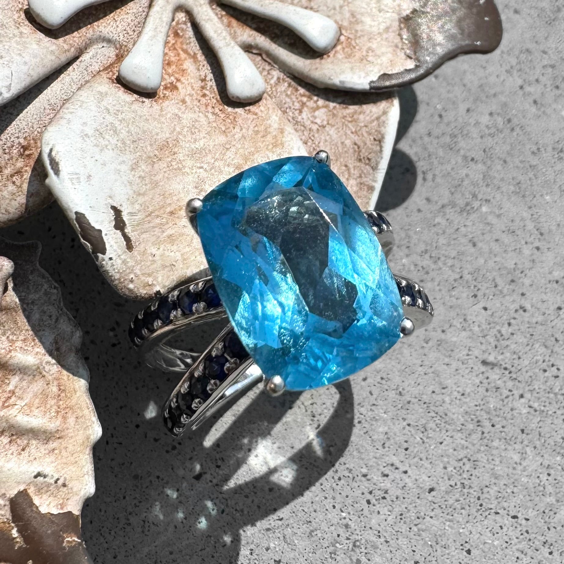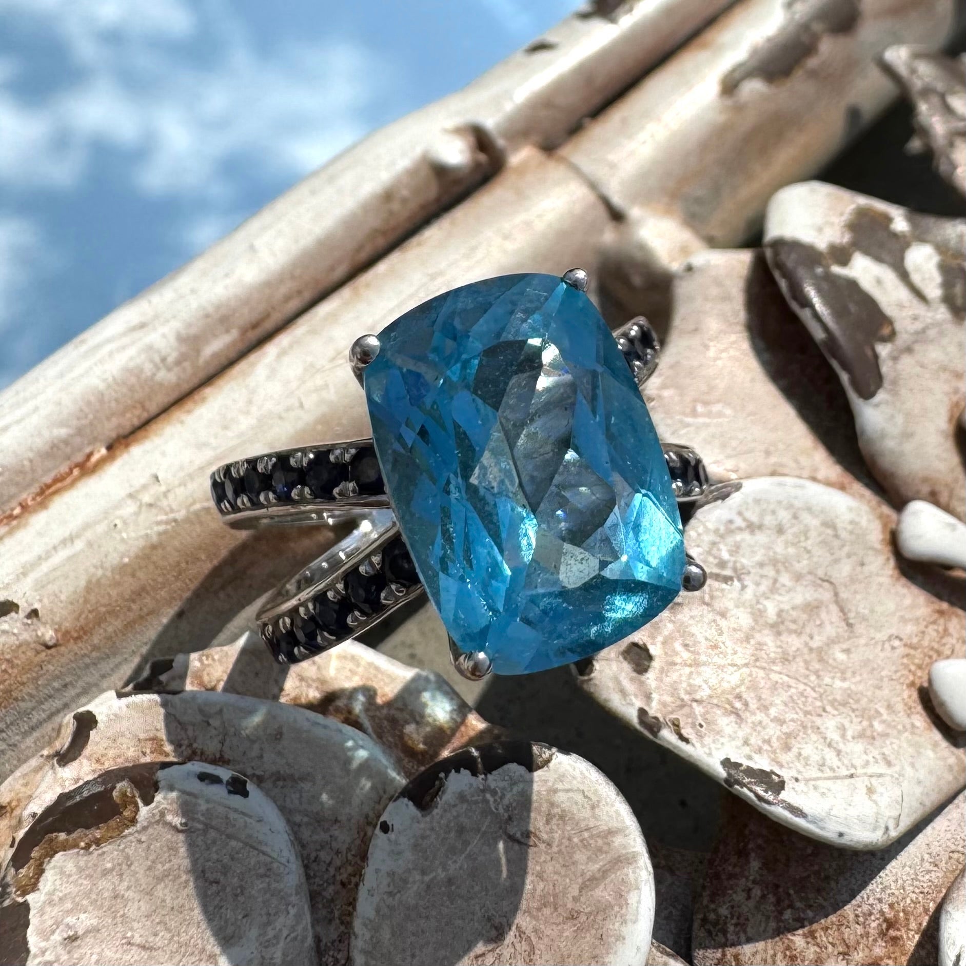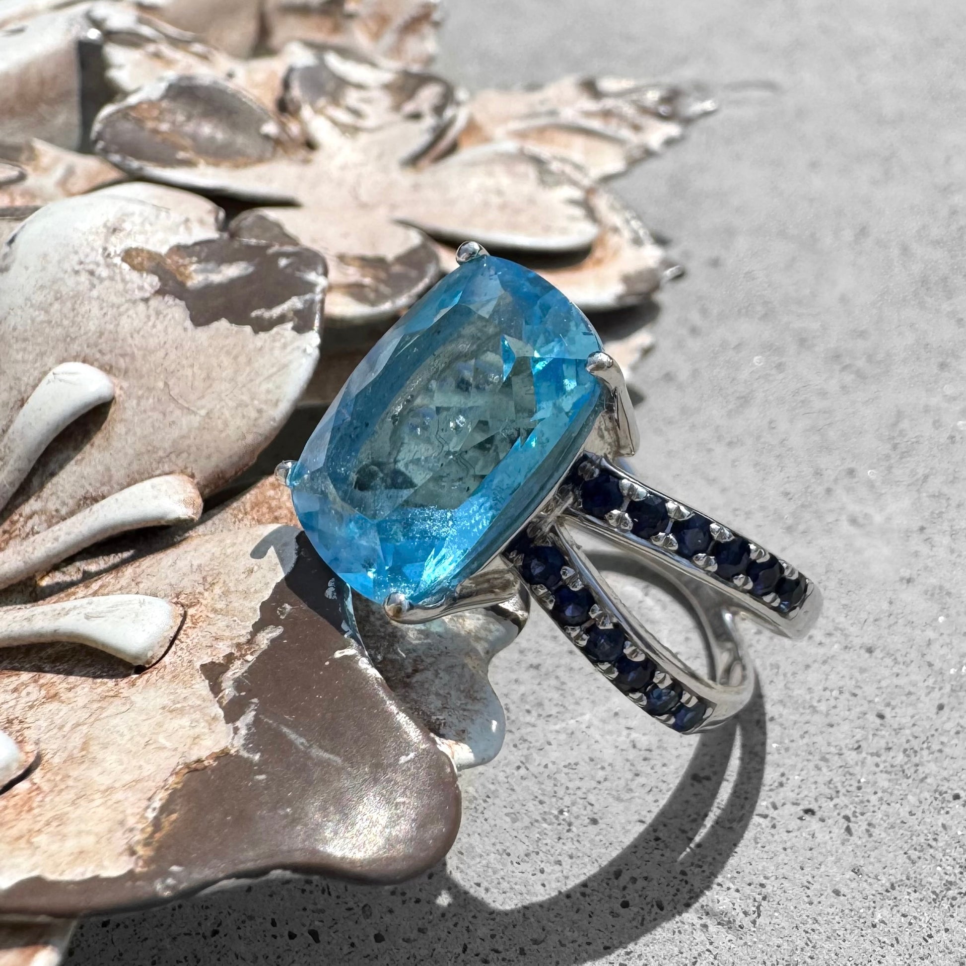 The Sky & Sea together. 18K white gold ring with Blue Topaz and dark blue Sapphires. Appraisal: $4000