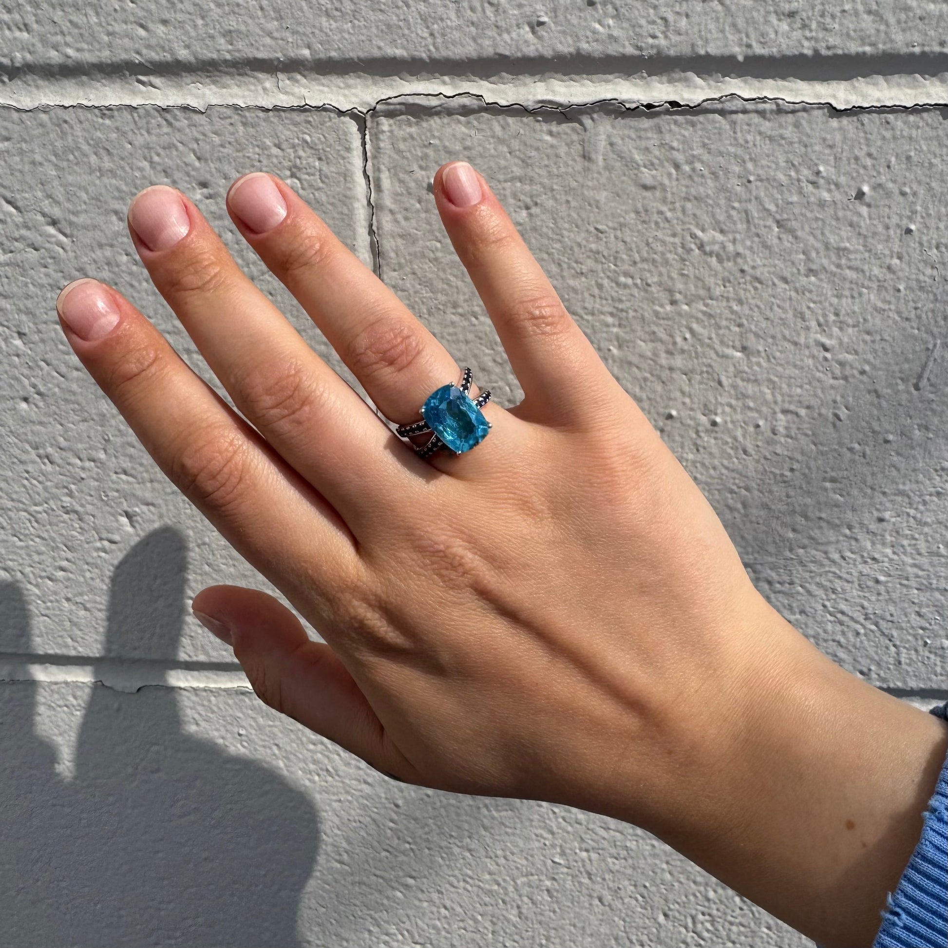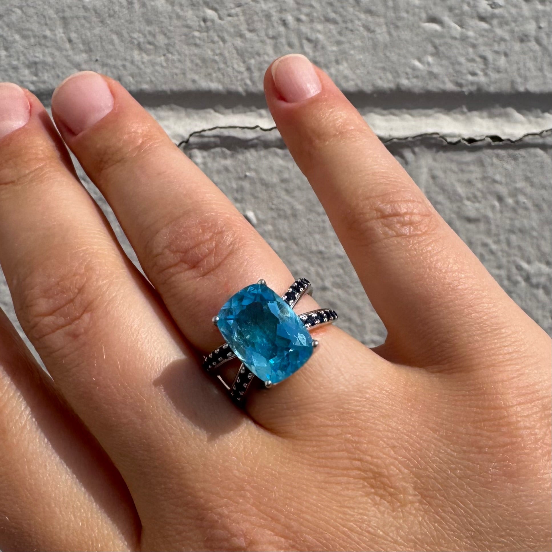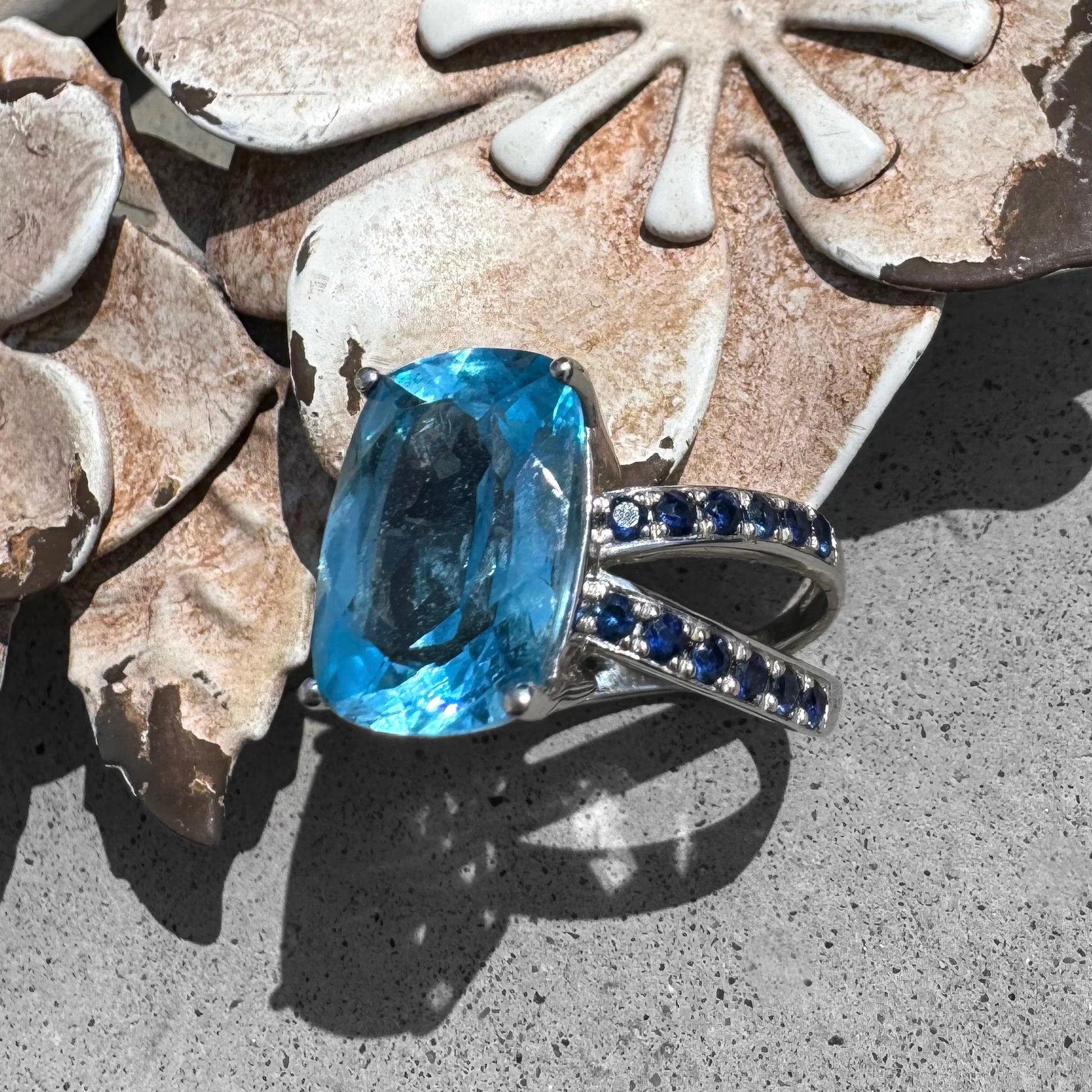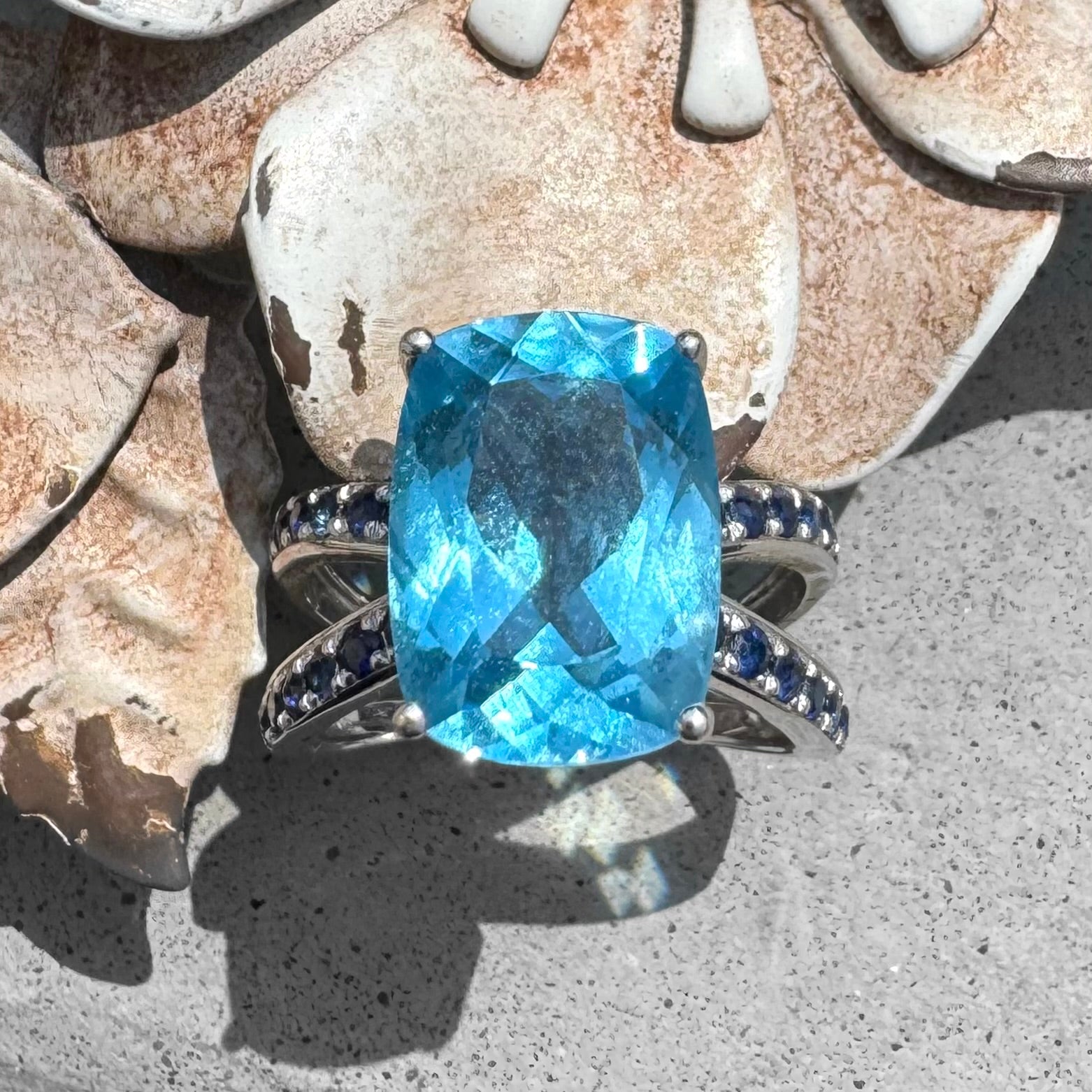 The Sky & Sea together. 18K white gold ring with Blue Topaz and dark blue Sapphires. Appraisal: $4000