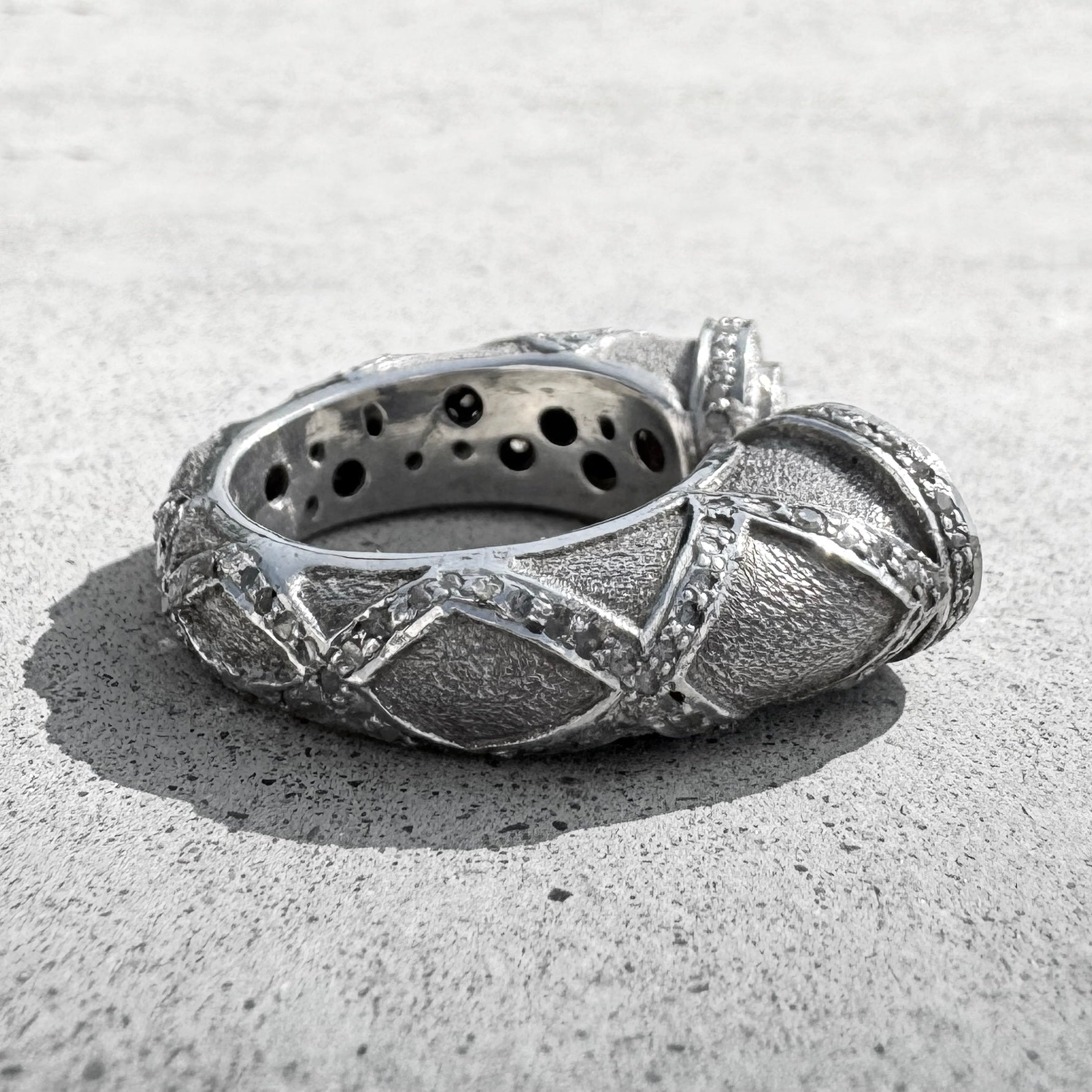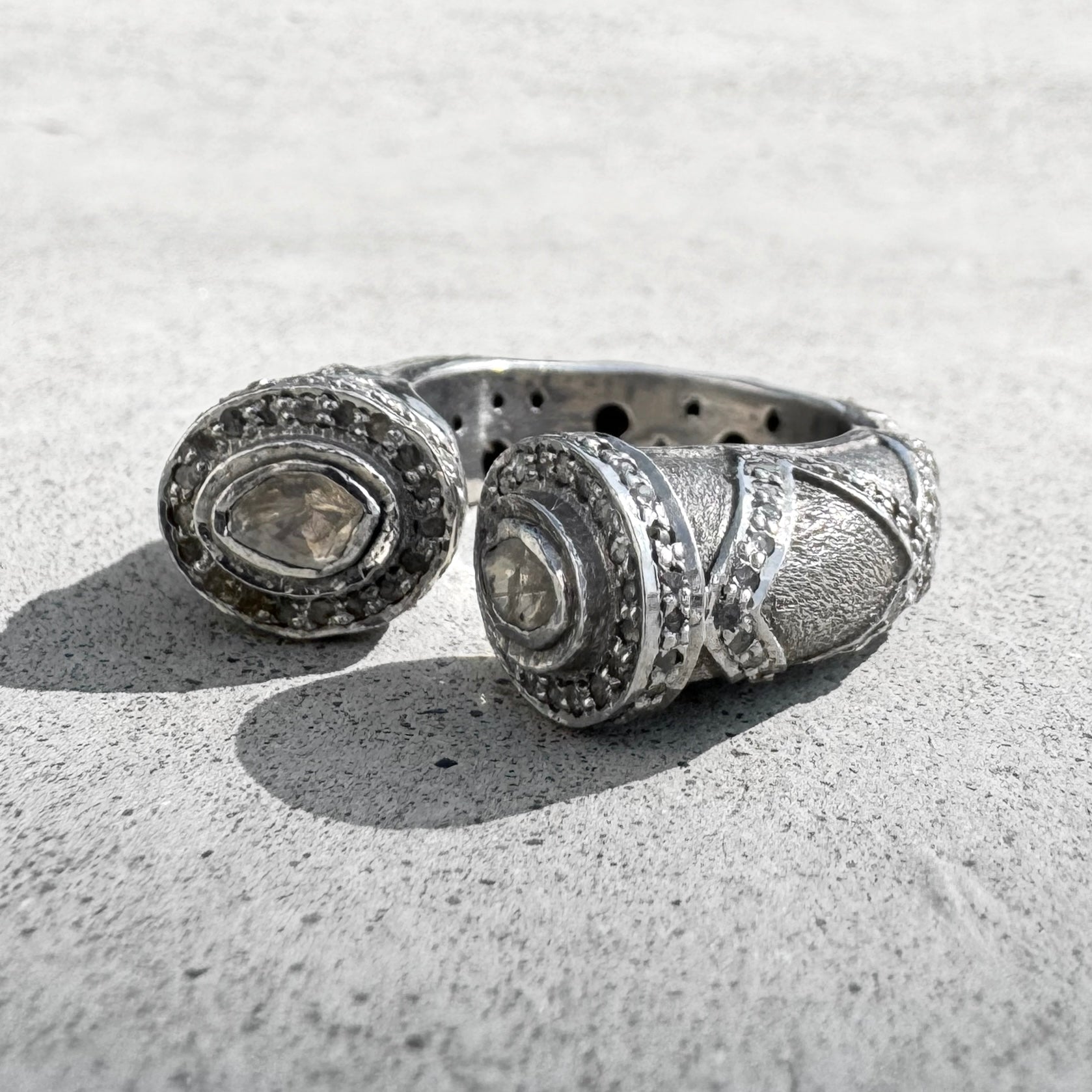 Unique design. Sterling Silver tapered saddle ring diamond slices, diamond chips and rose cut diamonds. Appraisal: $1895