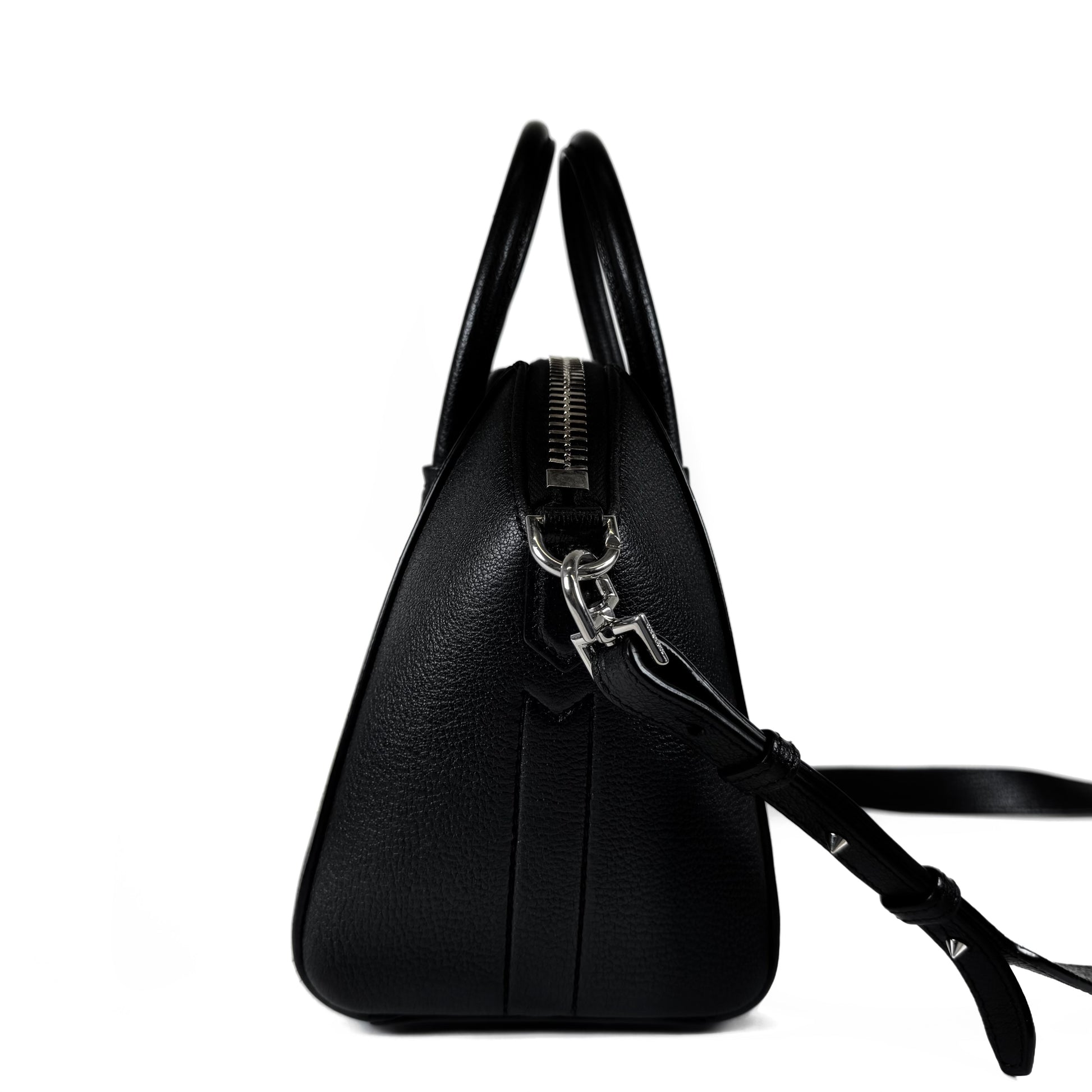 Antigona = Rebellious. Crafted from goatskin leather with silver-tone hardware, top zip closure, fabric interior, rolled dual handles and removable adjustable shoulder strap. New price: $3450