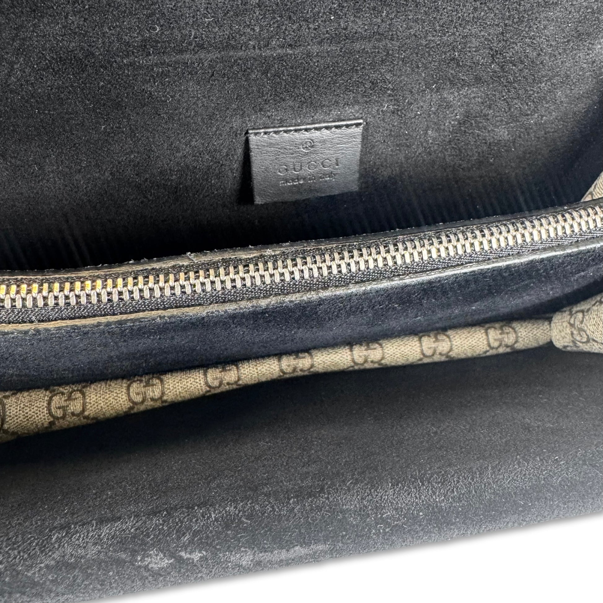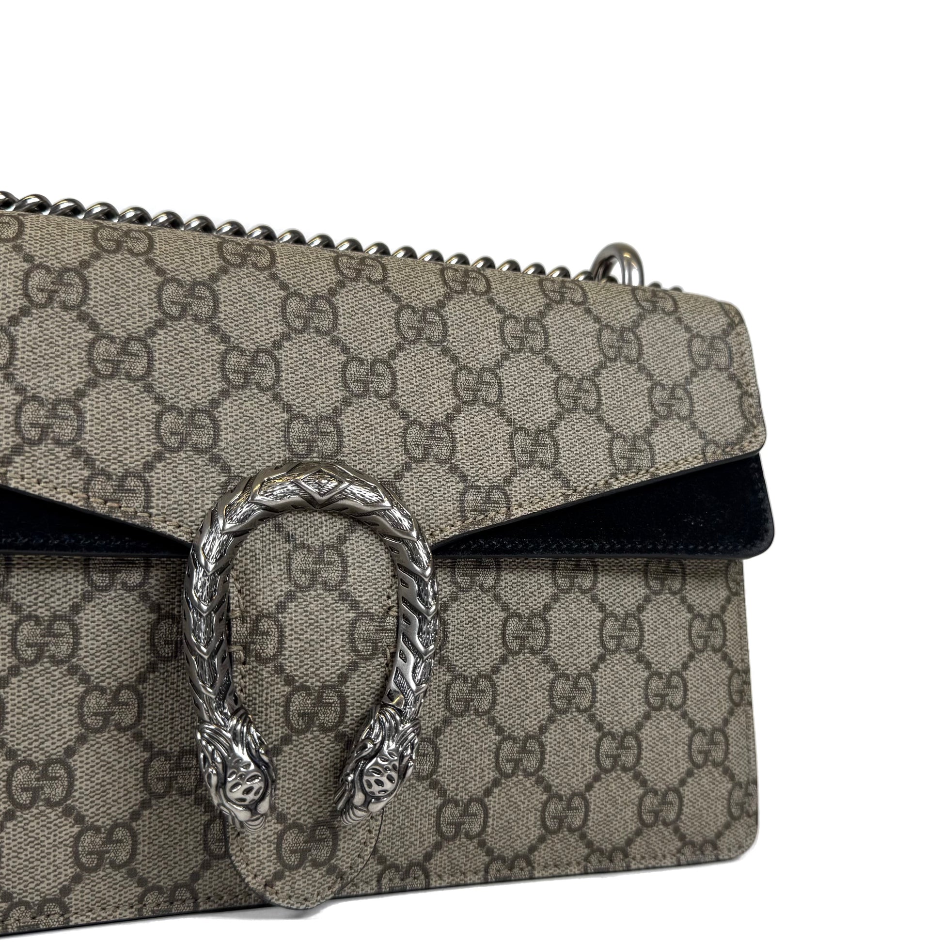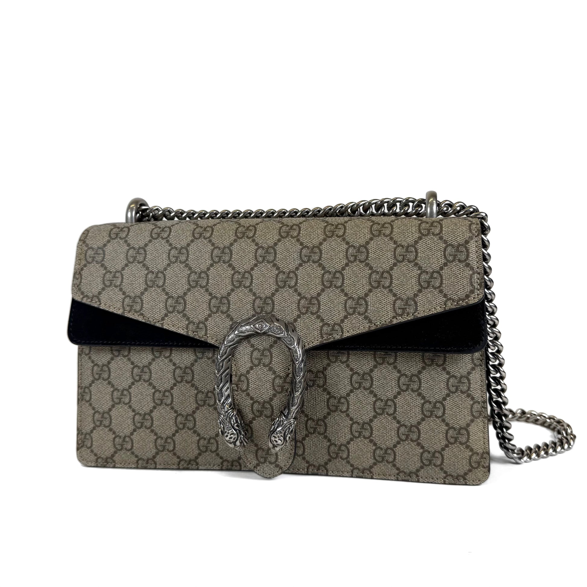 Your Next Favorite! Crafted from GG Supreme canvas and black calfskin leather with black suede panels, antique silver-toned hardware, tiger head closure, canvas and suede interior, and sliding chain strap.