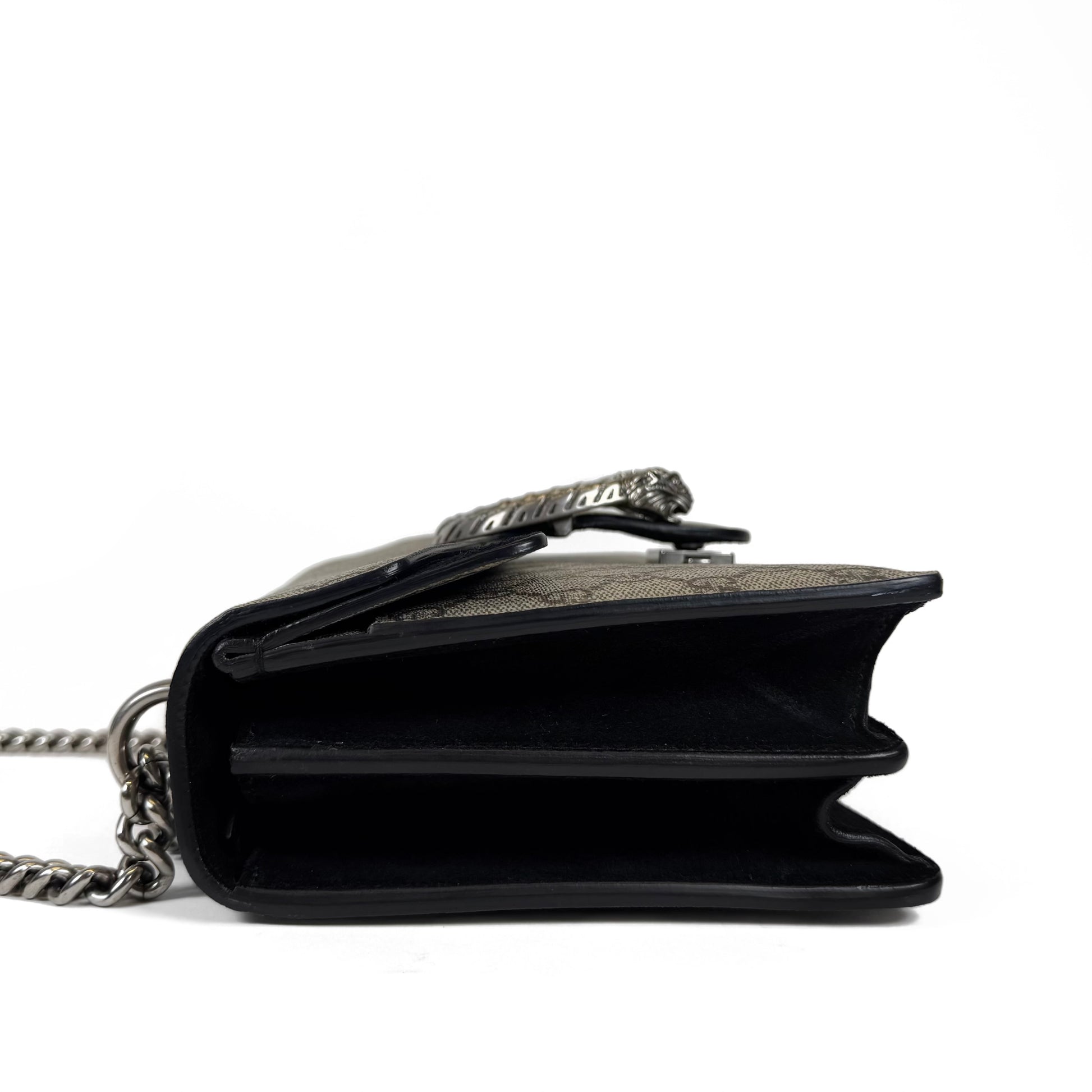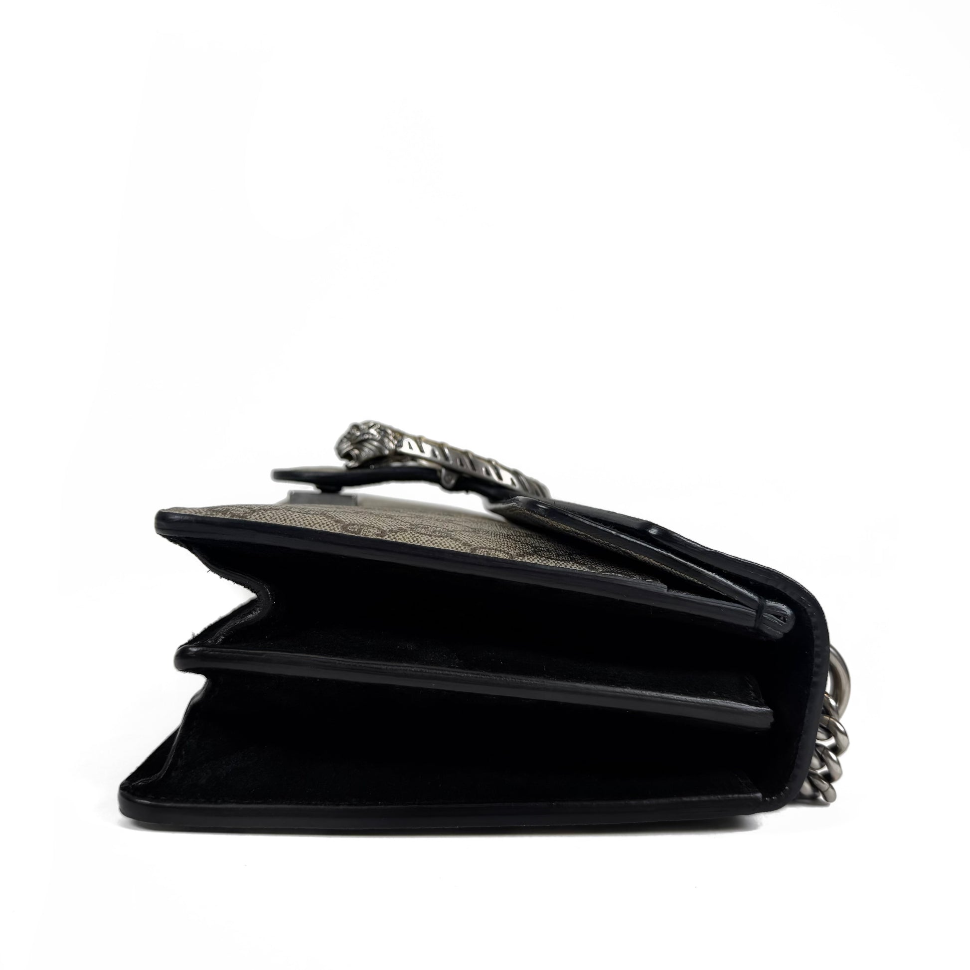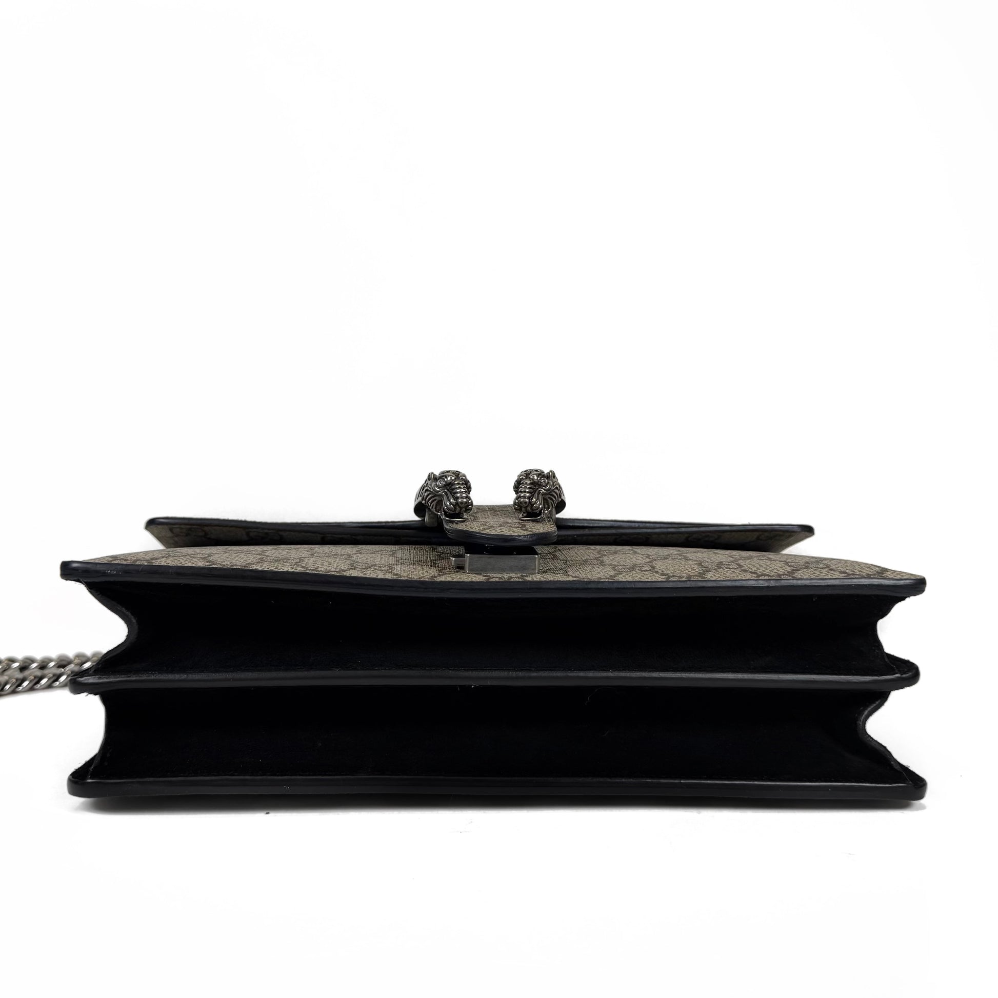 Your Next Favorite! Crafted from GG Supreme canvas and black calfskin leather with black suede panels, antique silver-toned hardware, tiger head closure, canvas and suede interior, and sliding chain strap.