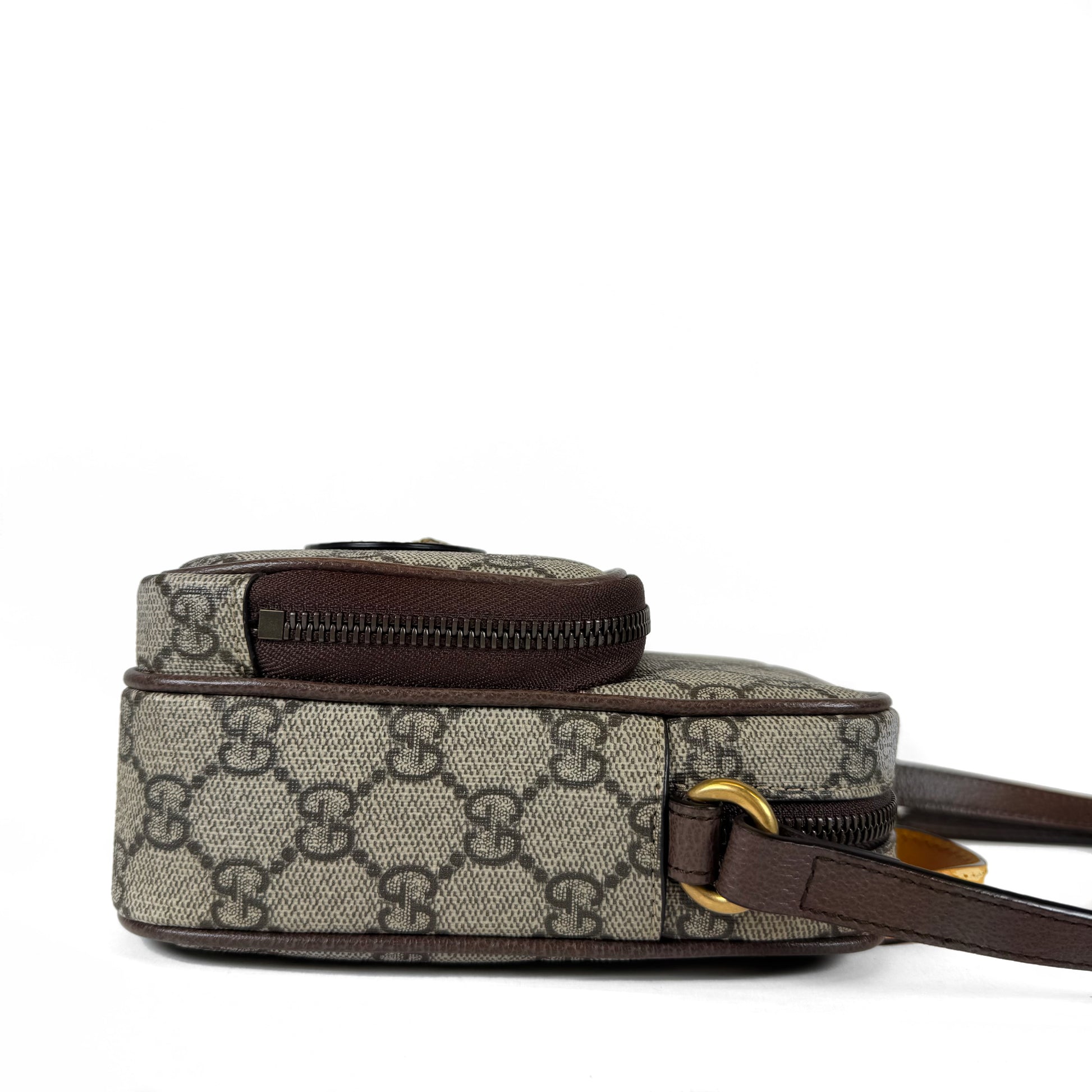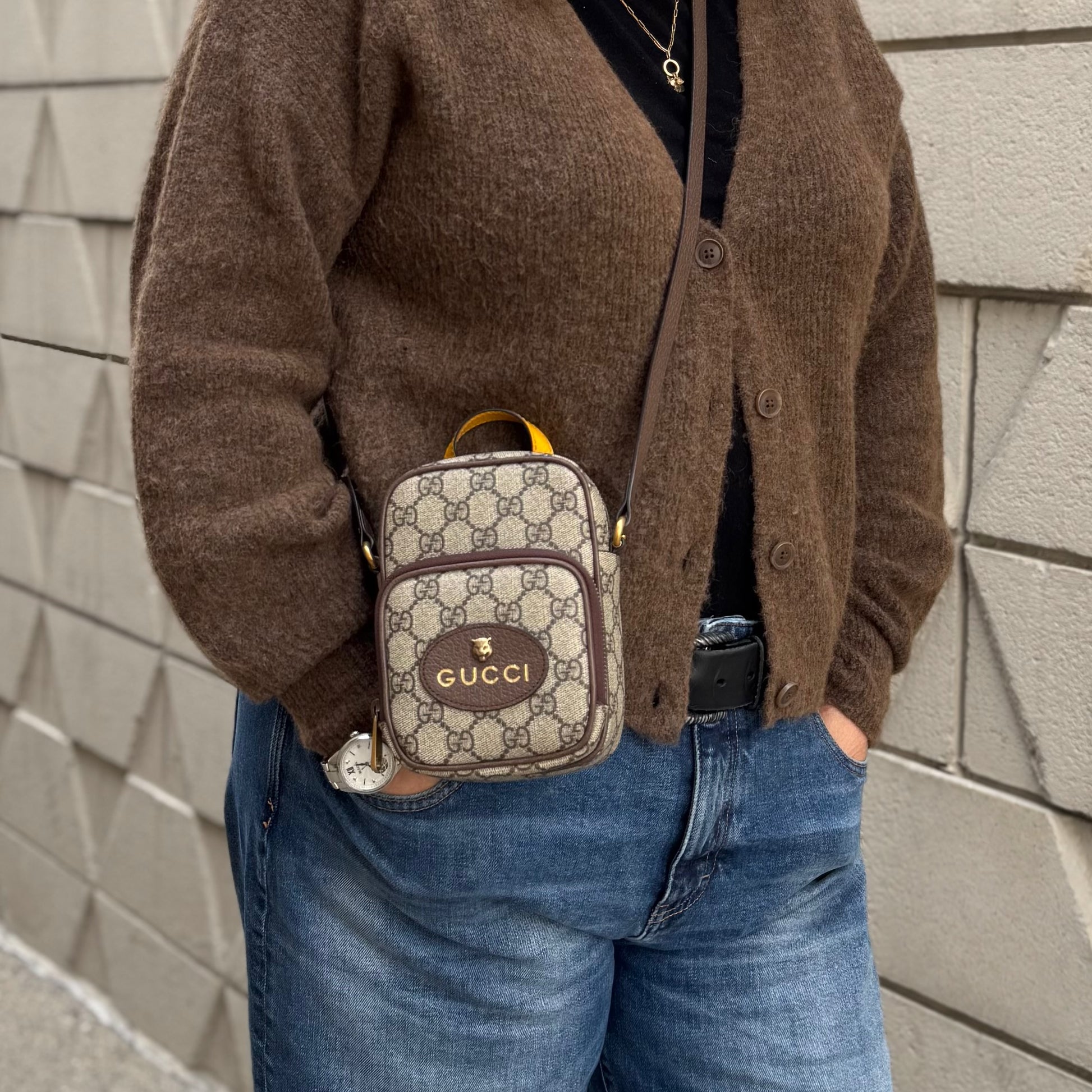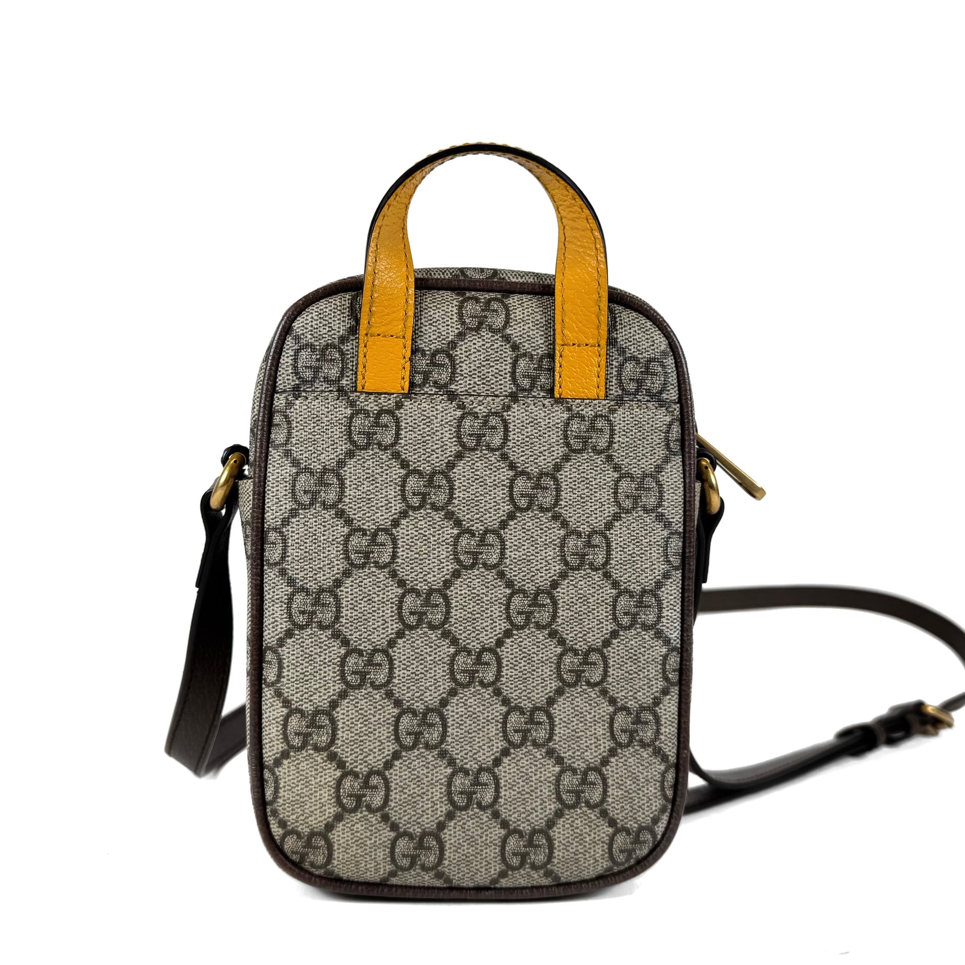 Giftable! Crafted from GG Supreme canvas with brown calfskin leather, gold-tone hardware, front zip pocket, leather logo patch with signature tiger head, textile interior, yellow top handle and adjustable leather crossbody strap. New price: $2590