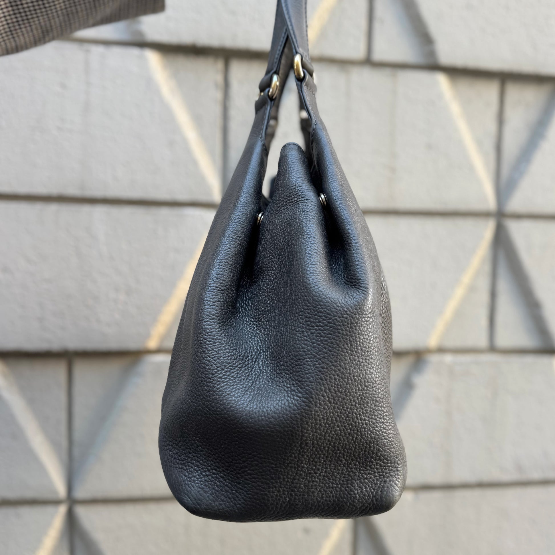Crafted from pebbled calfskin leather with light gold-tone hardware, magnetic snap front closure, snap closures at sides, canvas interior and dual handles.