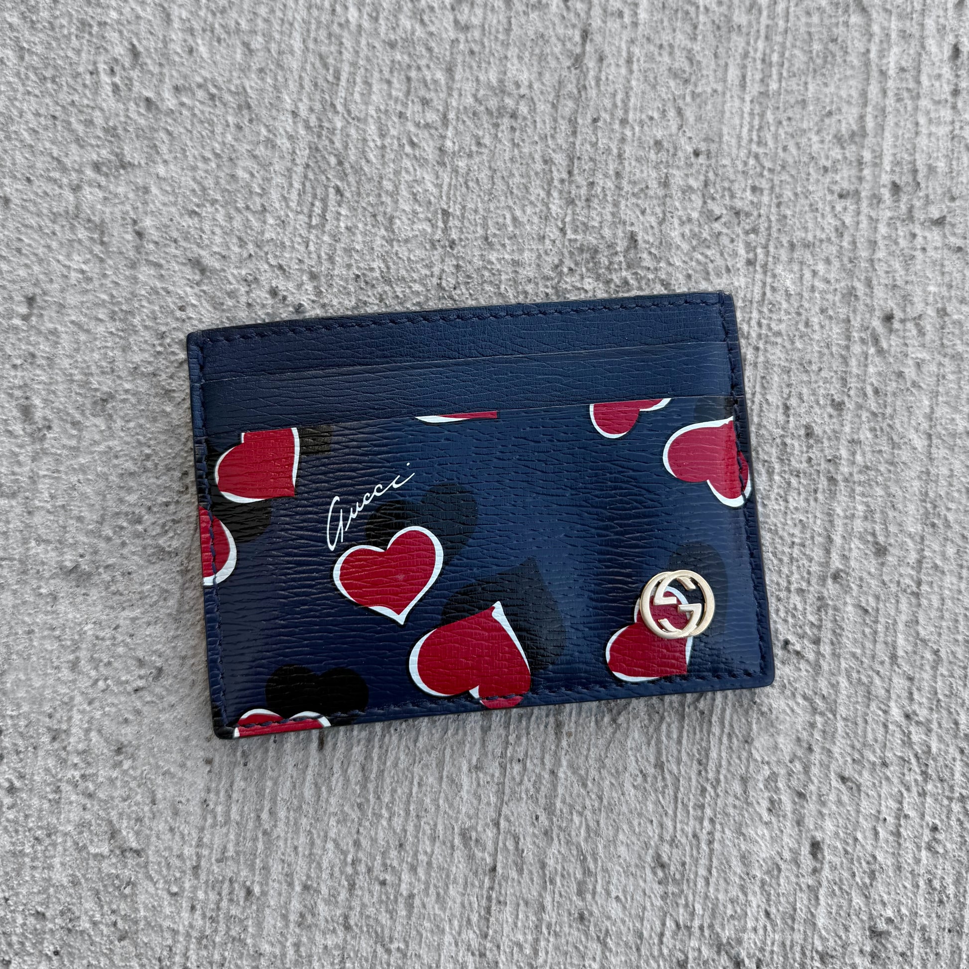 Cutie! Crafted from textured calfskin leather with scattered red hearts and iconic gold-toned Interlocking G logo on the front.