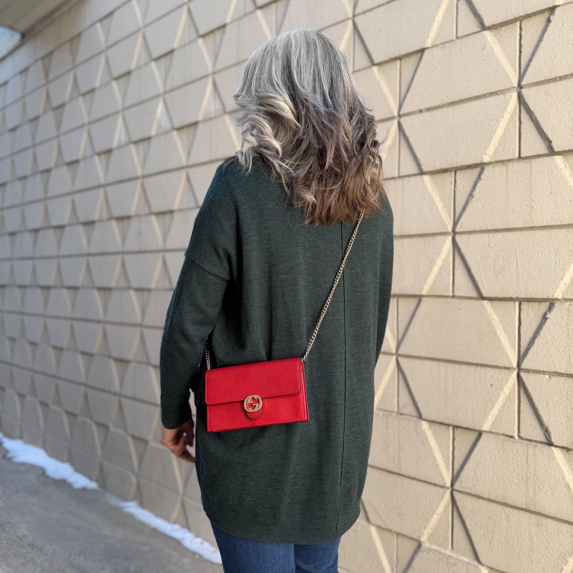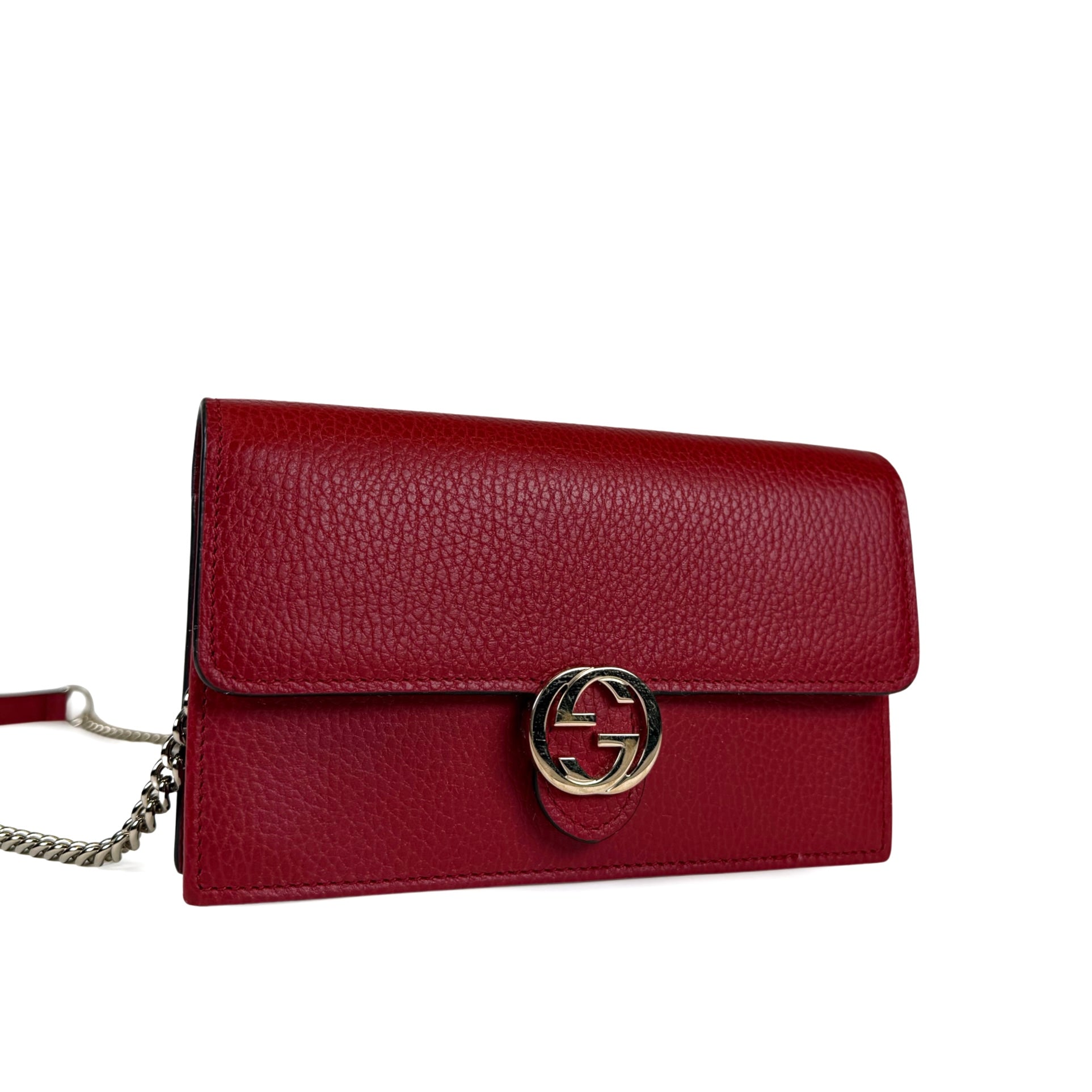 The perfect little bag. Crafted from grained calfskin leather with light gold-tone hardware, signature interlocking 'G' logo clasp, leather interior with multiple card slots, and removable chain-link shoulder strap. New price: $1500