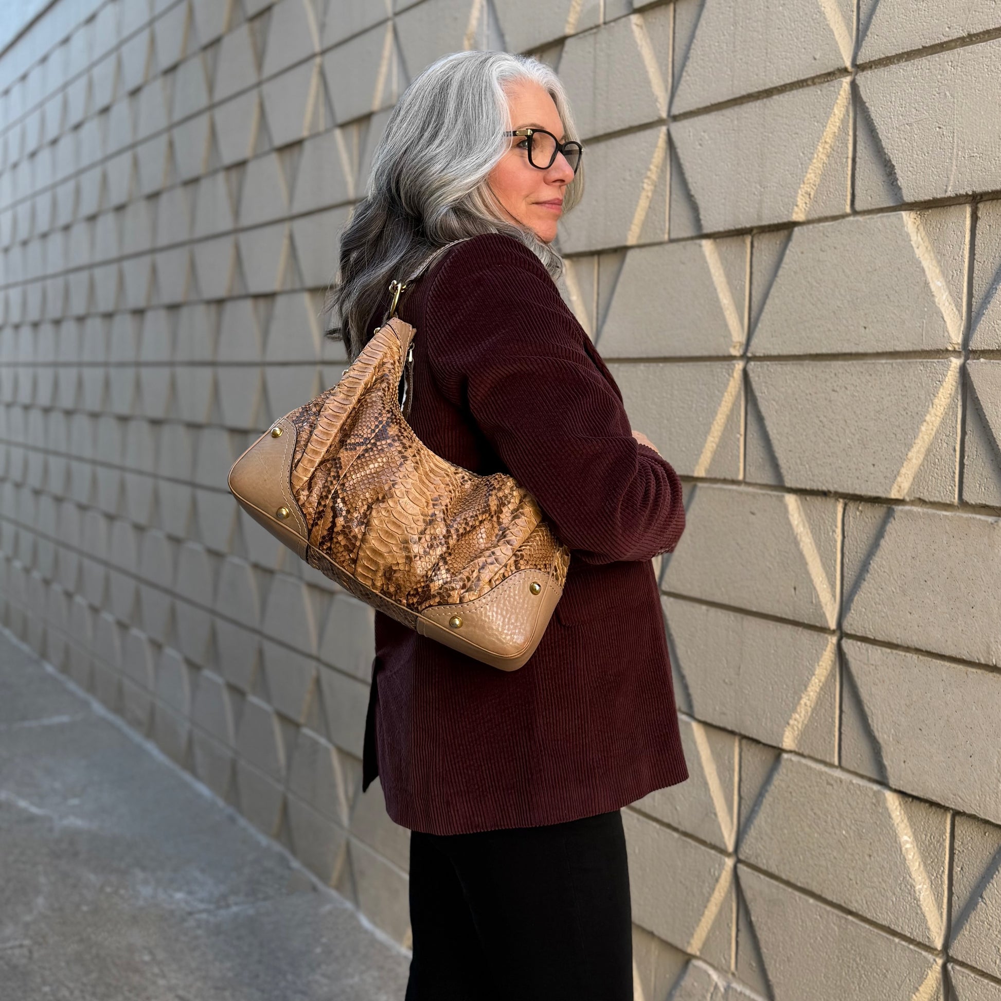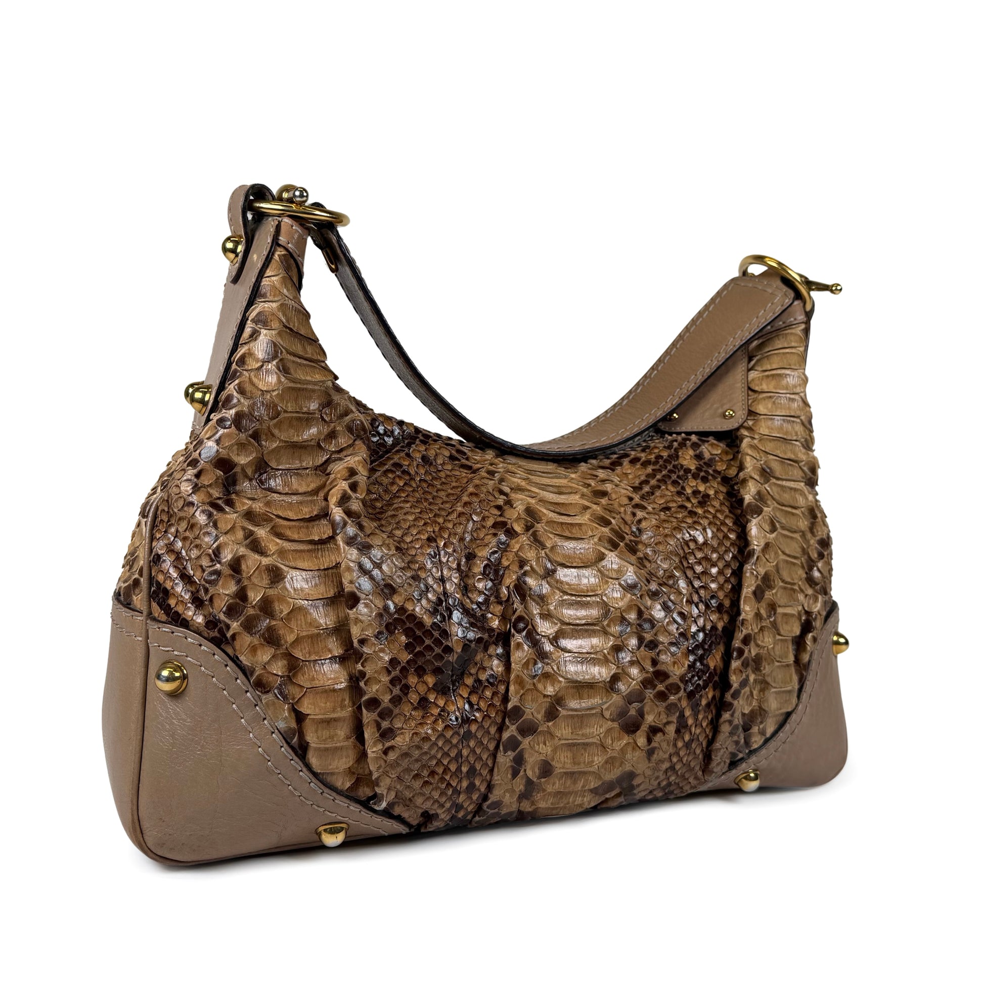 A rare find in exotic leather. Crafted from python with leather trim, gold-tone hardware, top zip closure, monogram textile interior and single flat leather shoulder strap.