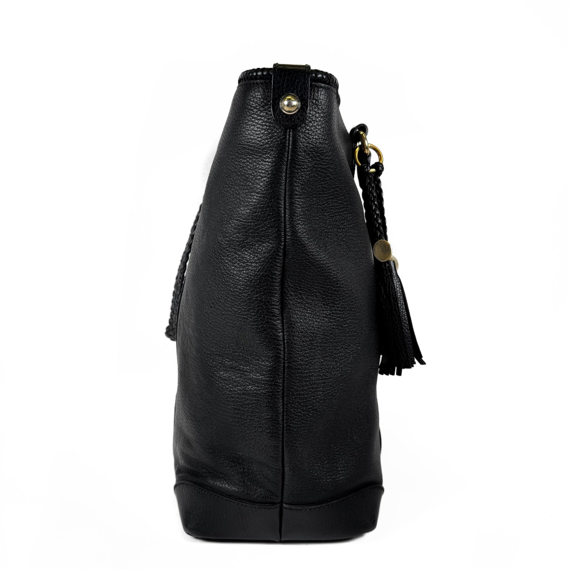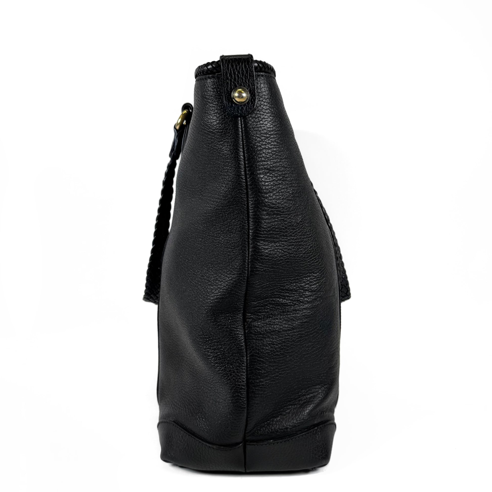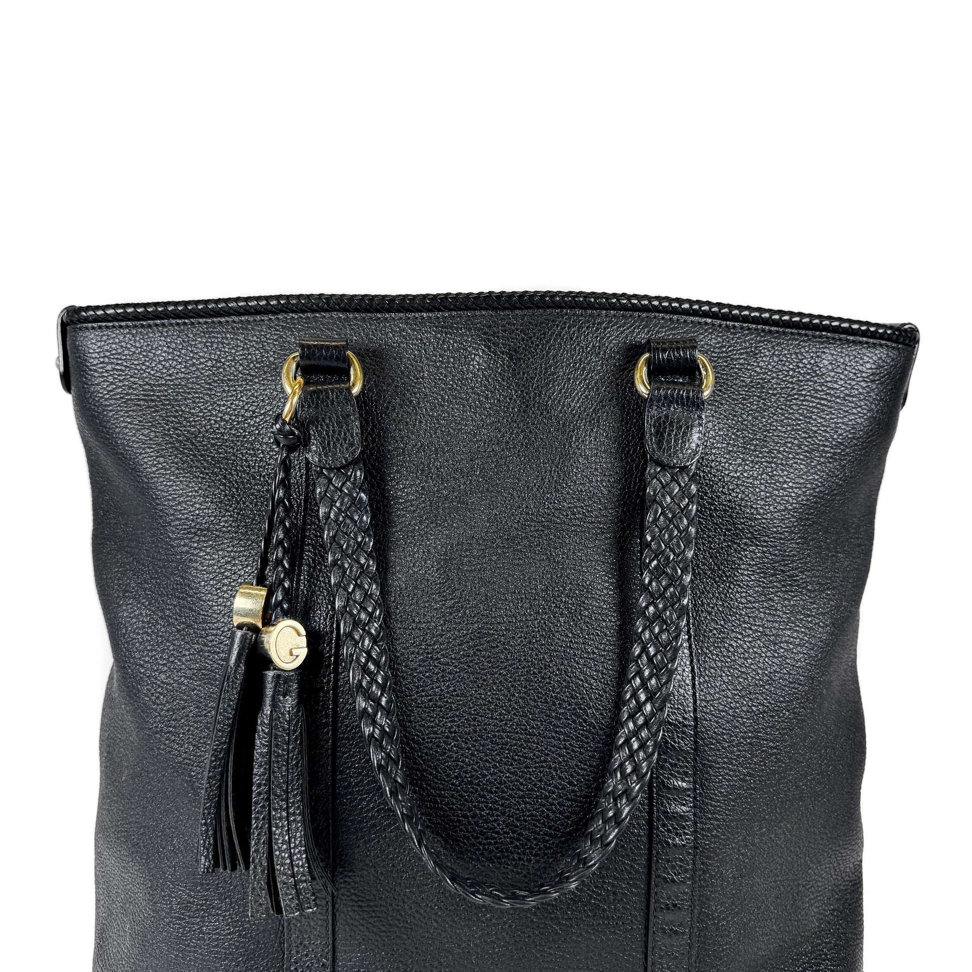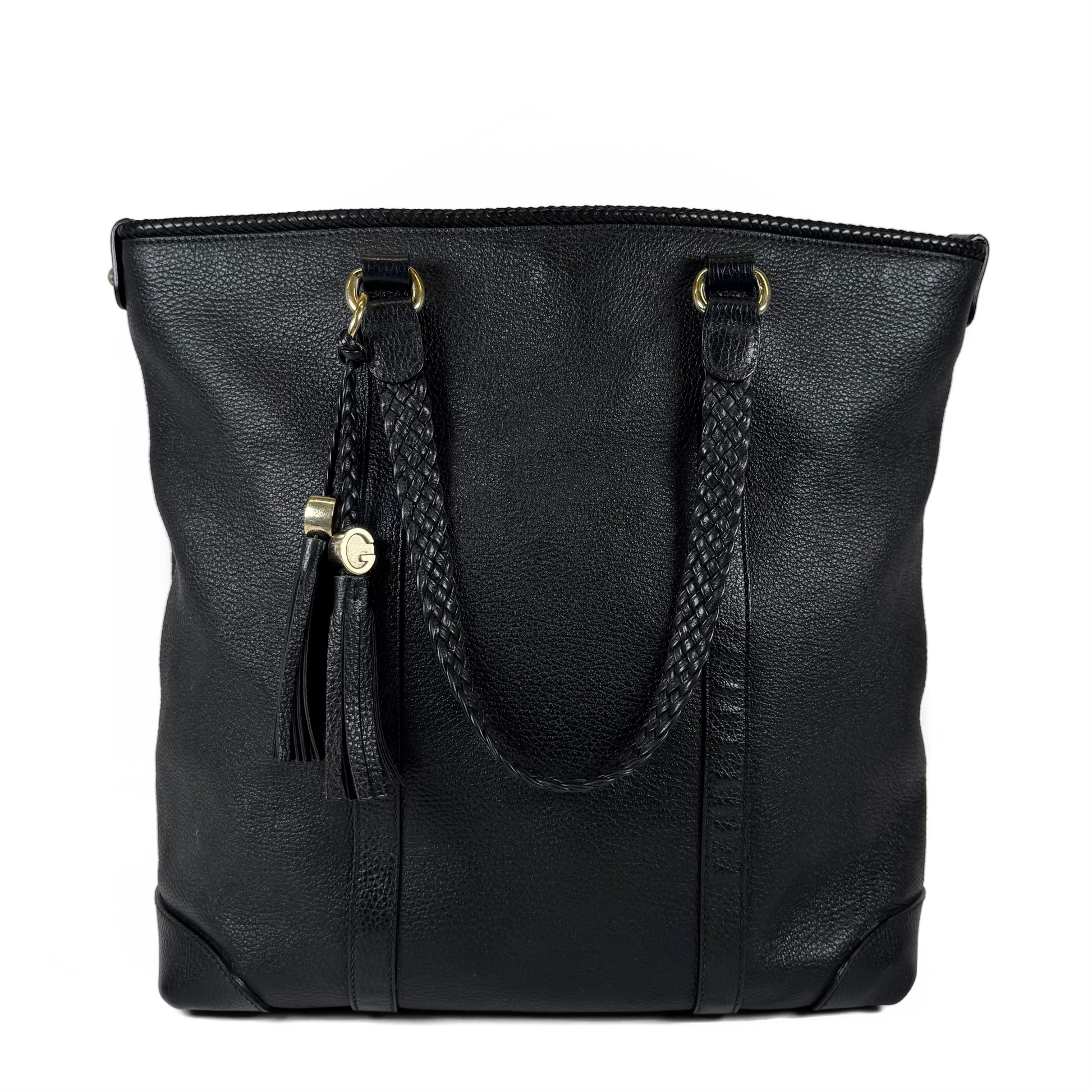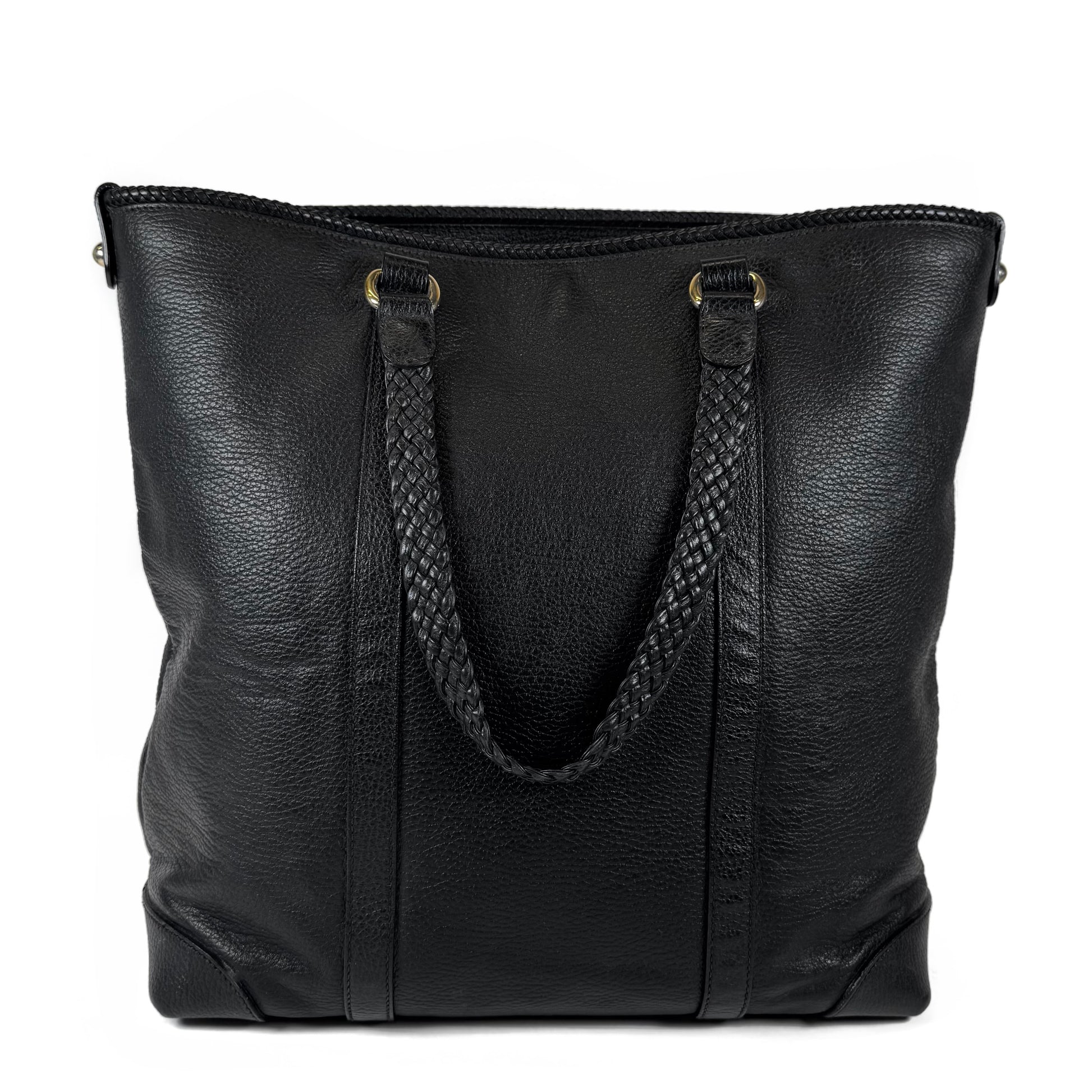 Who doesn’t love a good tote. Crafted from grain calfskin leather with gold-tone hardware, open top with clasp closure, protective feet, textile interior and dual woven leather handles.