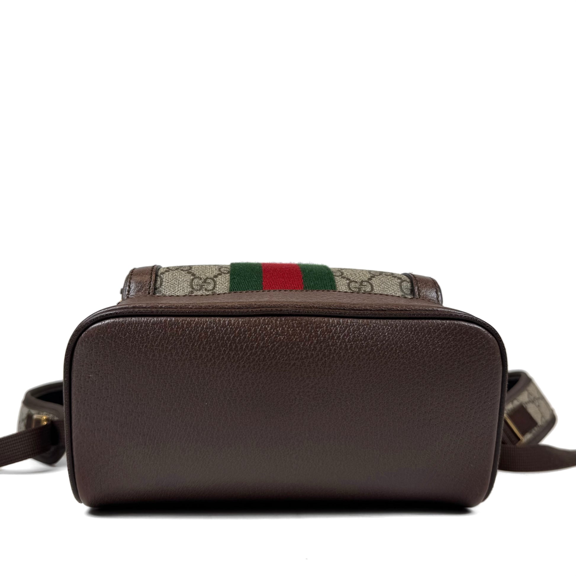 Travel in style. Crafted from GG monogram canvas with brown calfskin leather trim, front zipper pocket, antique gold-tone hardware, signature red and green web accent, canvas interior, leather top handle and adjustable shoulder straps. New price: $2990