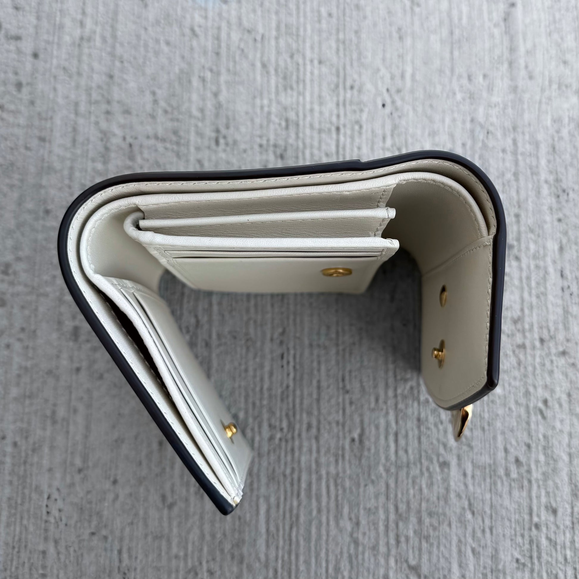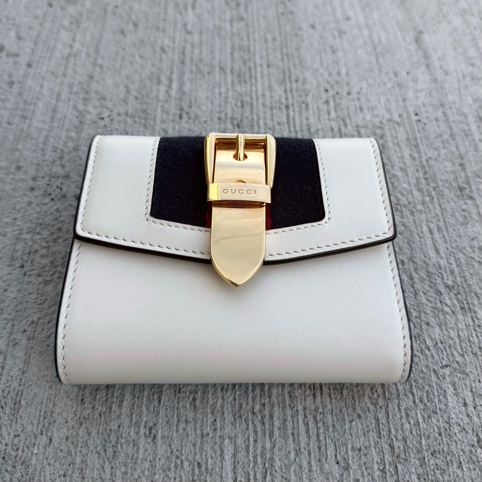 Get your wallet glow up here. Crafted from smooth calfskin leather with navy and red Web stripe, gold-tone buckle with snap button closure, leather interior with card slots, bill compartment, and additional flat pockets.