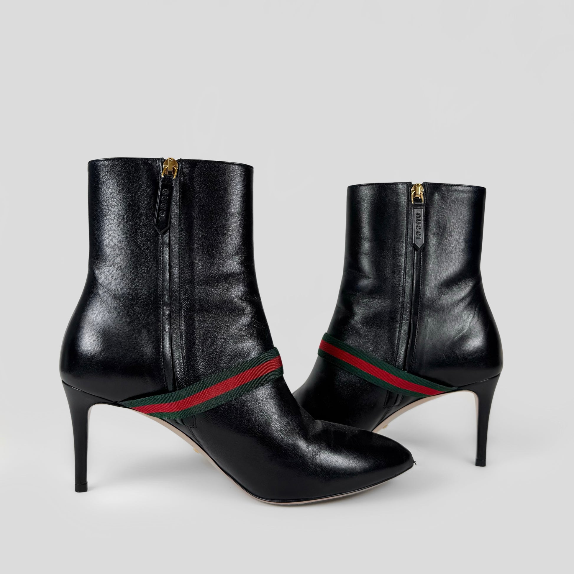 That Sylvie knows how to party. Calfskin leather heeled boots with signature web trim, gold-tone buckle details, side zip closure, pointed toe and leather lined interior. New price: $1425
