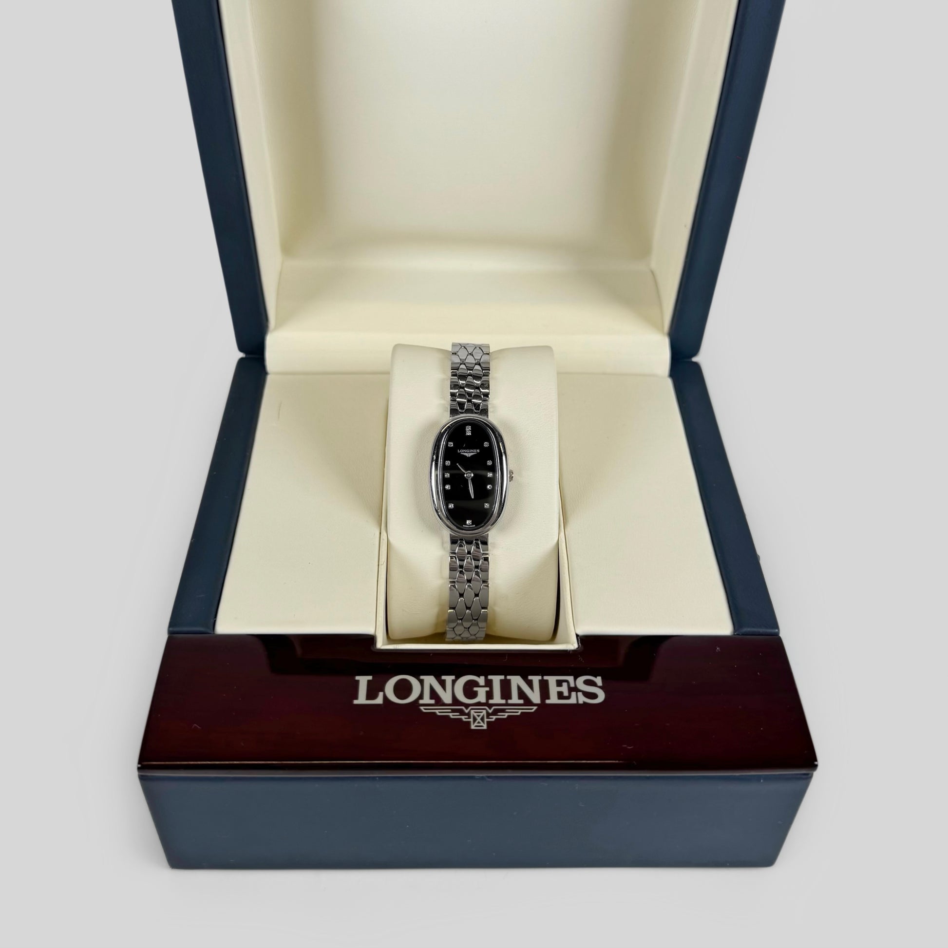 Giftable! Stainless steel oval-shaped wrist watch with black dial, diamond hour markers and anti-reflective sapphire crystal. New price: $2975