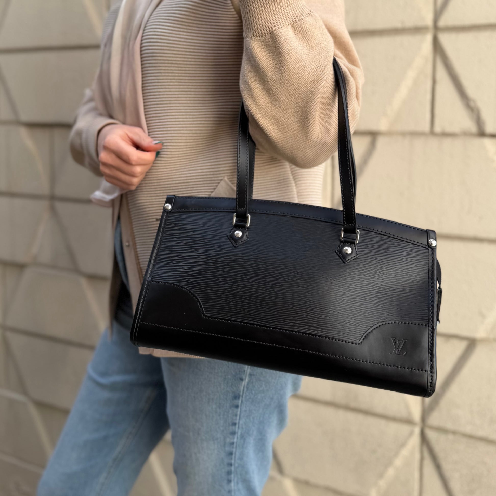 Stunning little bag. Crafted from Epi leather with smooth leather trim, silver-tone hardware, top zip closure, microfibre interior, and dual shoulder straps.