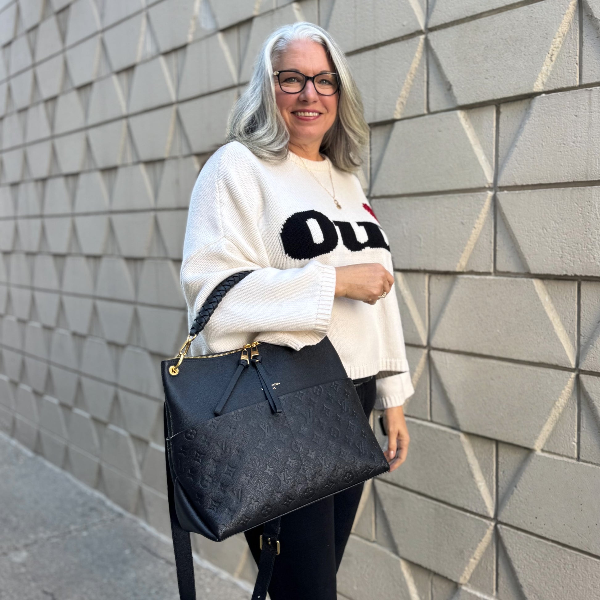 Speechless! Crafted from Empreinte monogram leather with gold-tone hardware, dual front slip pockets, top zip closure, microfibre interior, removable braided handle and removable adjustable shoulder strap. New price: $4420