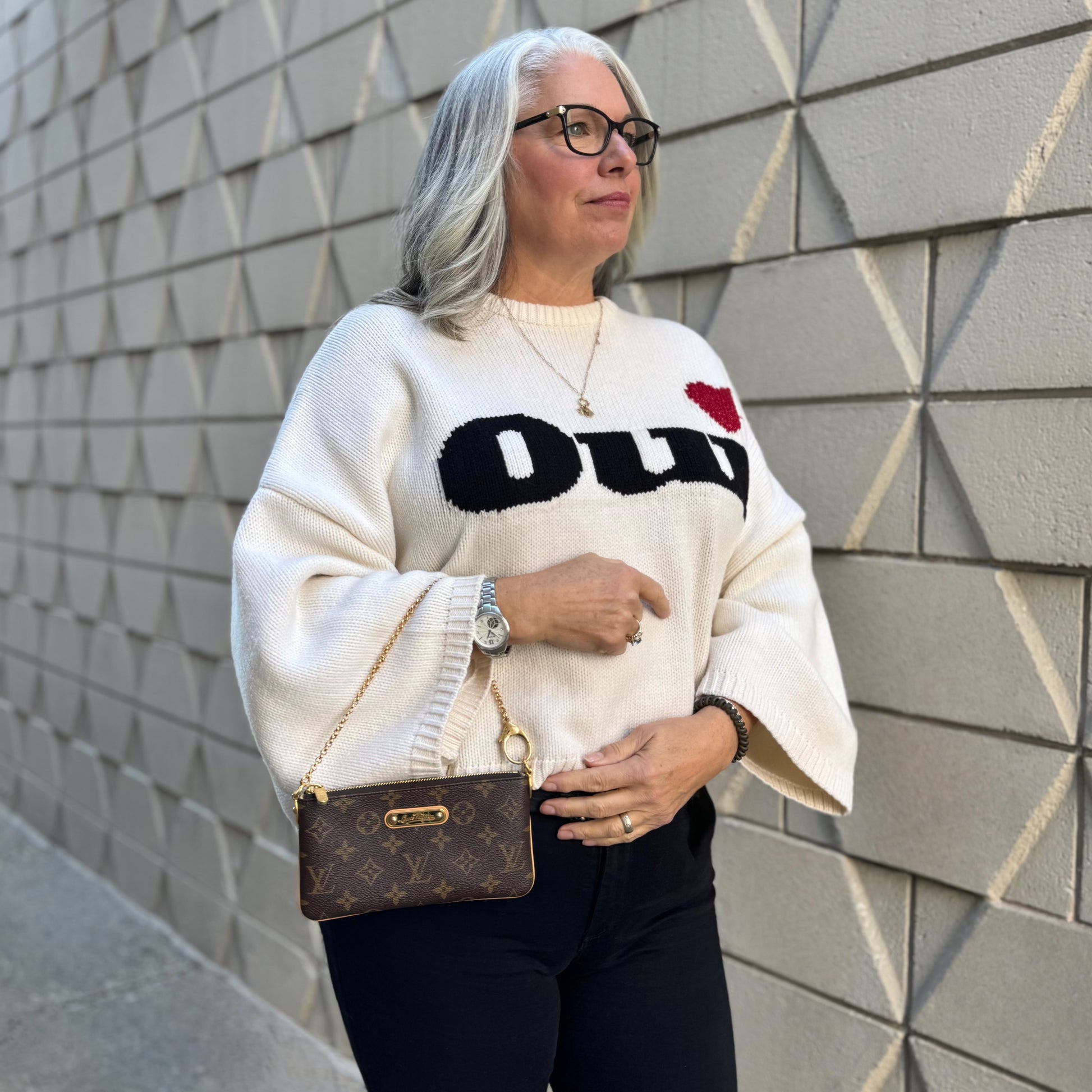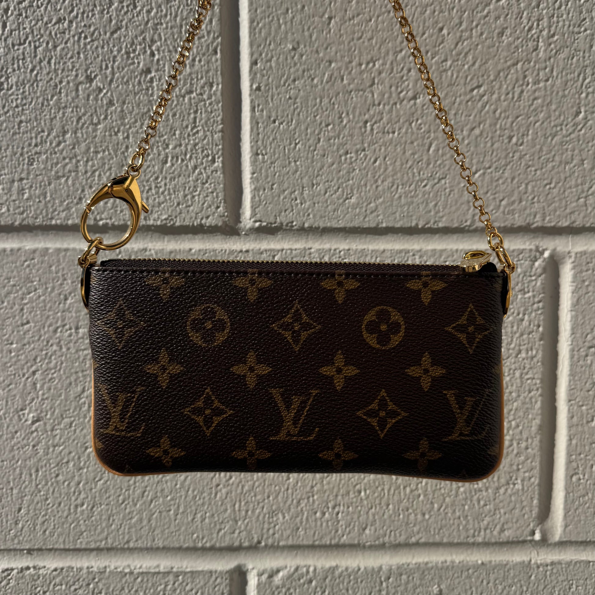 Hello Pretty! Crafted from monogram canvas with cowhide leather trim, gold-tone hardware, logo plate at the front, microfibre interior with patch pocket and chain-link top handle.