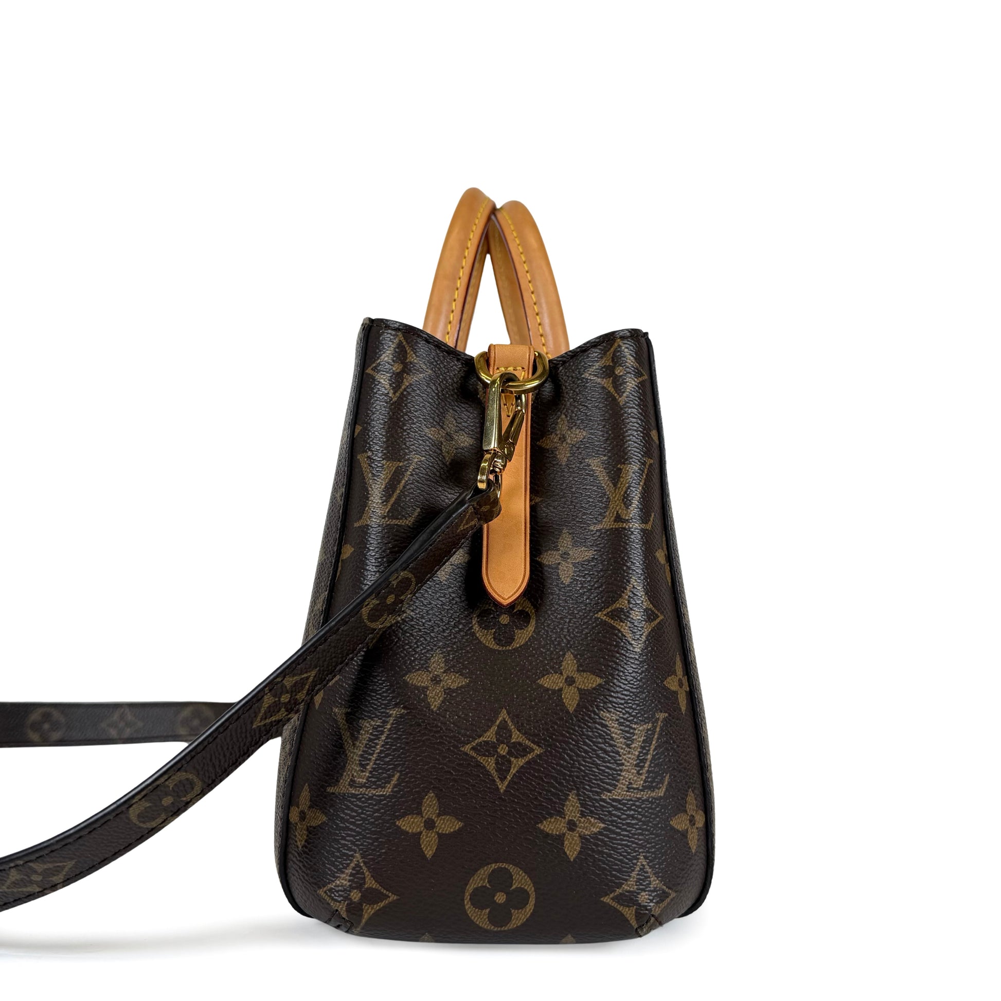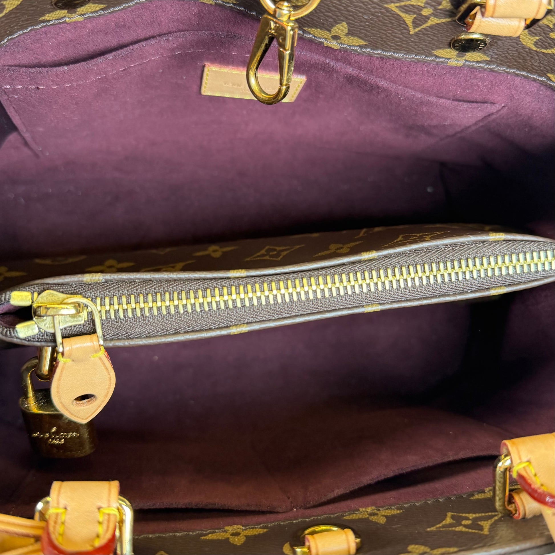 A crowd favorite. Won’t last long! Crafted from monogram canvas with Vachetta leather trim, gold-tone hardware, open top with hook closure, microfibre interior, dual rolled handles and removable shoulder strap.