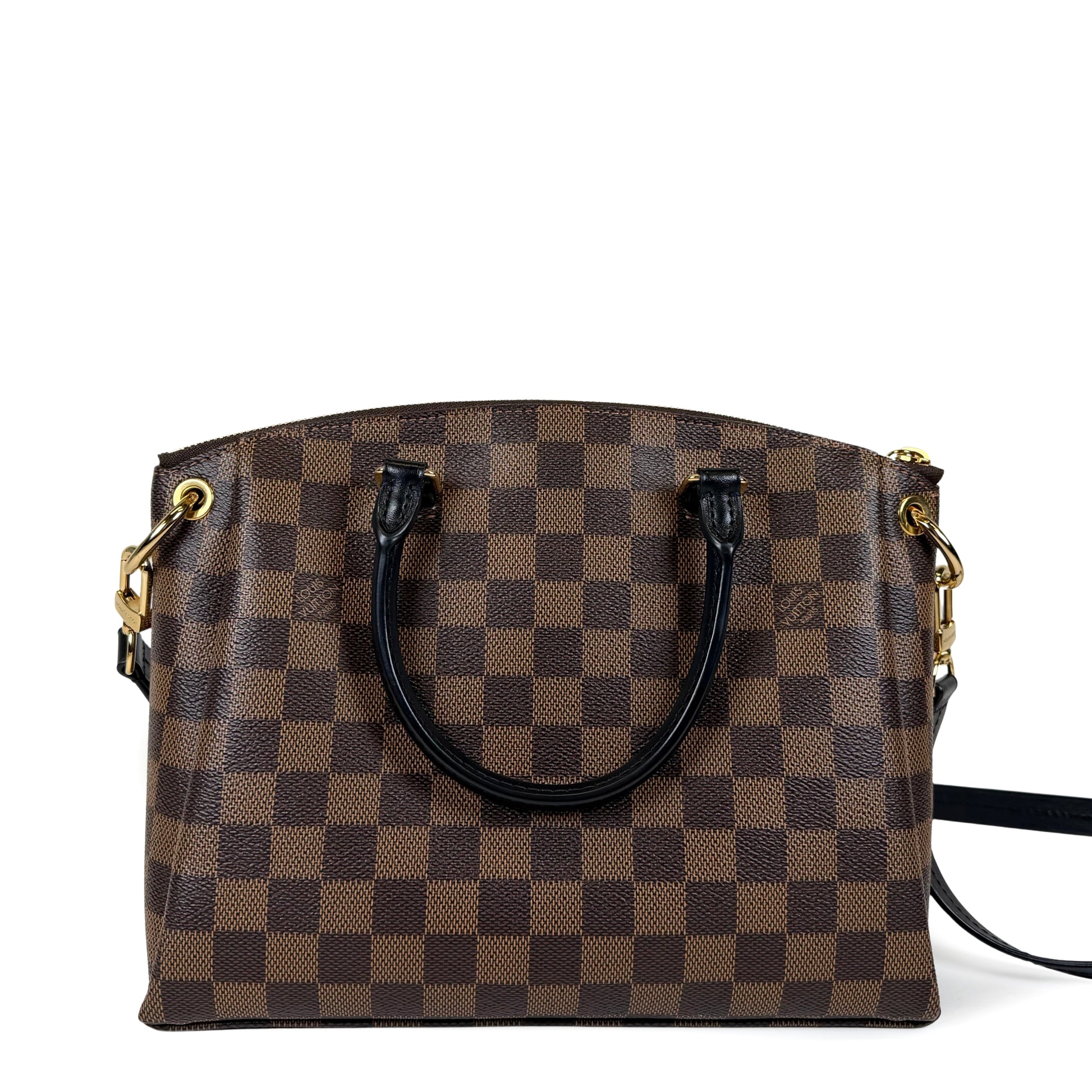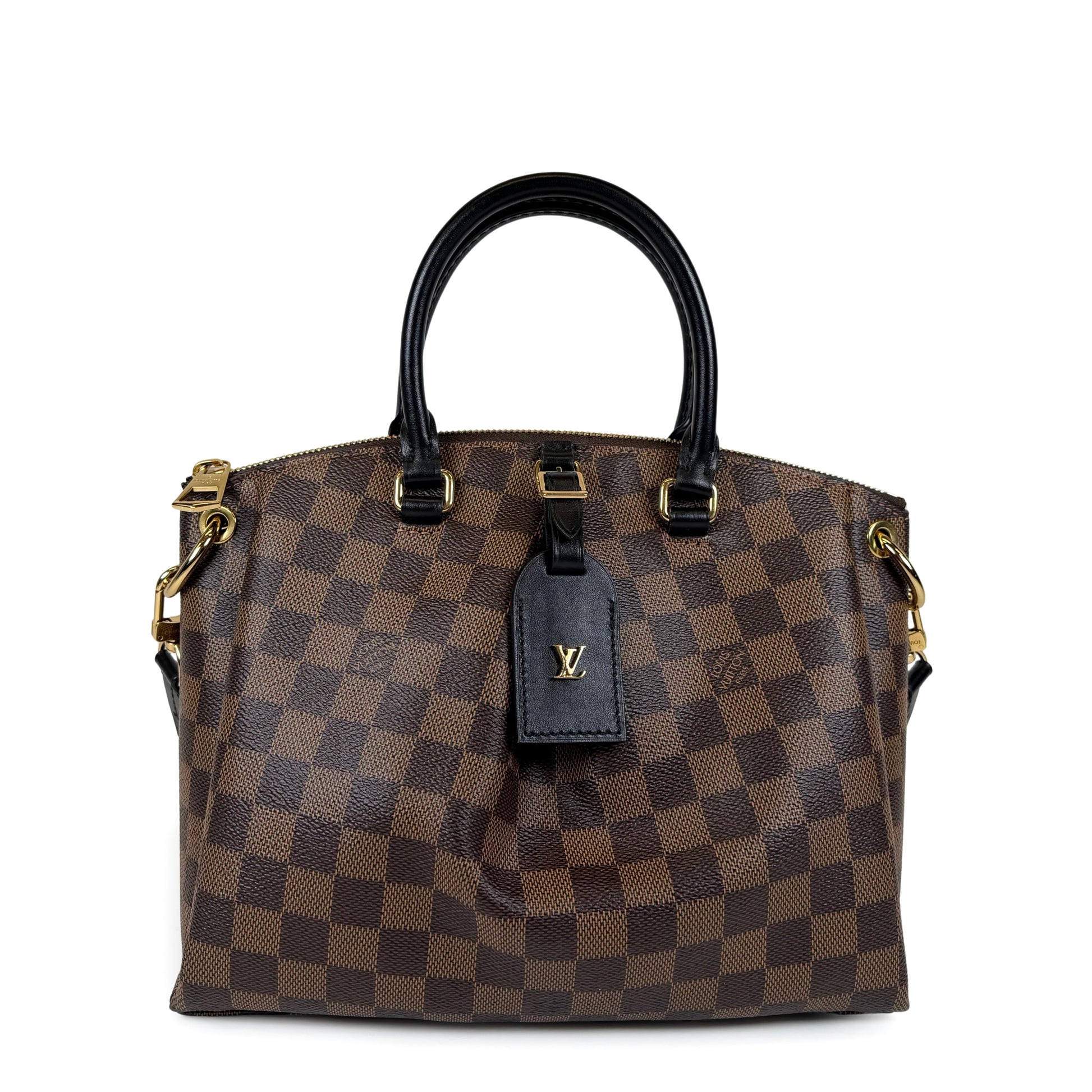 A beauty 🤎 Crafted from Damier Ebene coated canvas with black leather trim, gold-tone hardware, top zip closure, "LV" signature on the leather luggage tag, textile interior, dual rolled handles and removable adjustable strap. New price: $3600