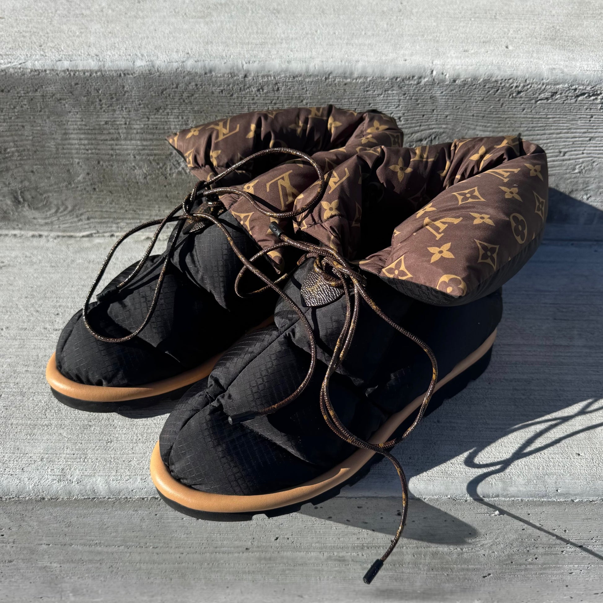 How fun! Crafted from quilted puffer nylon with padded construction, brown monogram-printed cuffs, adjustable lace-up front, beige leather trim and black rubber sole.
