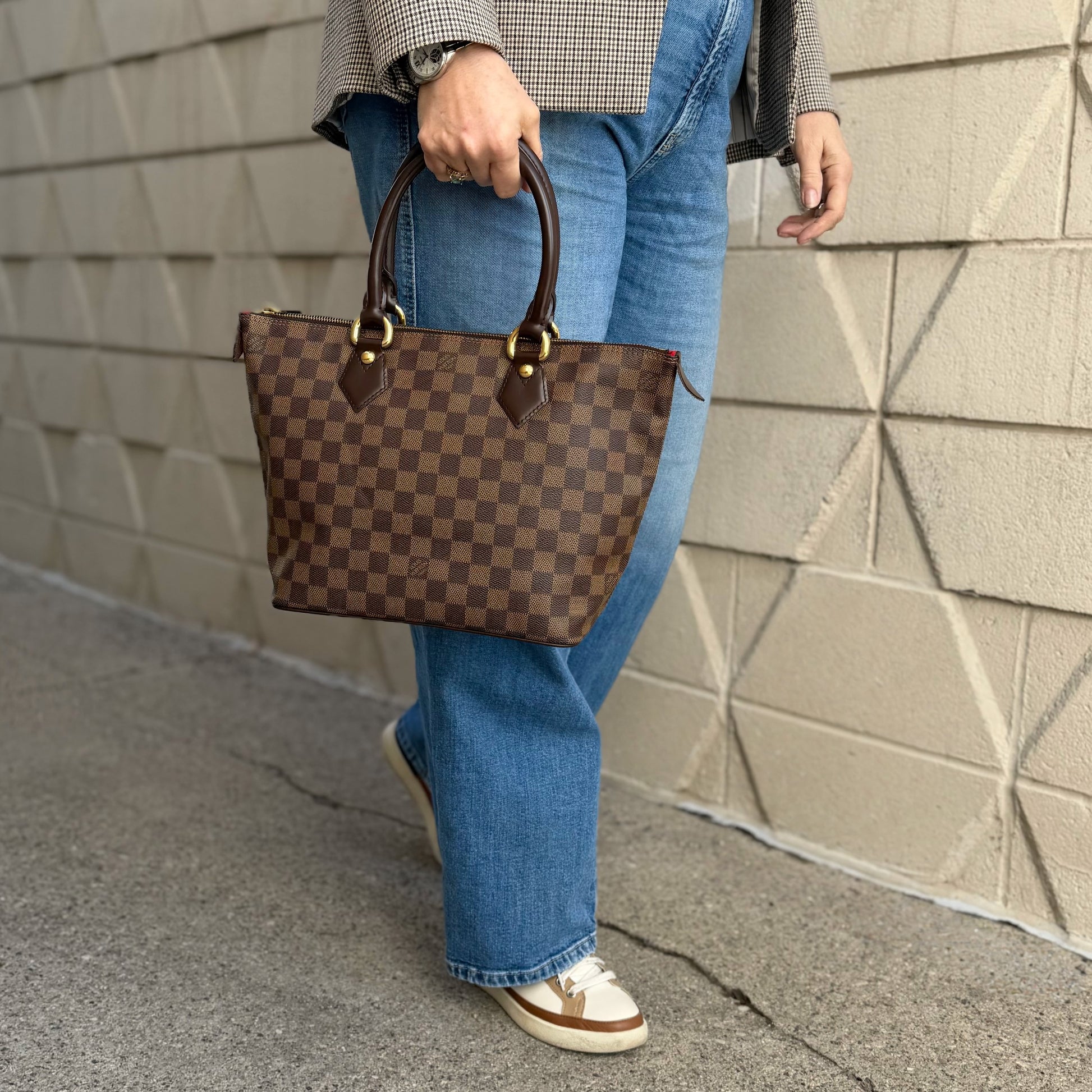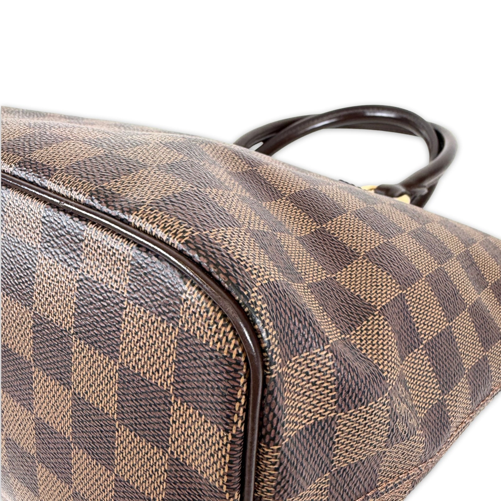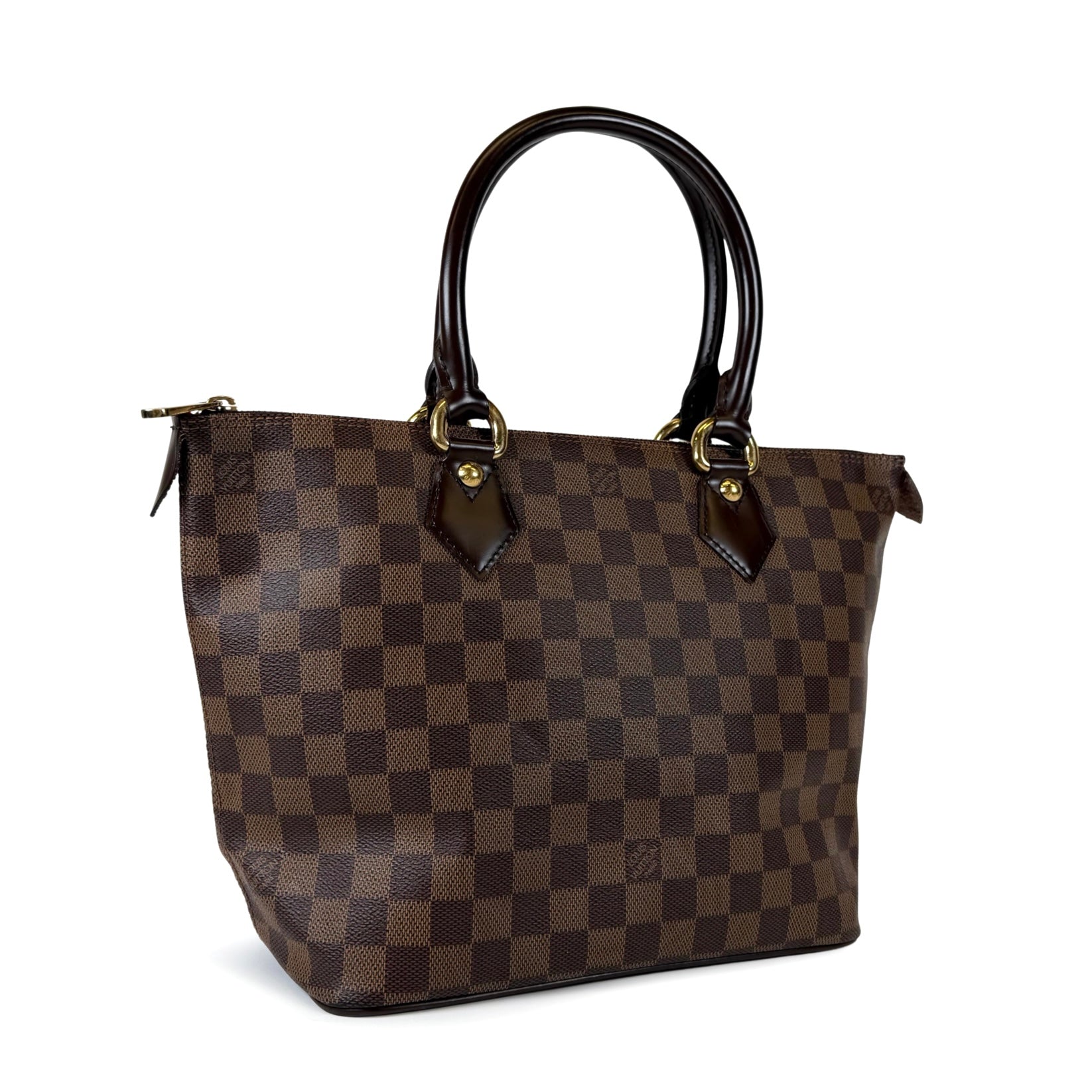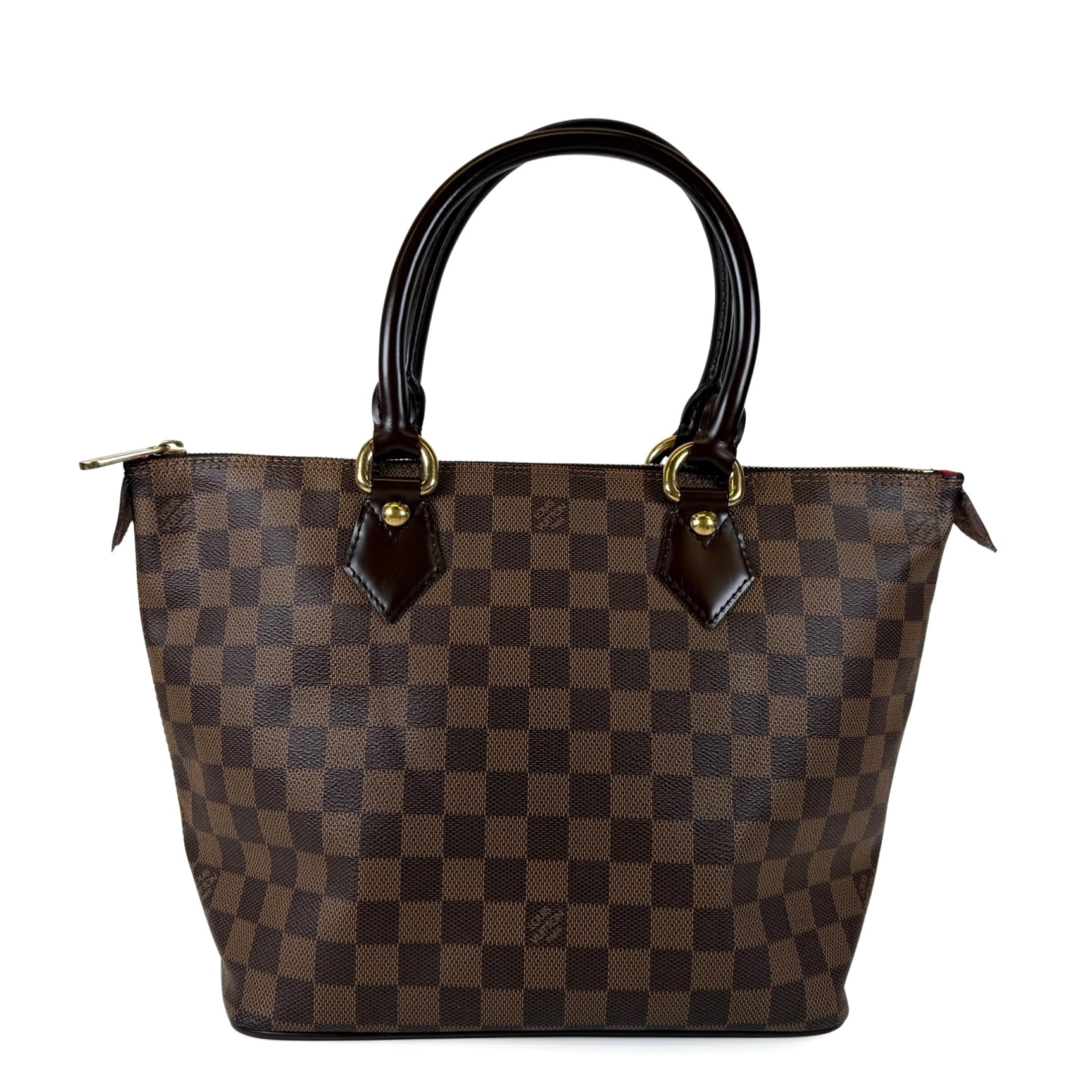 Keep it classic, keep it Damier. Crafted from Damier Ebene coated canvas with dark brown calfskin leather trim, gold-tone hardware, top zip closure, red microfibre interior, and dual rolled handles.