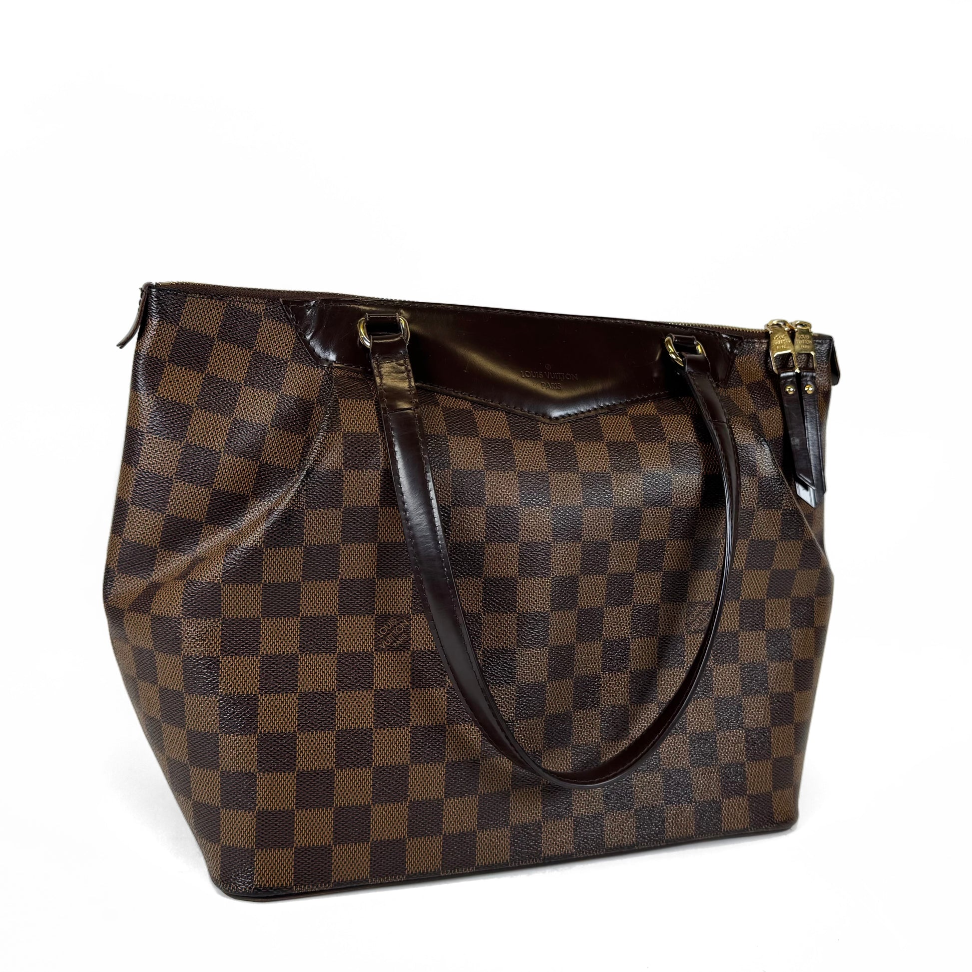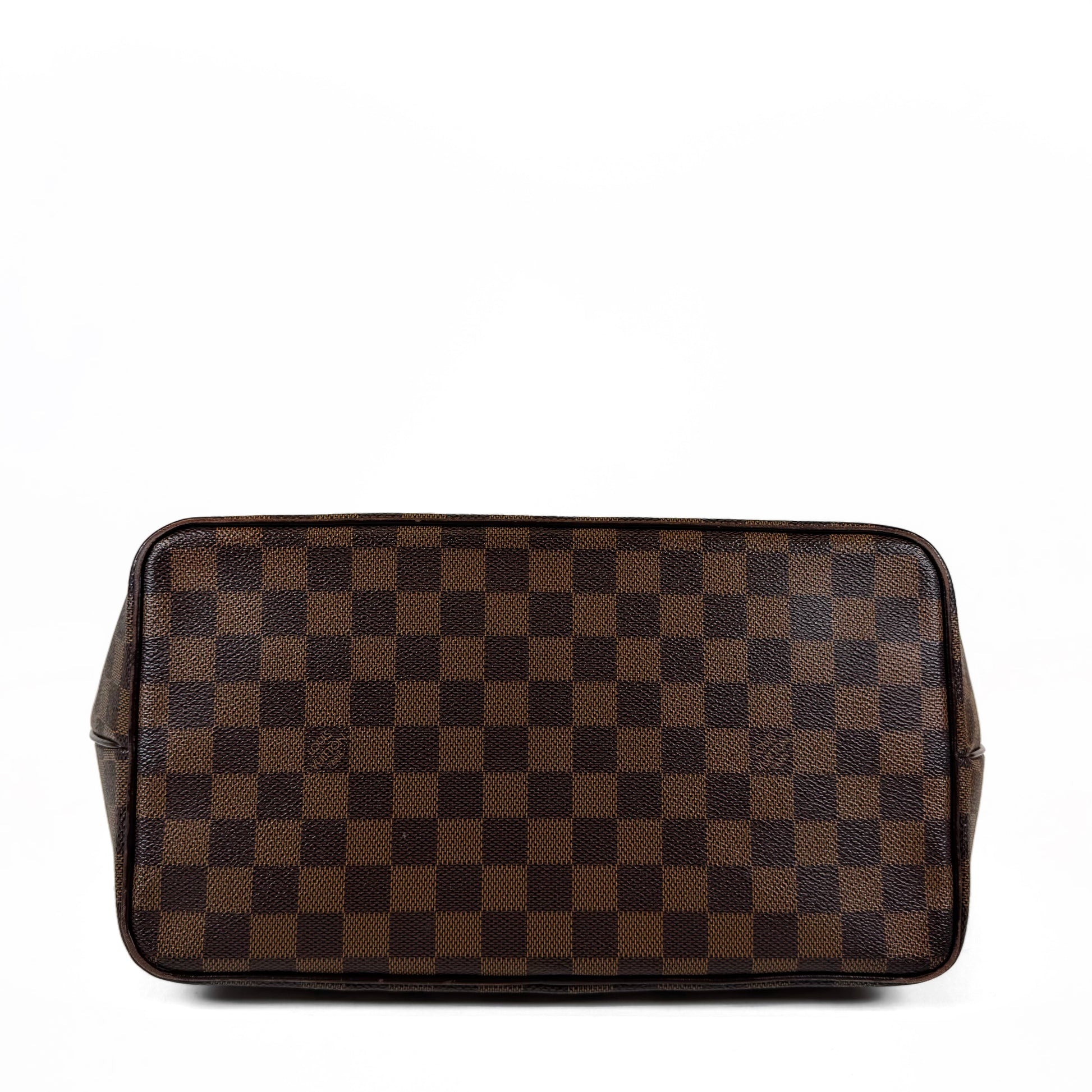 This workhorse won’t let you down. Crafted from Damier Ebene canvas with dark brown leather trim, gold-tone hardware, top zip closure, red textile interior and dual handles.