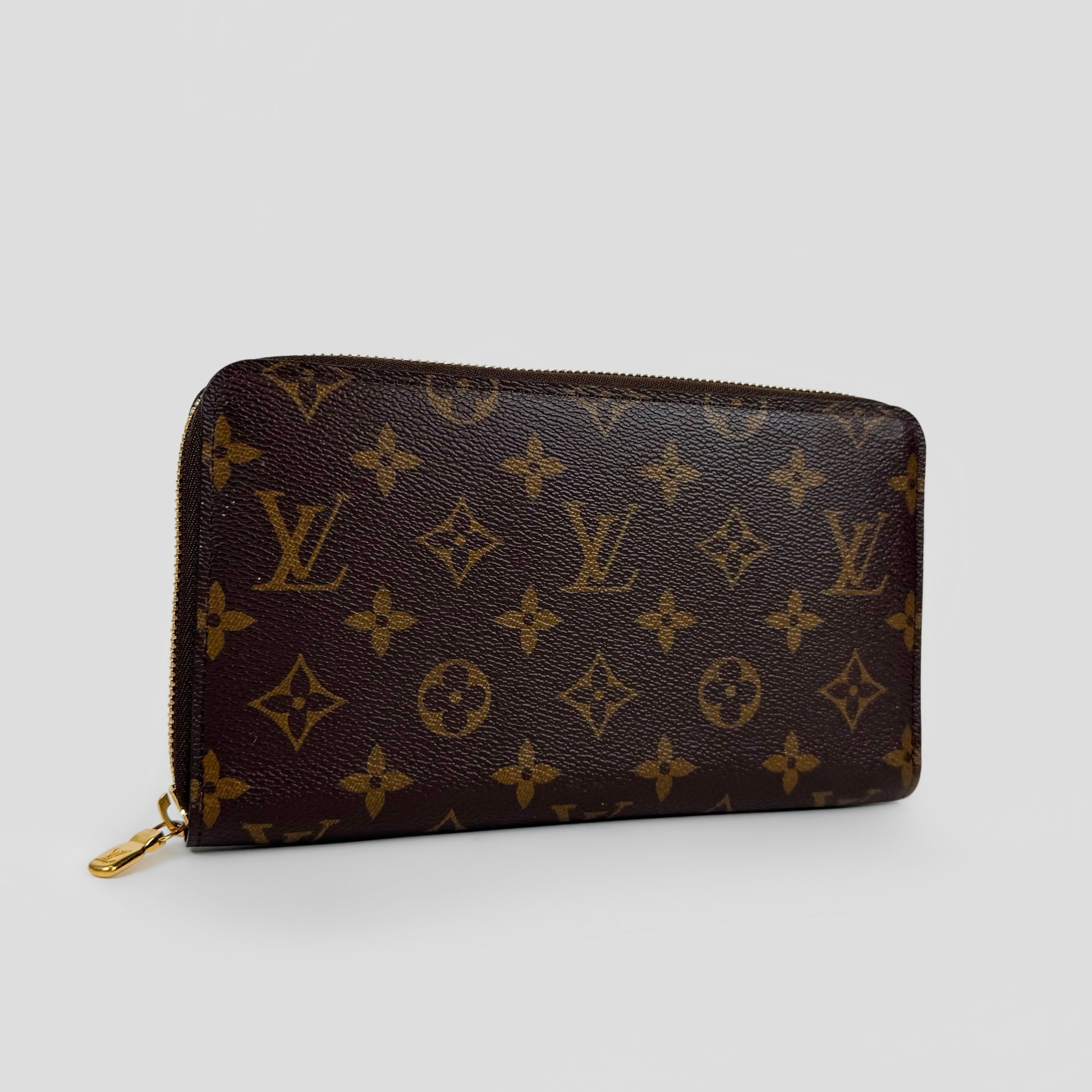 A rare piece. Crafted from monogram canvas with gold-tone hardware, zip around closure, caramel brown leather interior with multiple card slots, patch pockets, and zipper compartment.