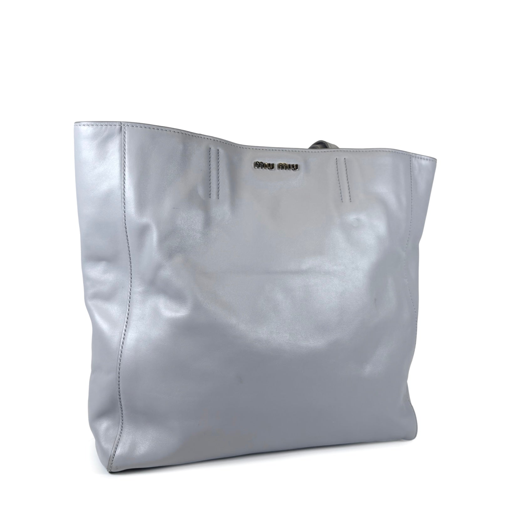 Crafted from soft Vitello leather with silver-tone hardware, “Miu Miu” metal logo, open top with magnetic snap closure, satin interior and dual flat handles.