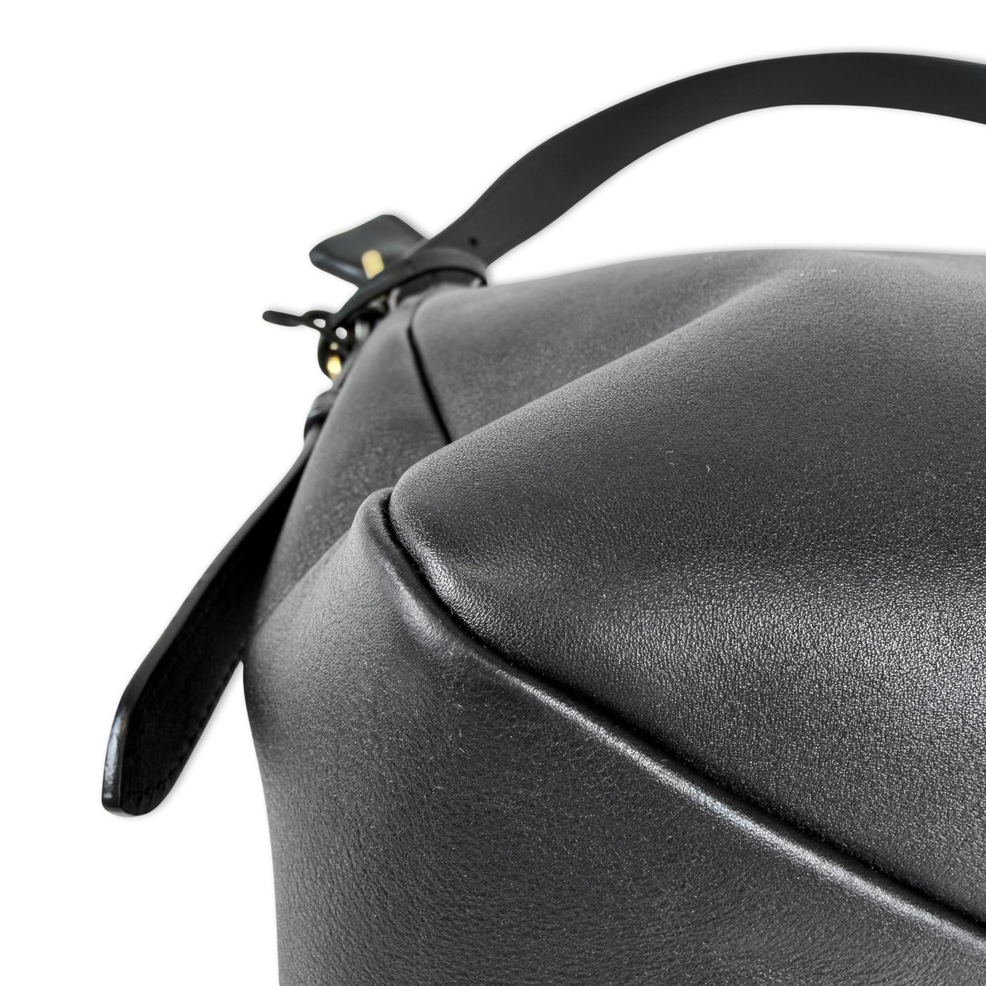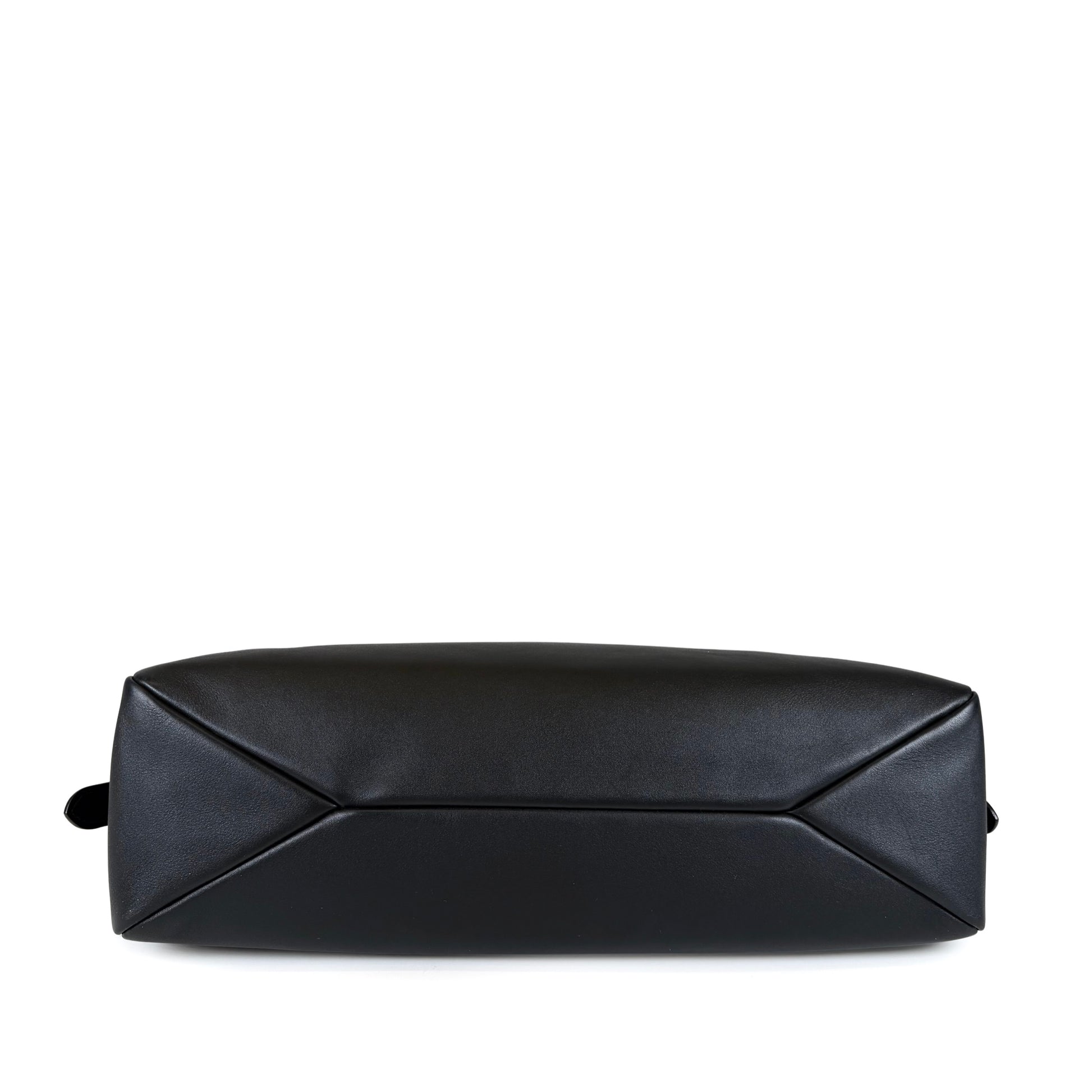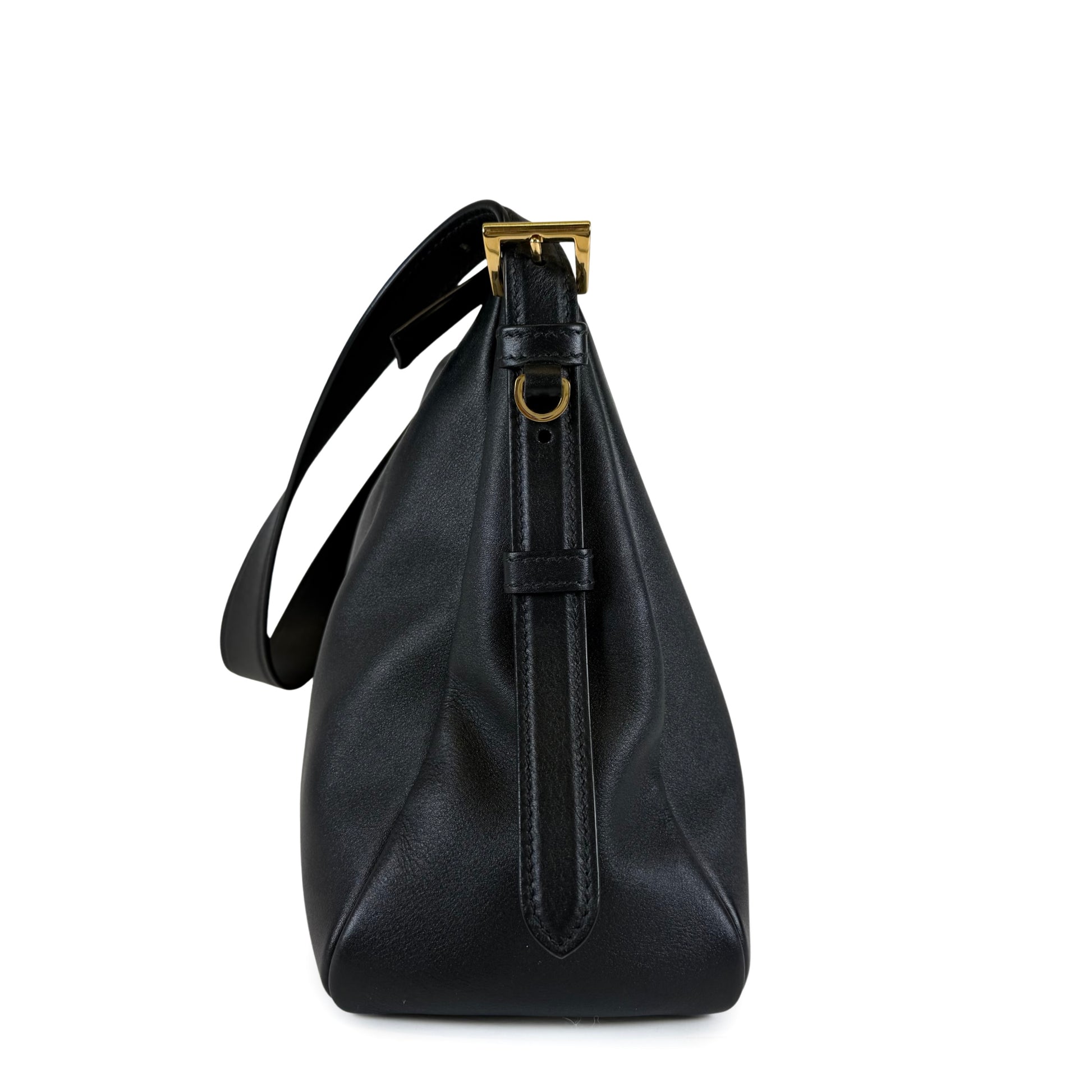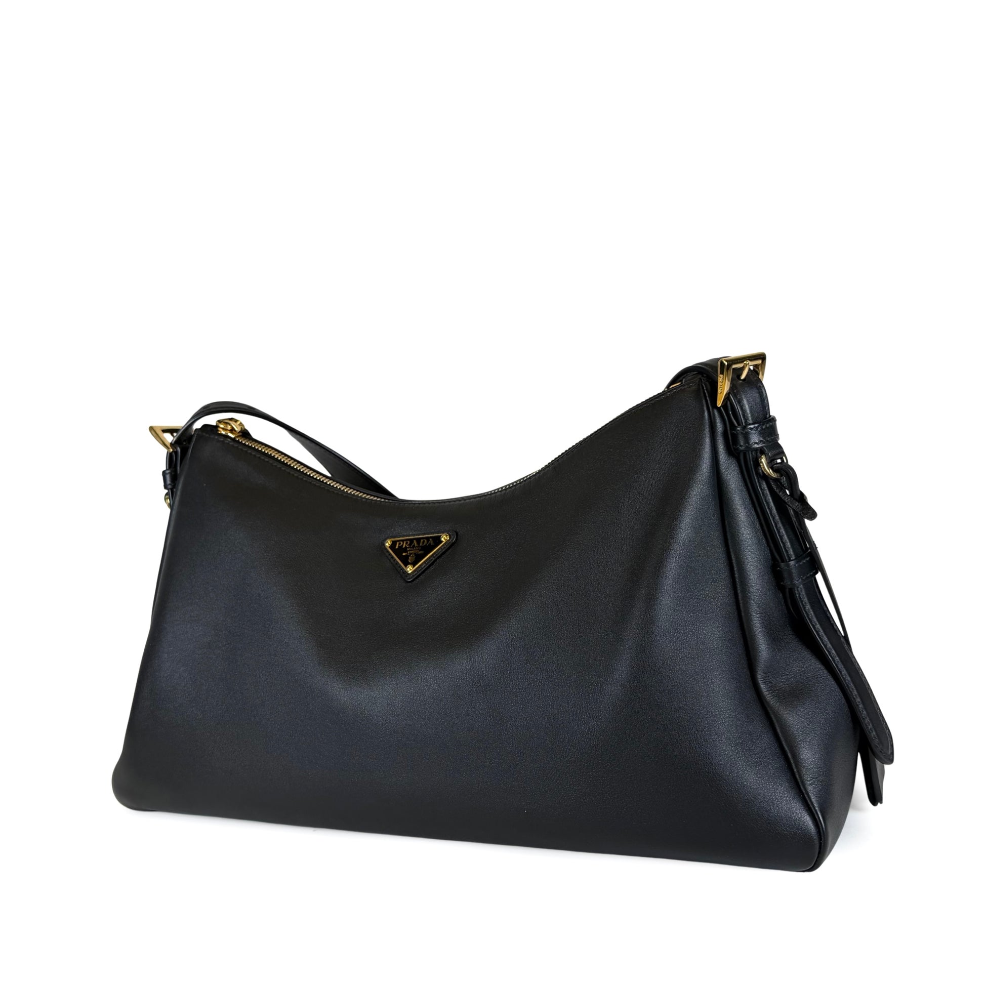 Simplicity is the ultimate sophistication. Crafted from smooth calf leather with gold-tone hardware, signature triangle logo, top zip closure, leather interior and adjustable shoulder strap.