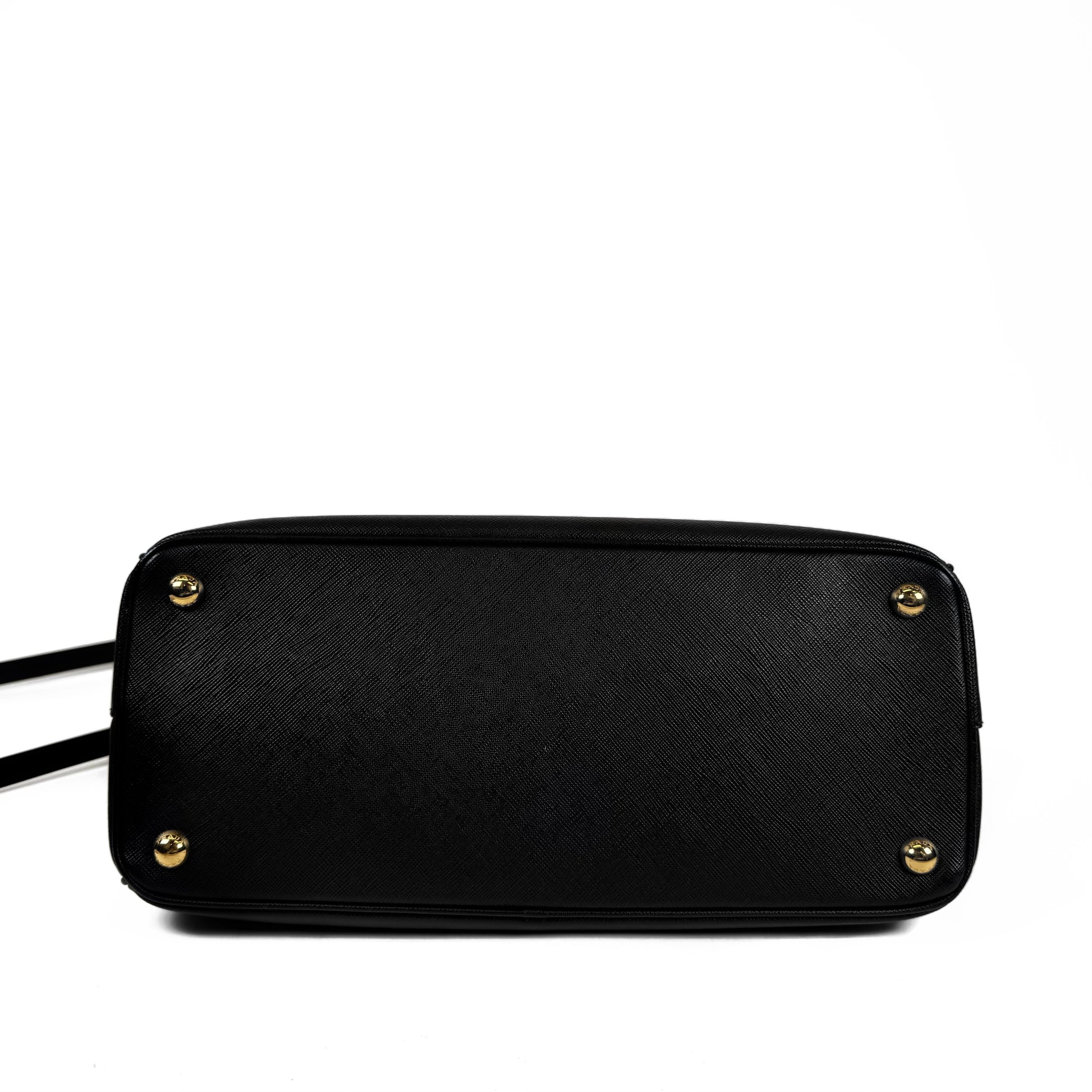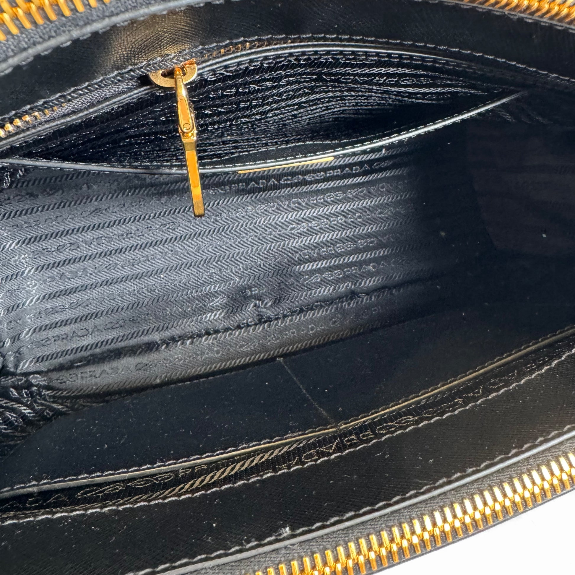 Beauty 🖤 Crafted from Saffiano leather with gold-tone hardware, signature triangle logo, top zip closure, silk scarf, two rolled handles, removable shoulder strap and protective feet at the bottom. New price: $6800