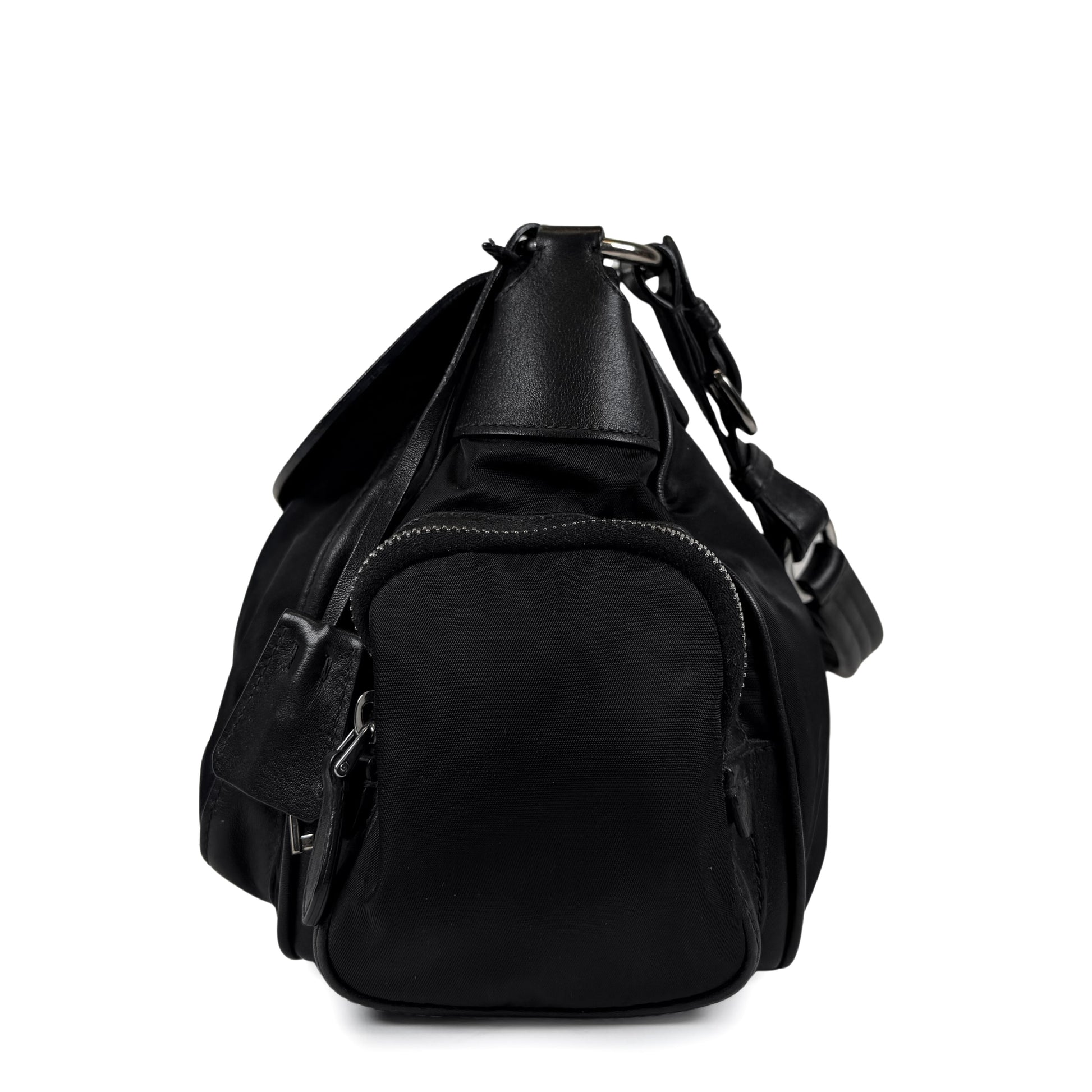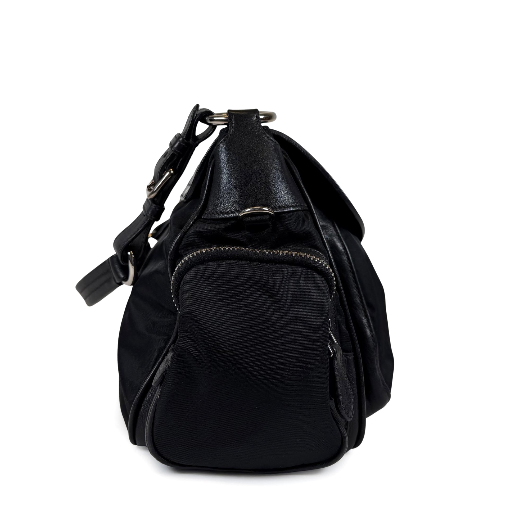 Bag it up, Buttercup. Crafted from Tessuto nylon with calfskin leather trim, silver-tone hardware, push-lock closureon the front flap, two side zip pockets, textile interior and single adjustable shoulder strap with decorative metal rings and buckles.