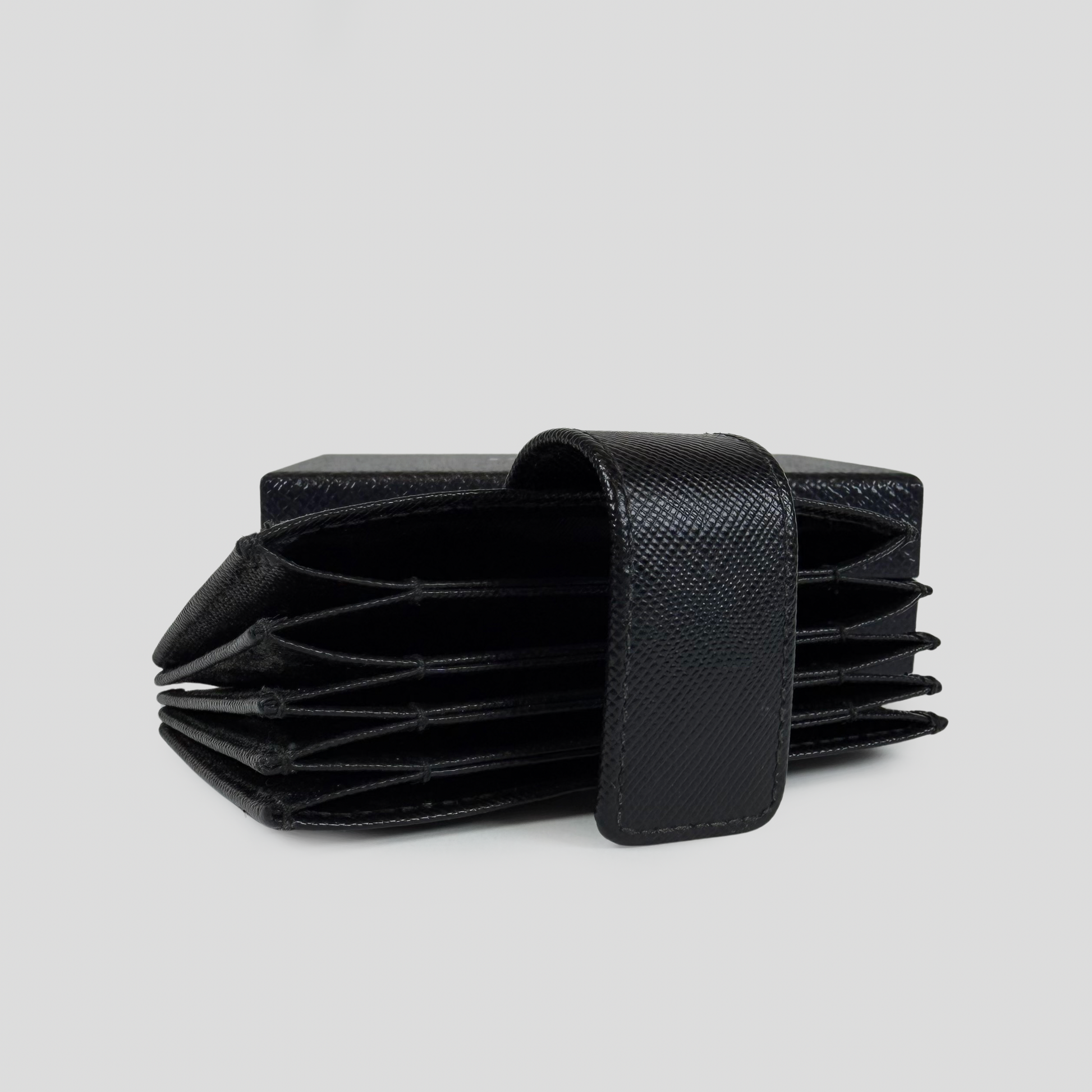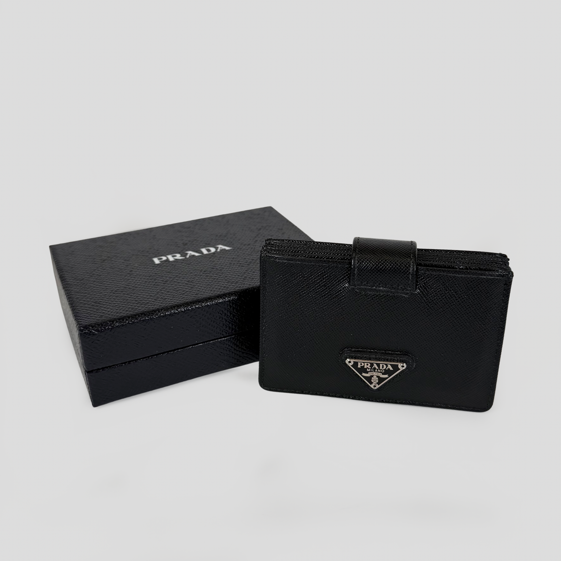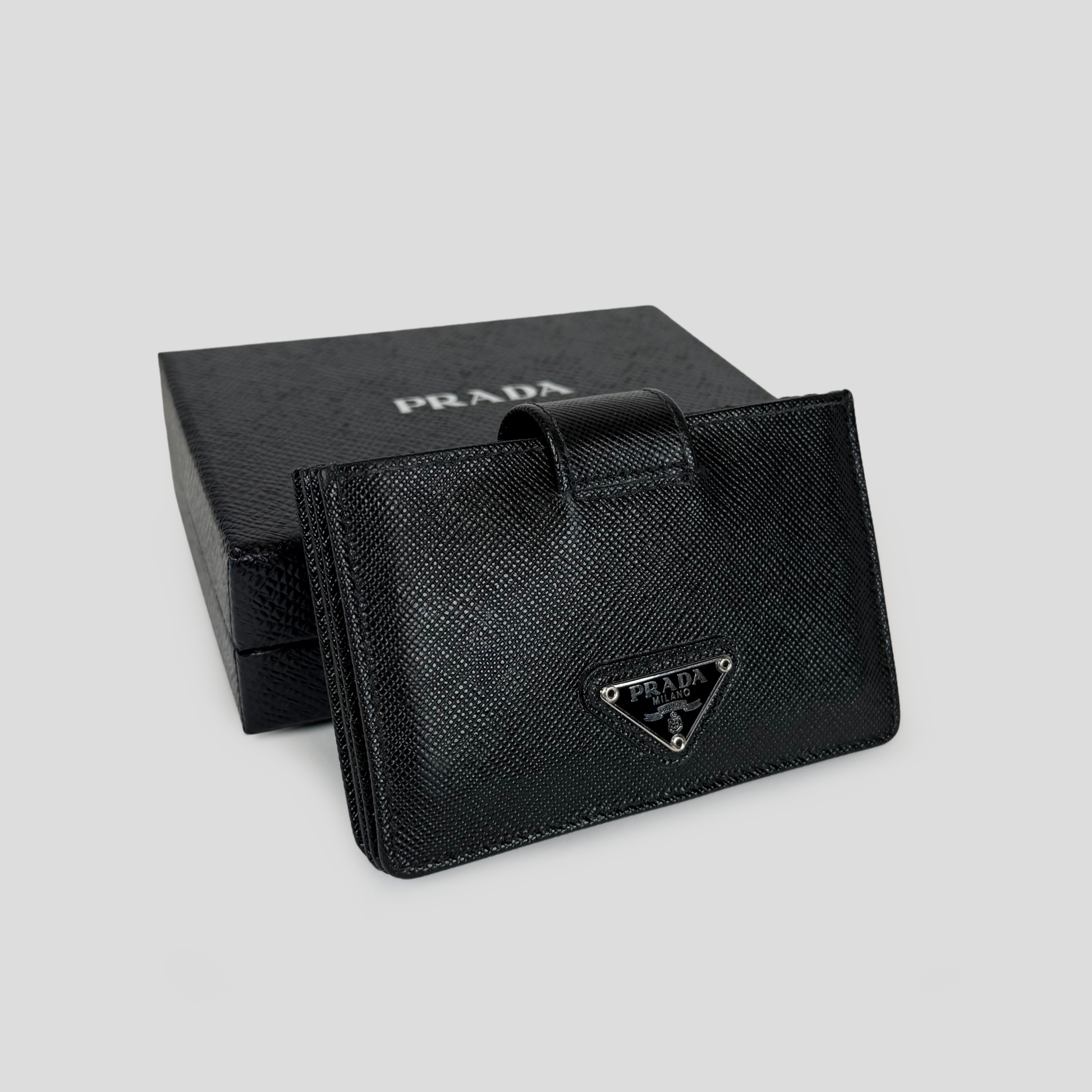 Perfect for your small bag. Crafted from Saffiano leather with silver-tone hardware, signature enameled metal triangle logo, press-stud closure and 5 card slots.