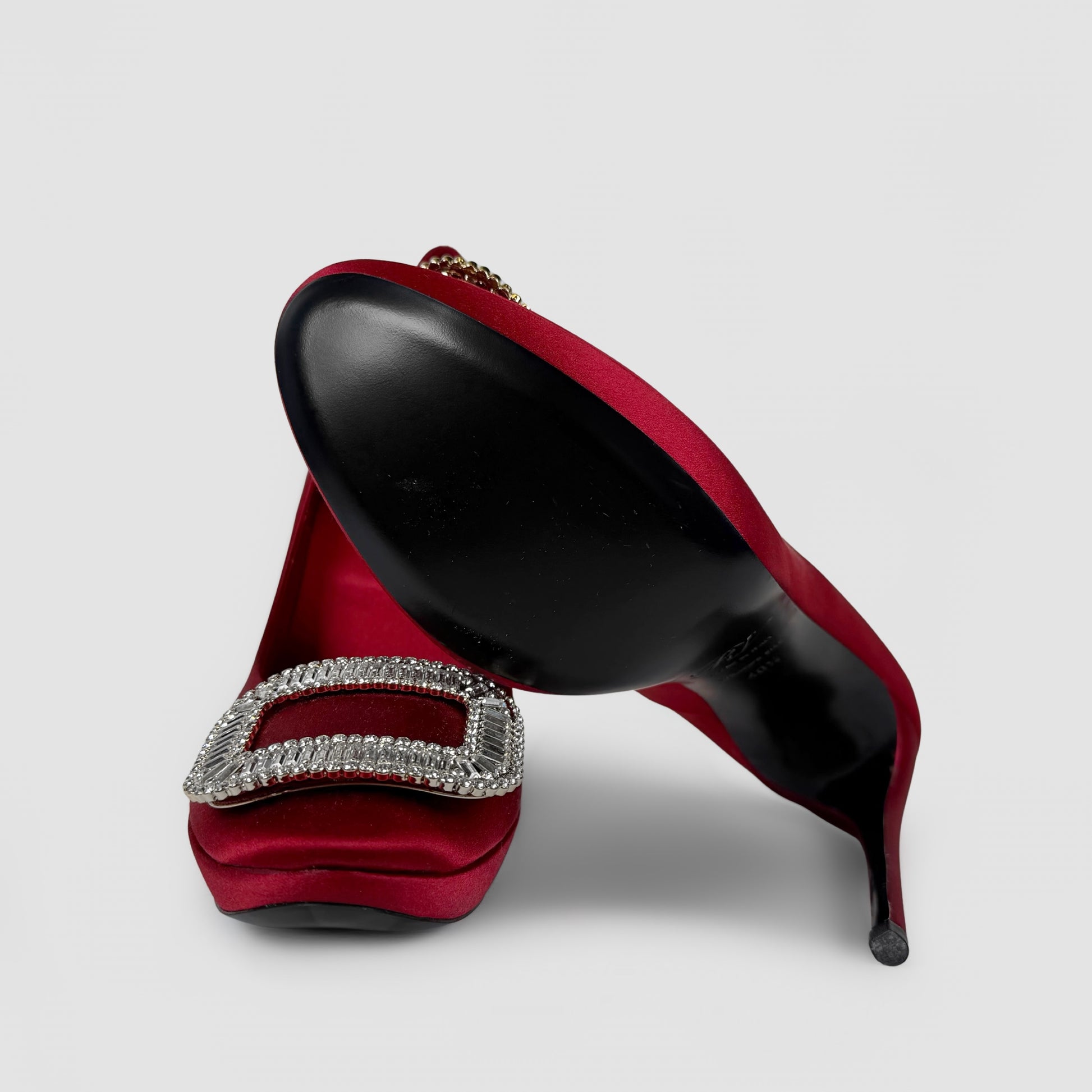 All eyes on the red. Crafted from satin with Swarovski crystal-studded buckle, rounded toe, platform sole and a tall stiletto heel.