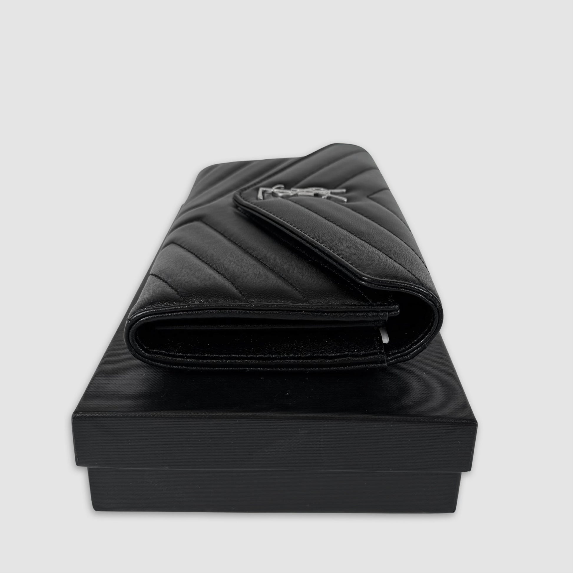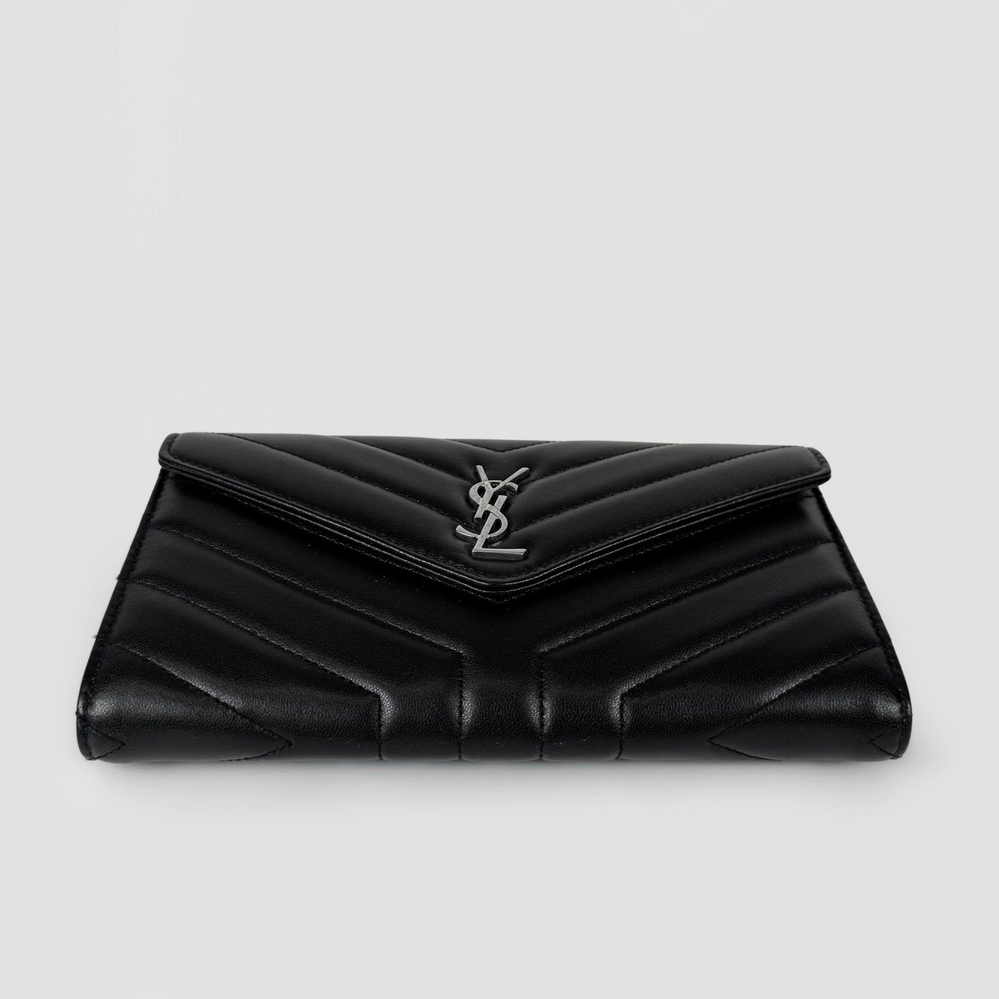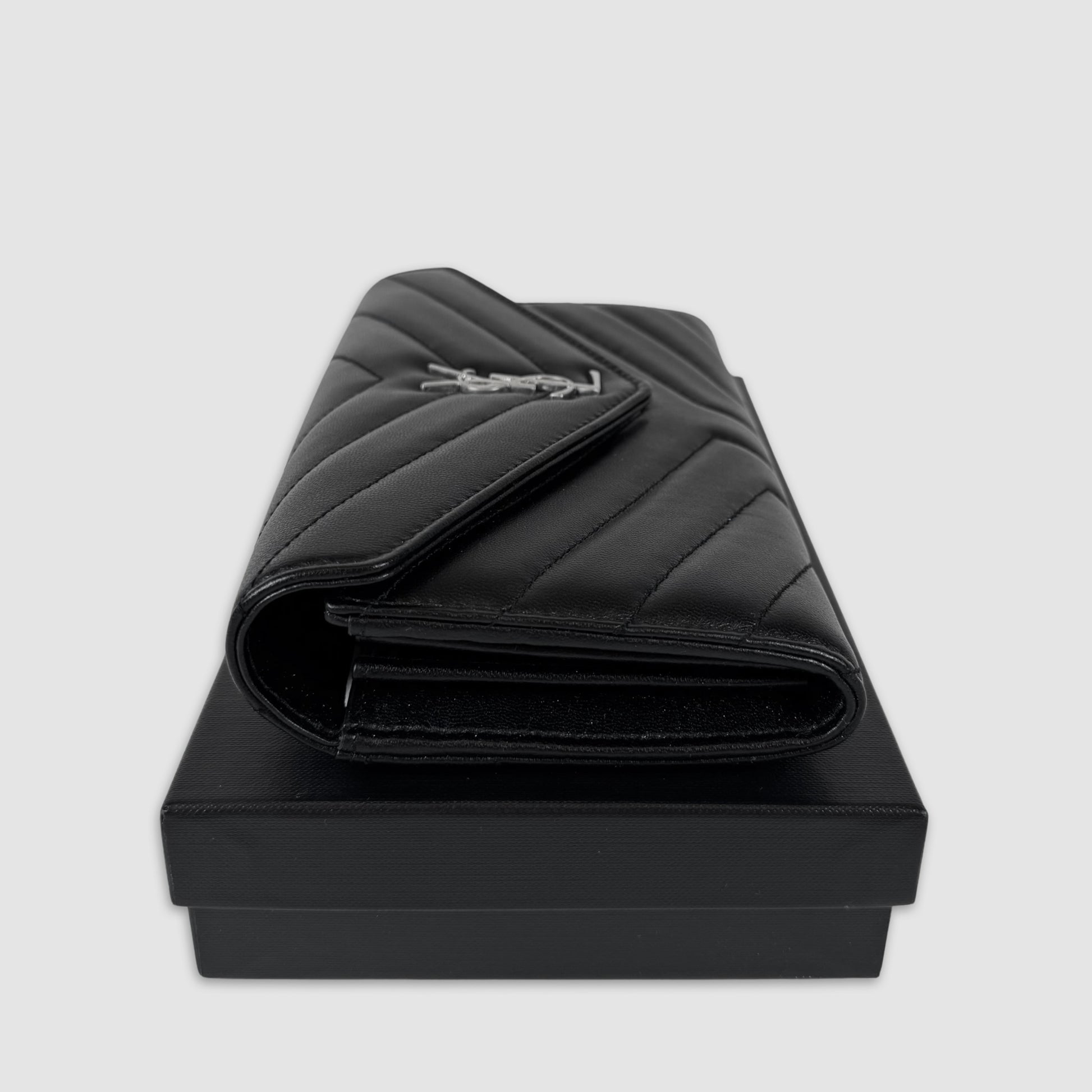 🖤 Giftable. Crafted from chevron quilted calfskin leather with silver-tone YSL logo on the front, press-stud closure, leather interior with multiple card slots, and zipper compartments. New price: $1500