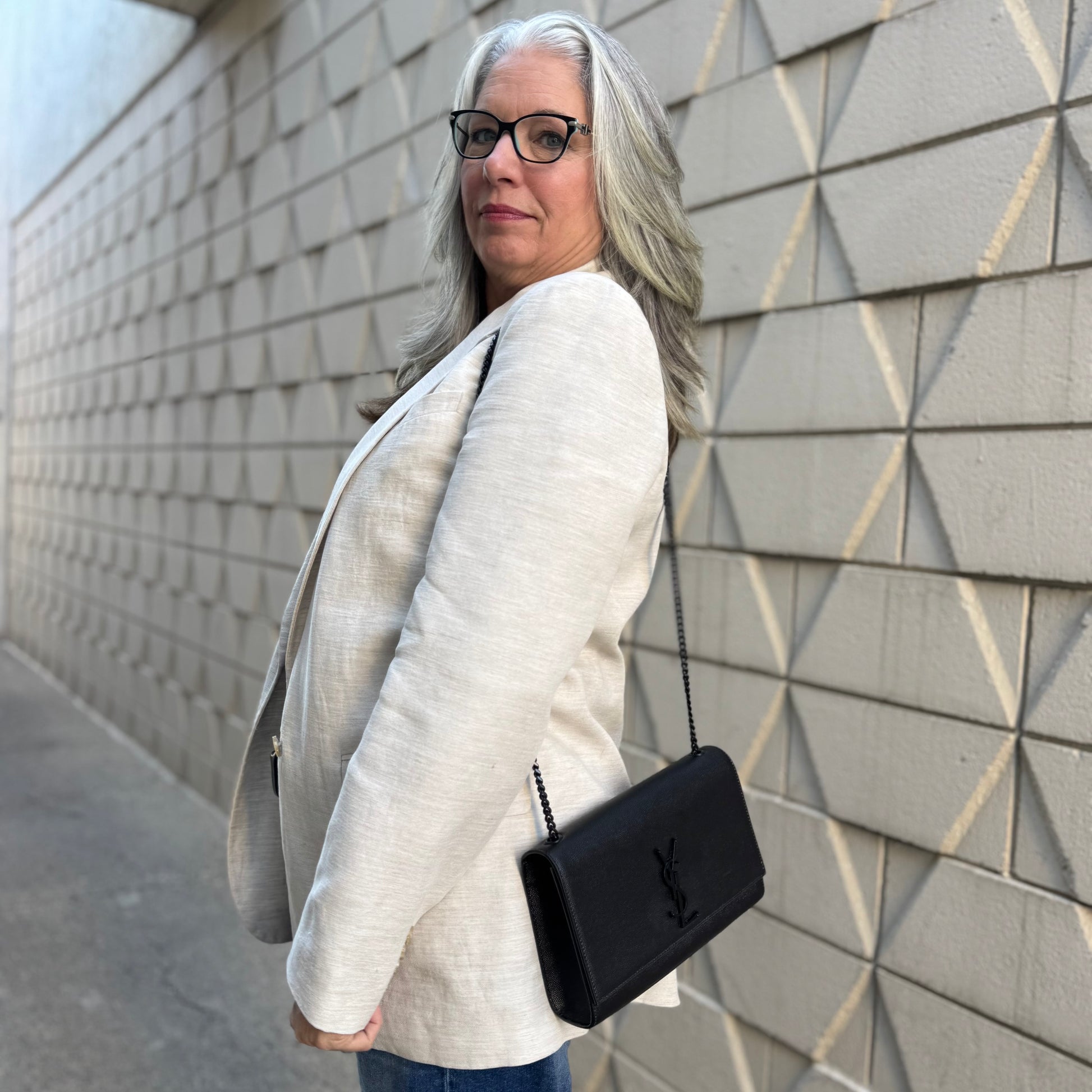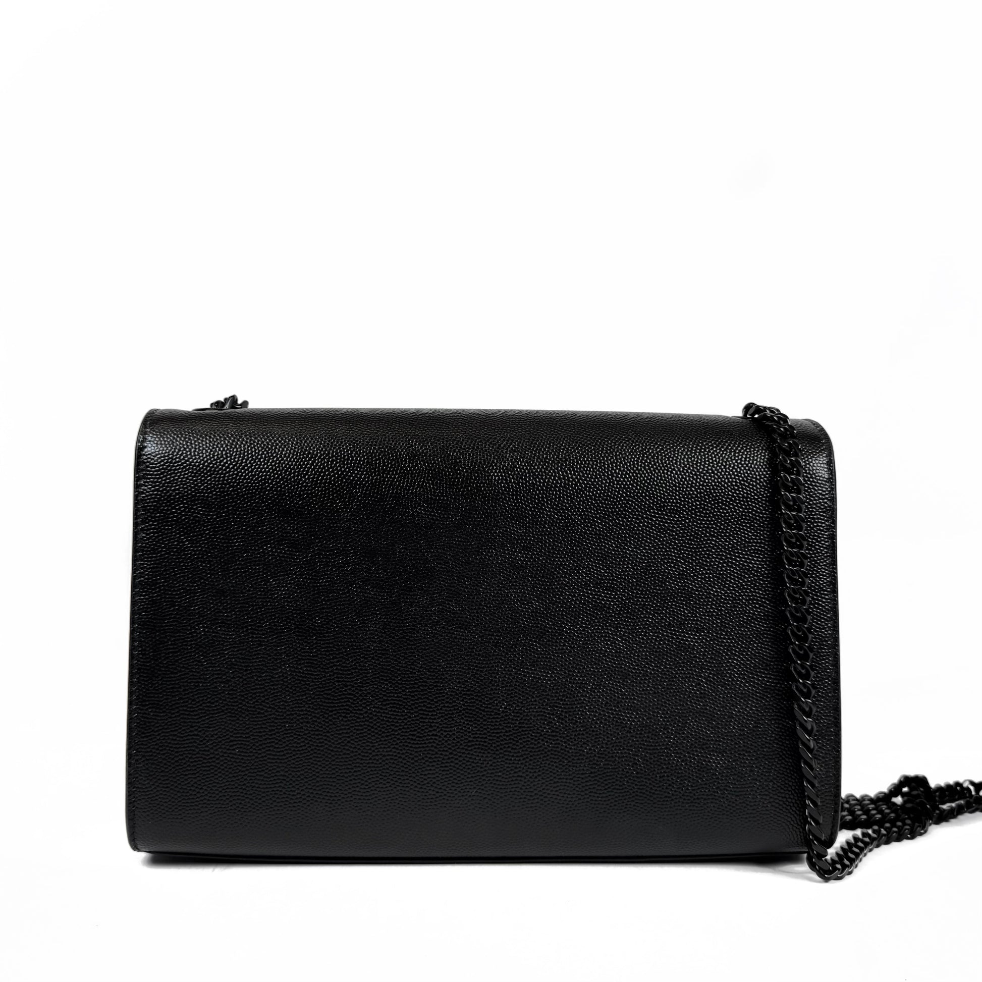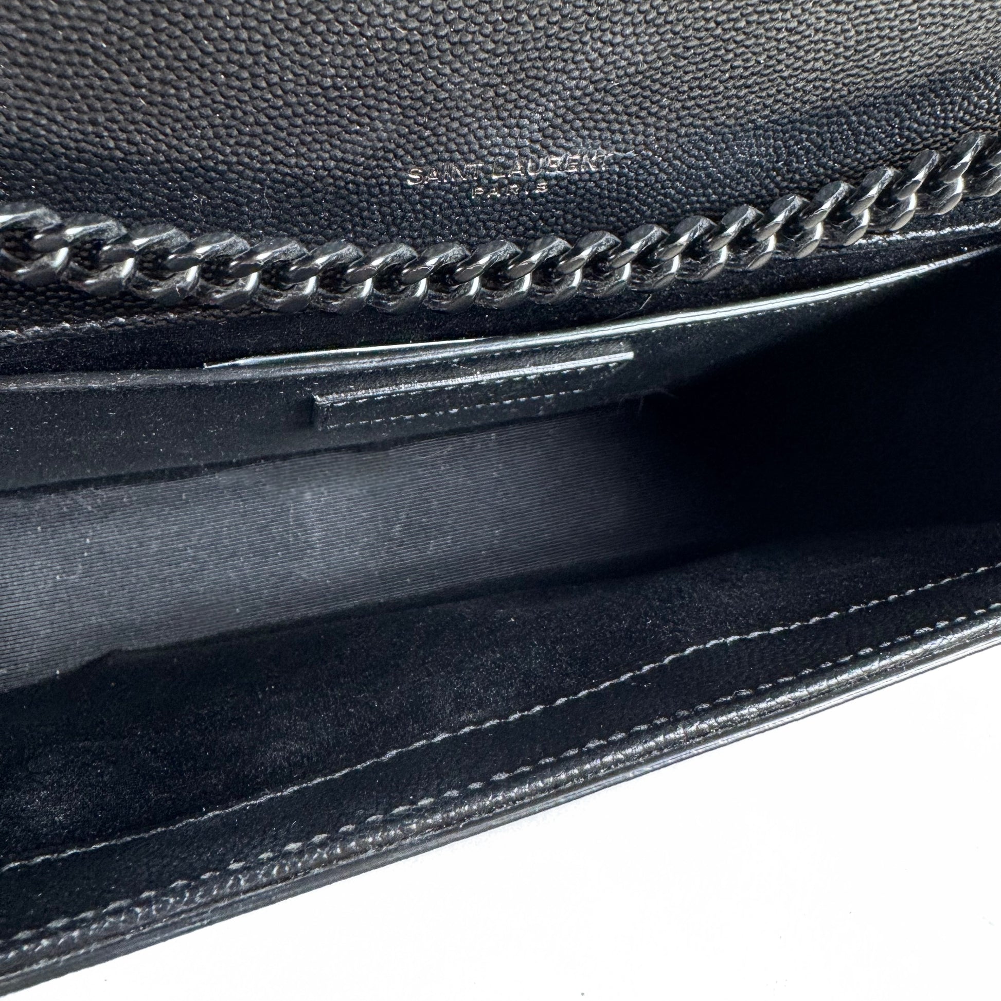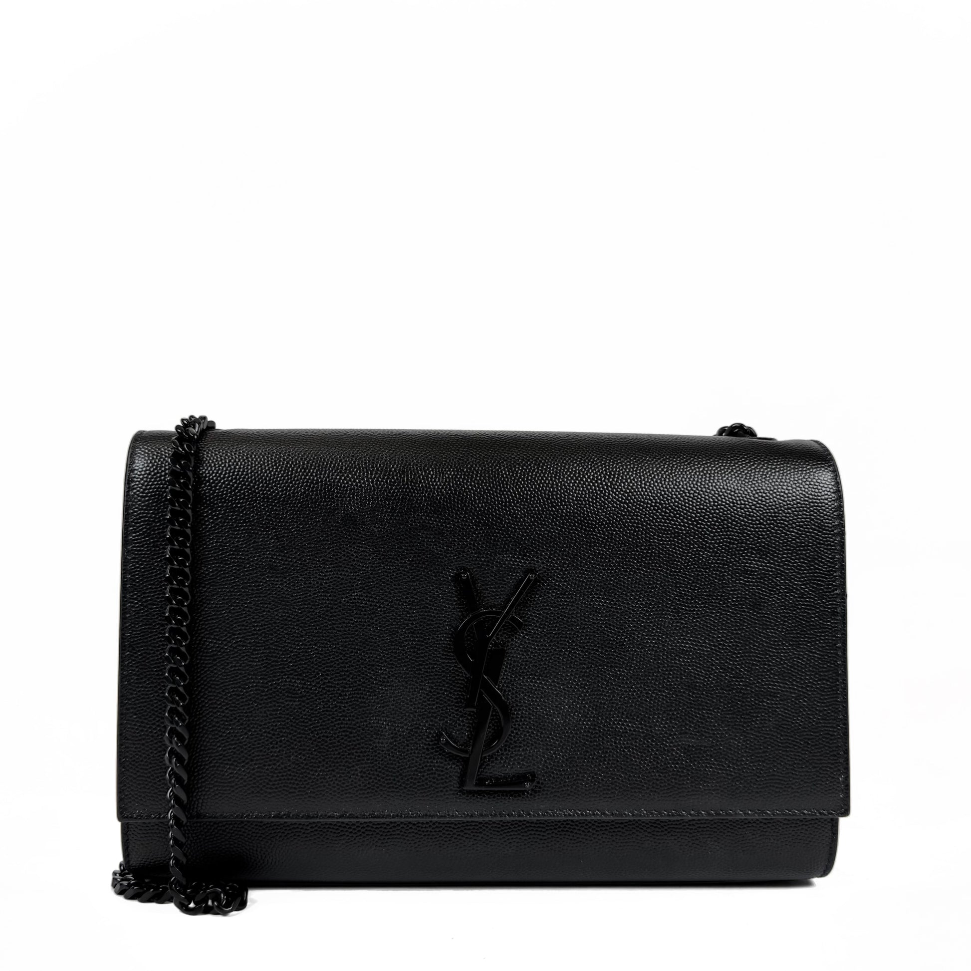 Two please! Crafted from grain calfskin leather with matte black-tone metal YSL logo on the front, front flap with snap button closure, textile interior with patch pocket and chain-link shoulder strap. New price: $3340