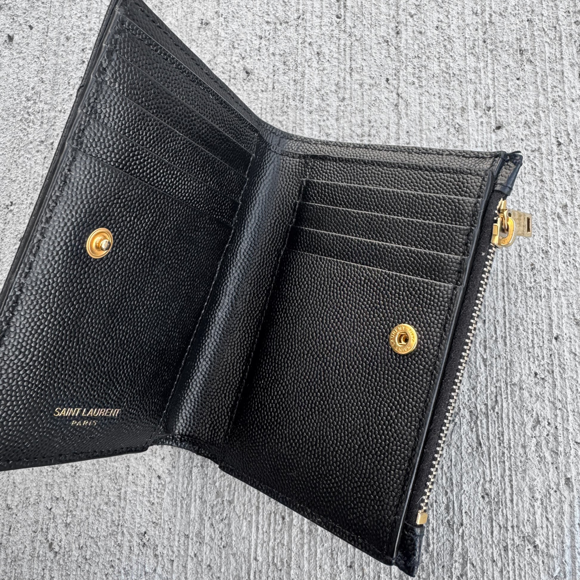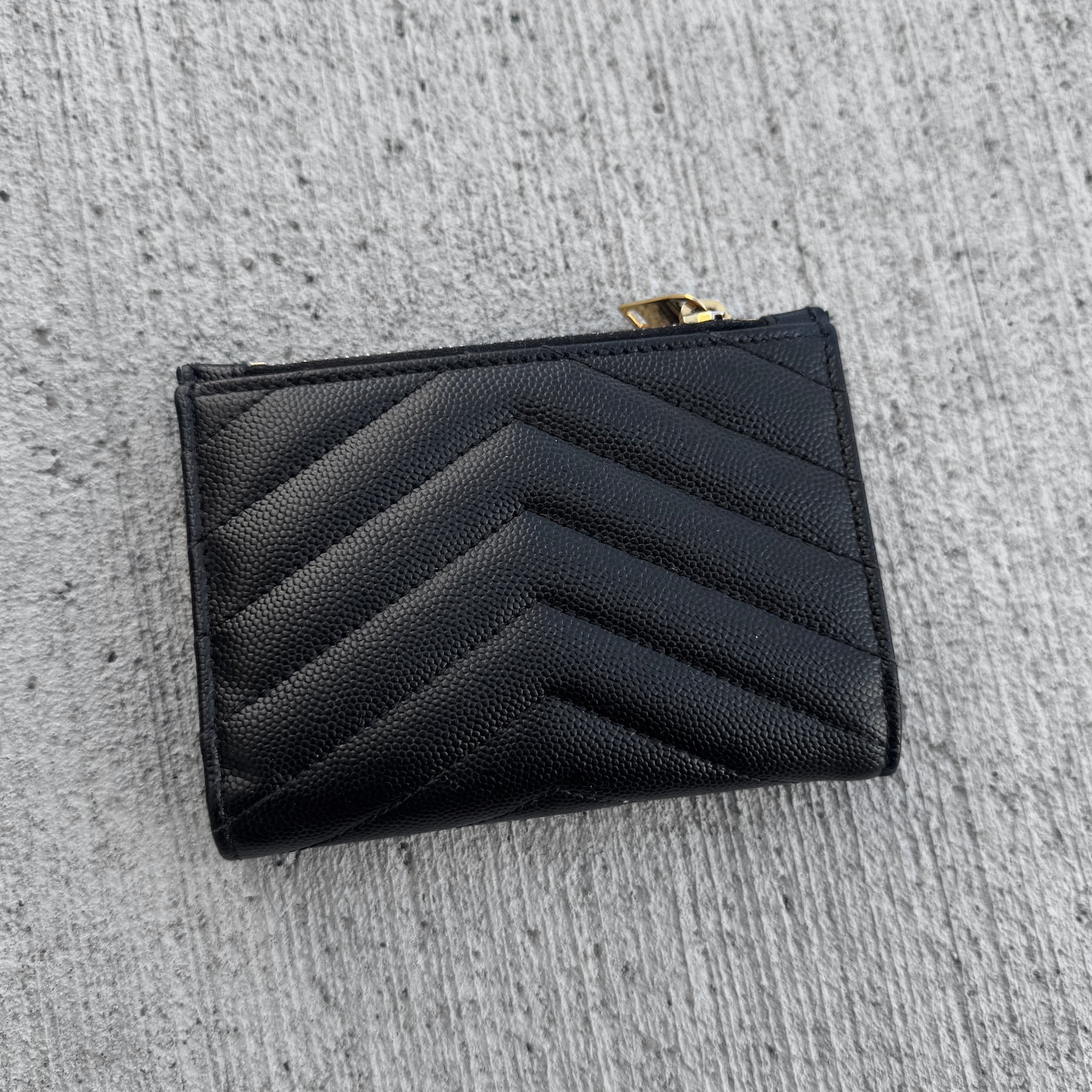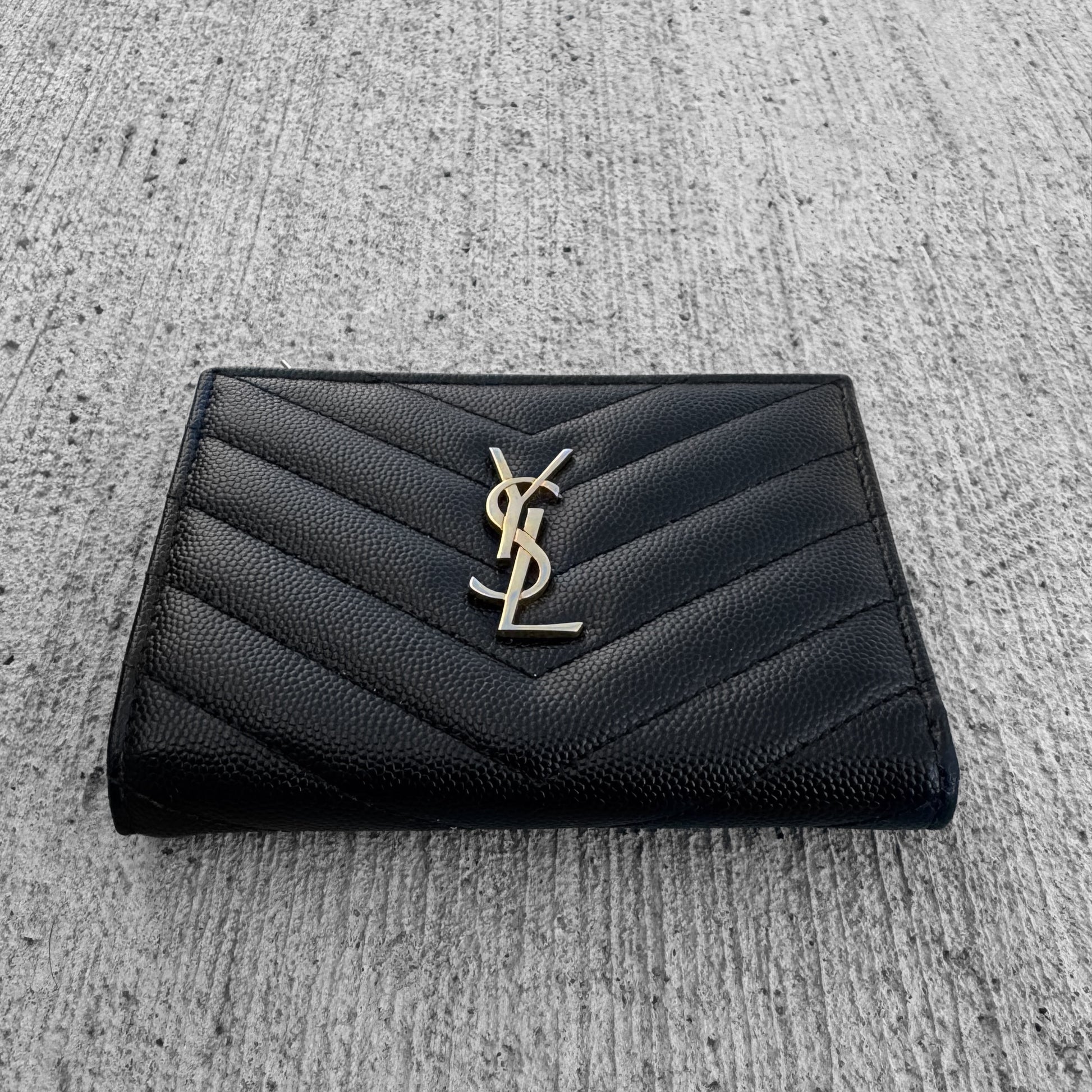 Hello Gorgeous ❤️ Crafted from chevron quilted grain calfskin leather with gold-tone YSL logo on the front, press-stud closure, leather interior with card slots, bill and zipper compartments.