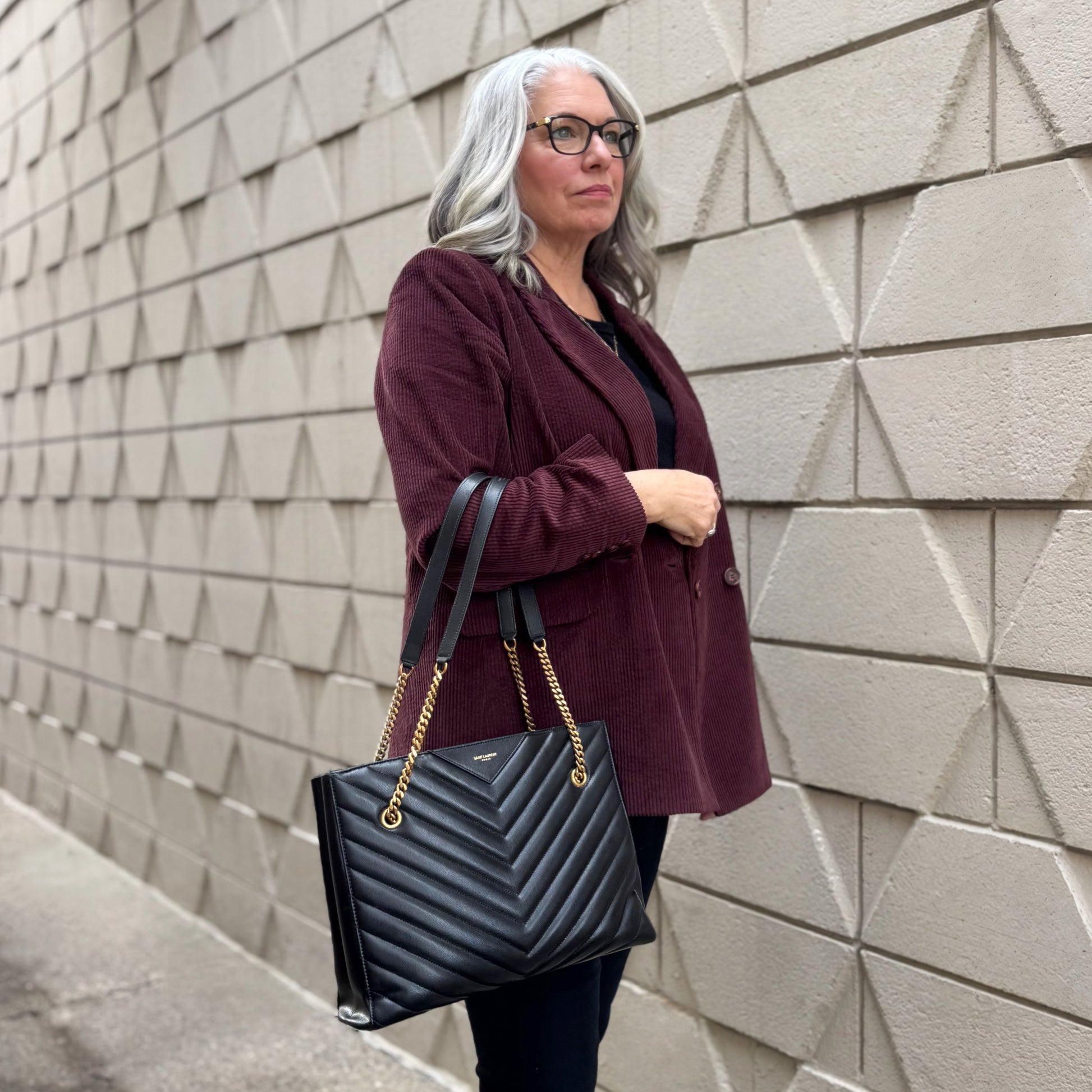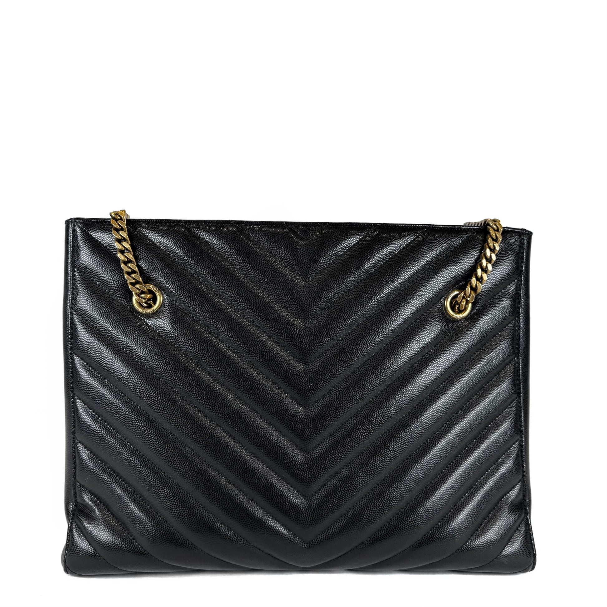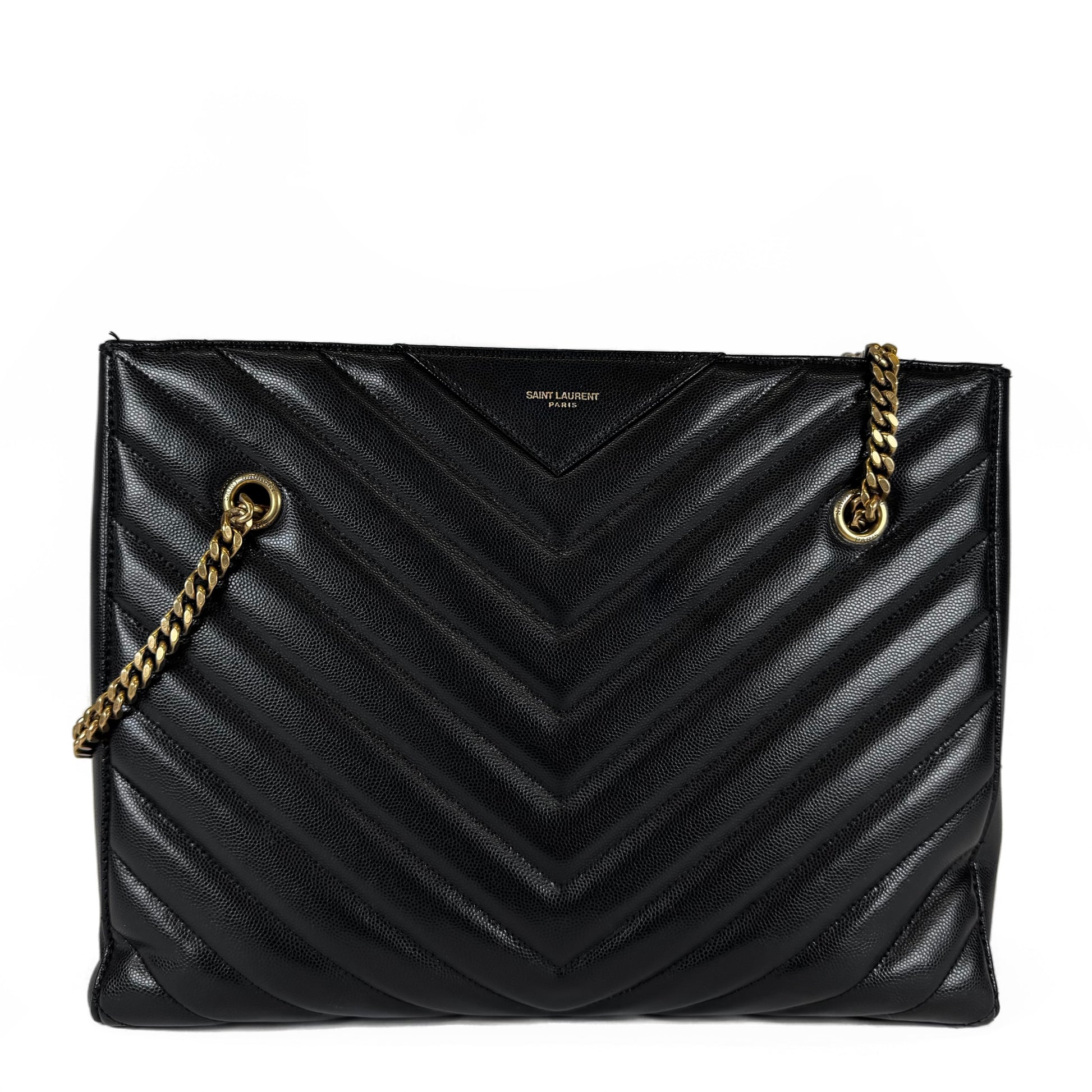 A beauty 🖤 Crafted from chevron quilted grain calfskin leather with aged gold-tone hardware, top zip closure, textile interior and dual chain and leather shoulder straps.