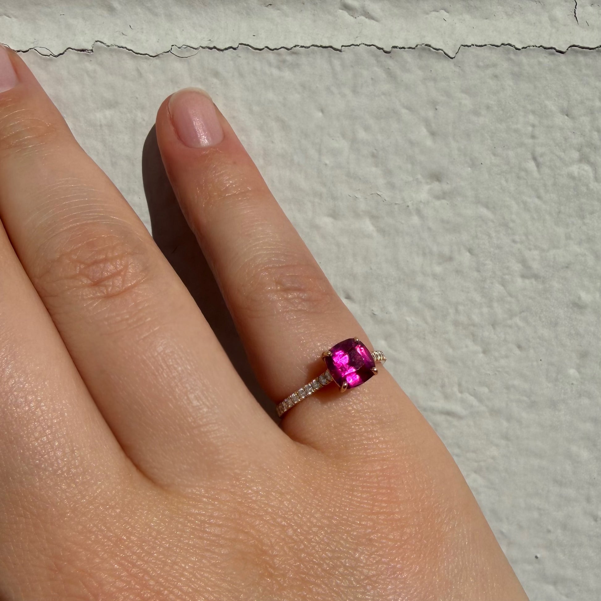 Materials | 18K Rose Gold, 1 x (6.60mm x 6.55mm x 4.6mm) cushion modified brilliant cut Pink Tourmaline, 22 x 0.01ct to 0.015ct (1.3-1.5mm) Round Brilliant Cut Diamonds
