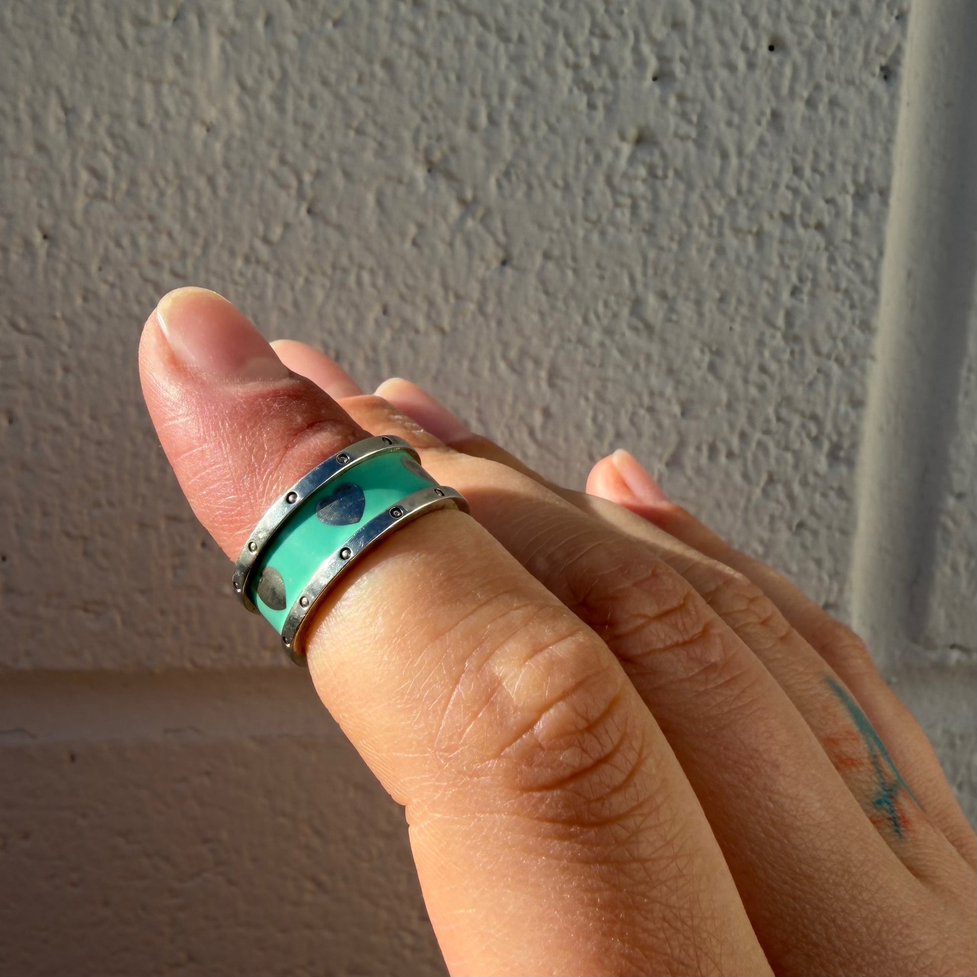 Wide band ring with blue enamel centre, silver heart motifs and silver dot detailing along the edges.