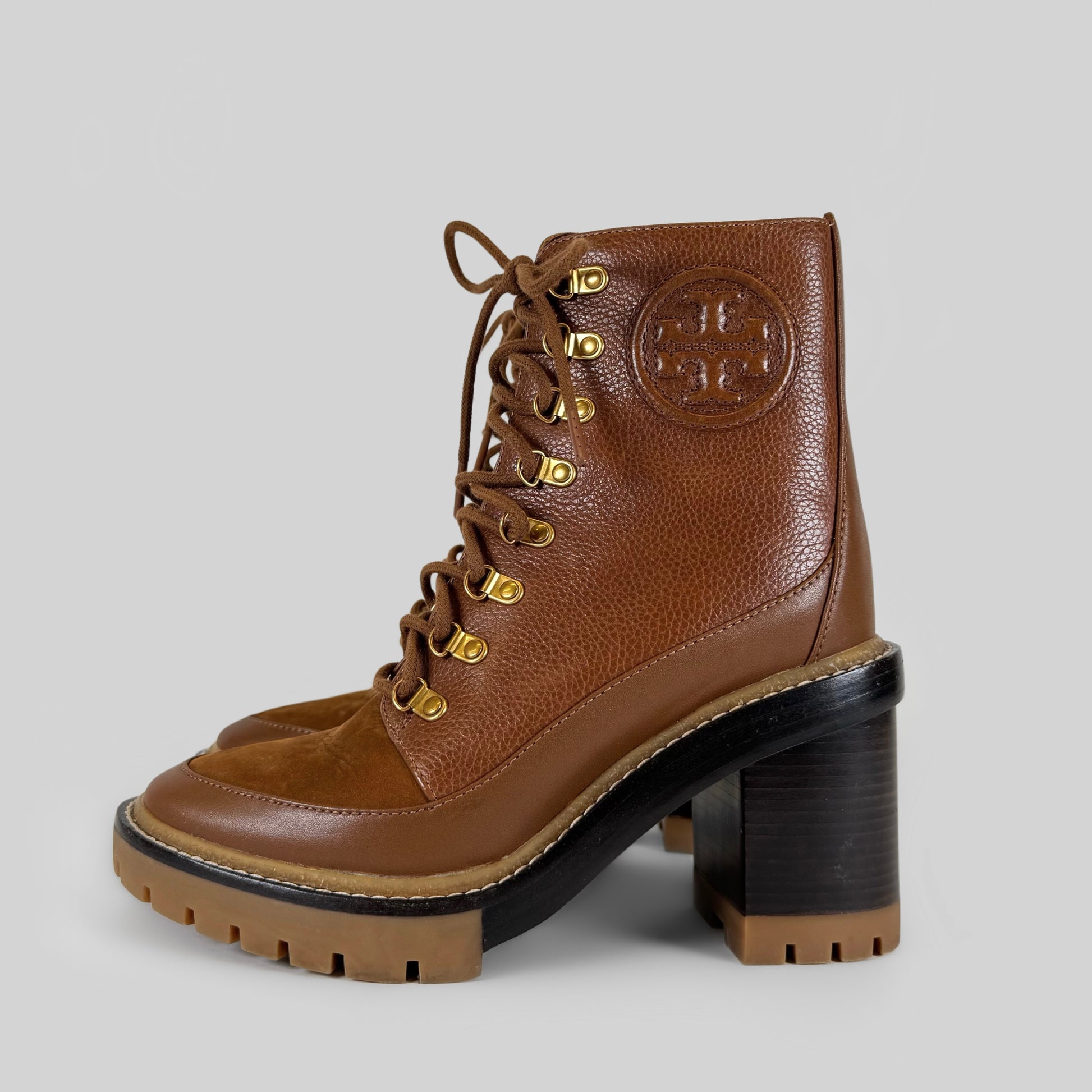 Cuties! Crafted from calfskin leather and suede with gold-tone hardware, embossed double T logo, lace-up front, chunky block heel and rubber sole.
