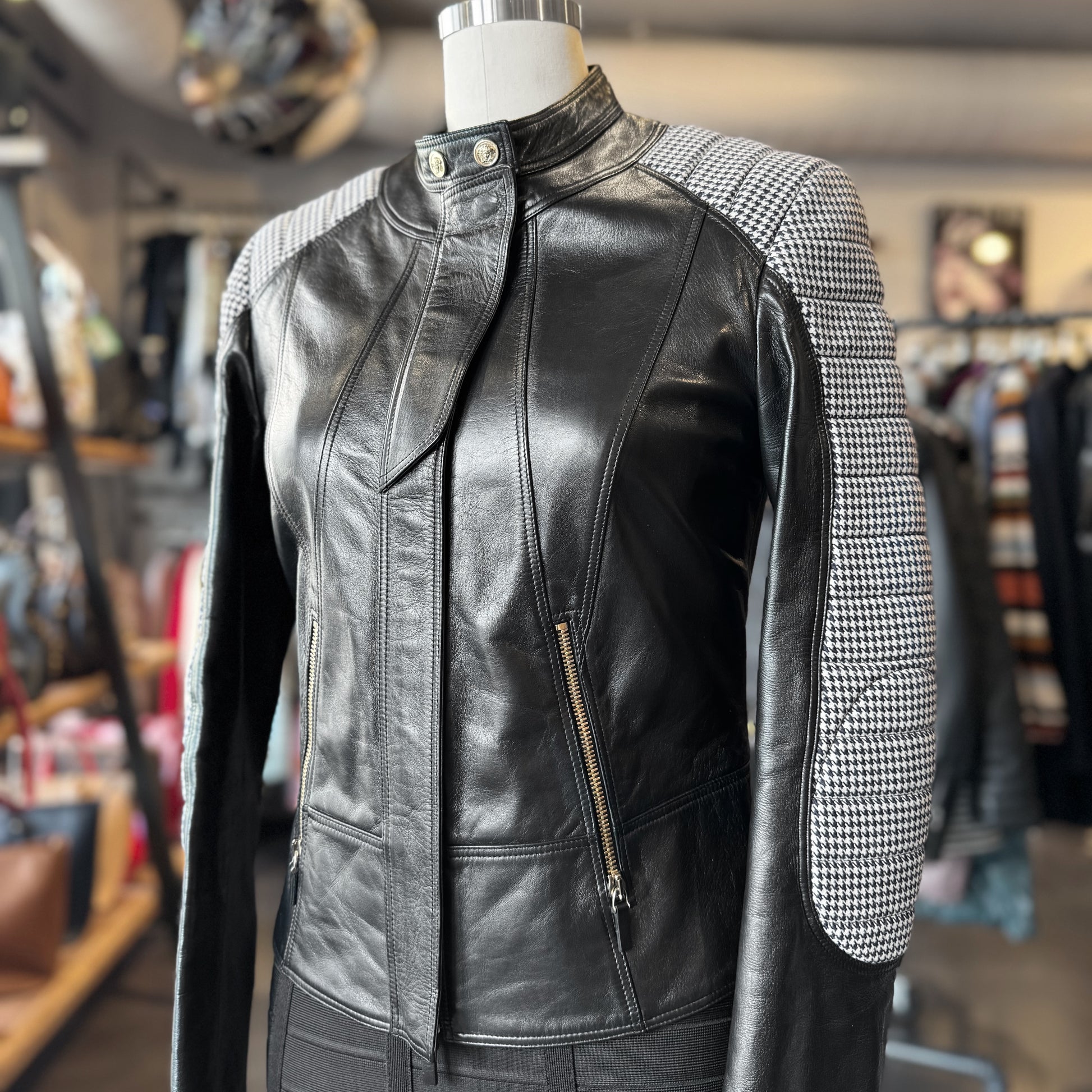 Tons of leathers instore! Crafted from leather with contrasting houndstooth panels on the shoulders and sleeves, snap-button stand collar, front zip closure, and zippered side pockets.
